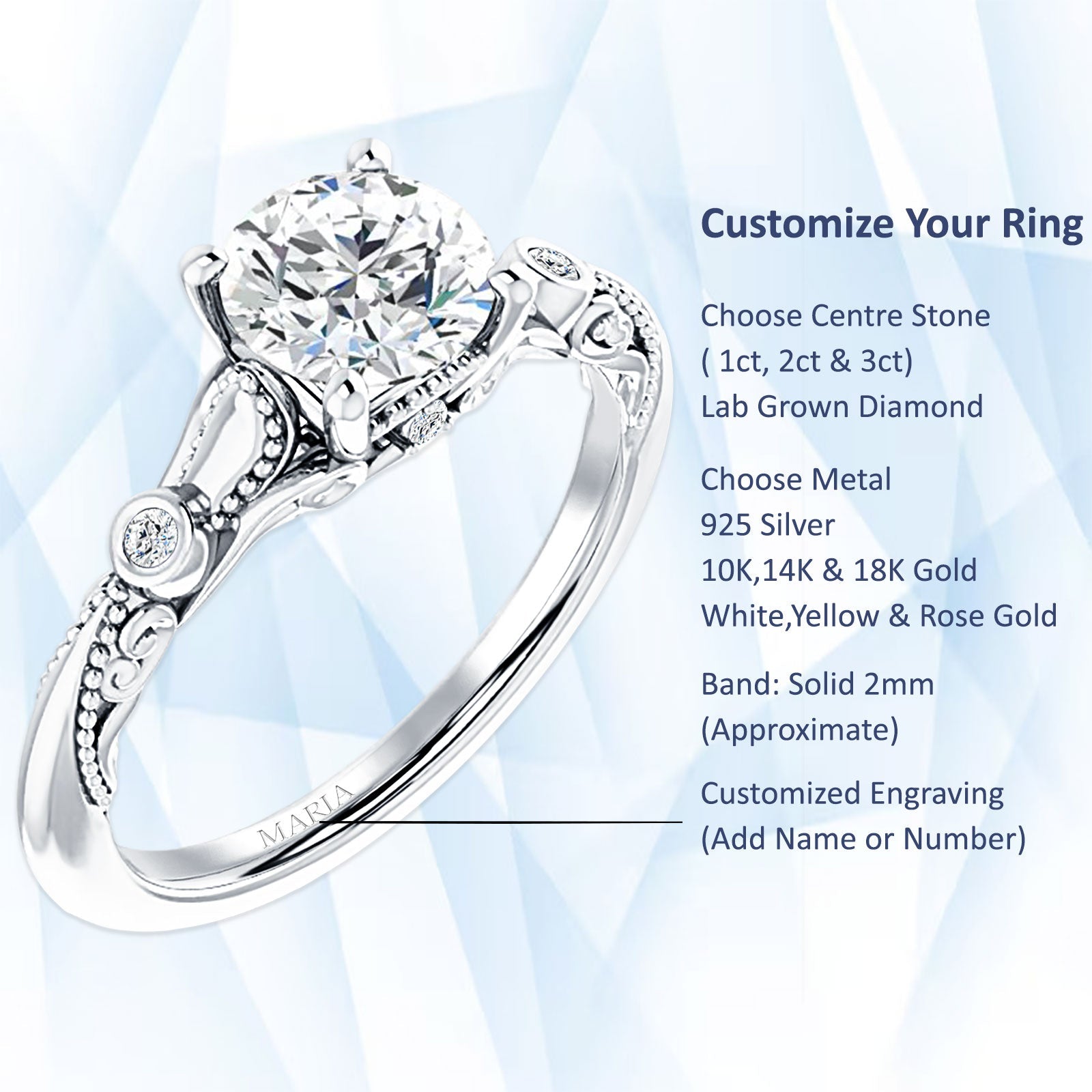 This lab grown diamond ring is available in three different carat weights and also comes in a choice of various metal types.(Tarnish Resistant Sterling Silver, 10K Gold & 18K Gold)