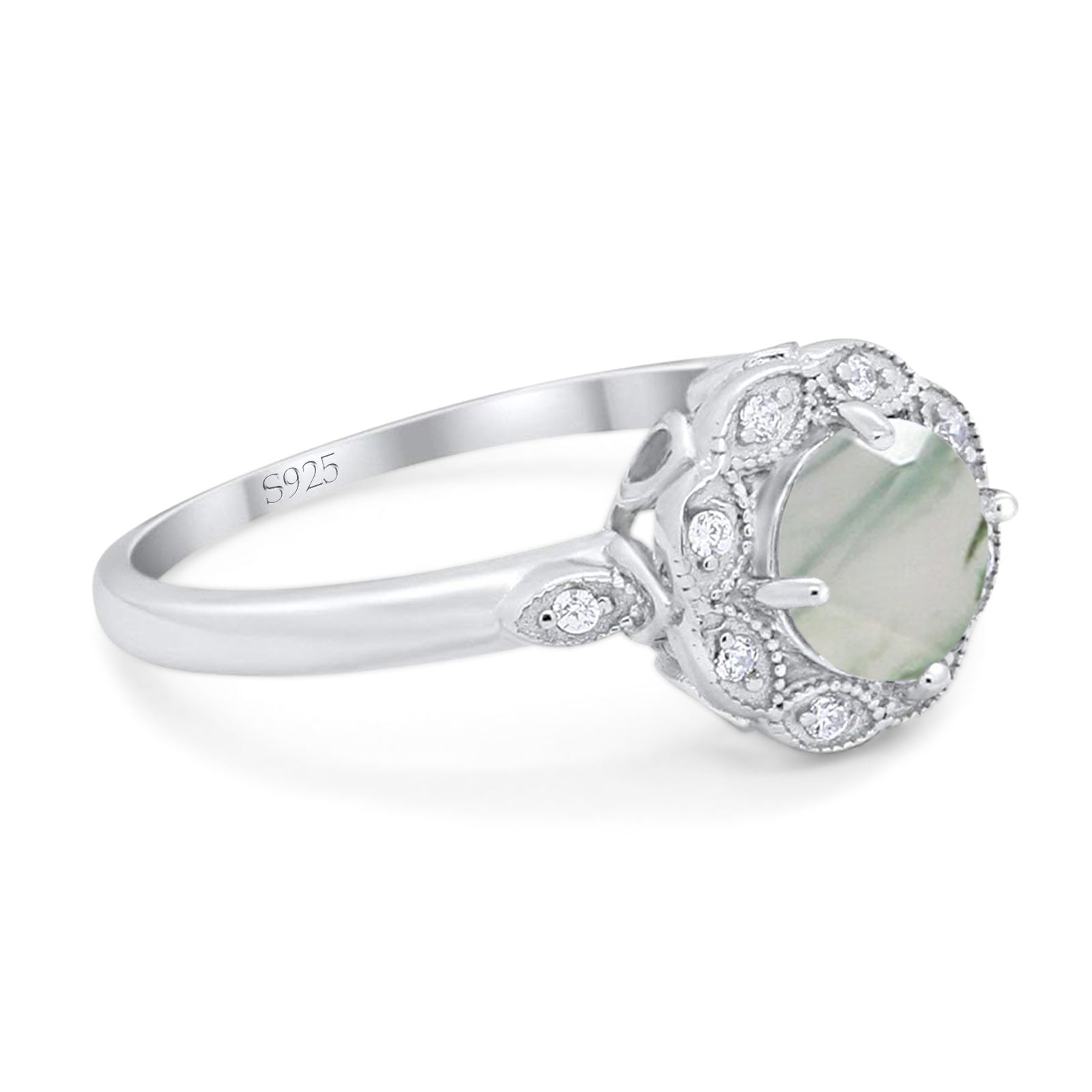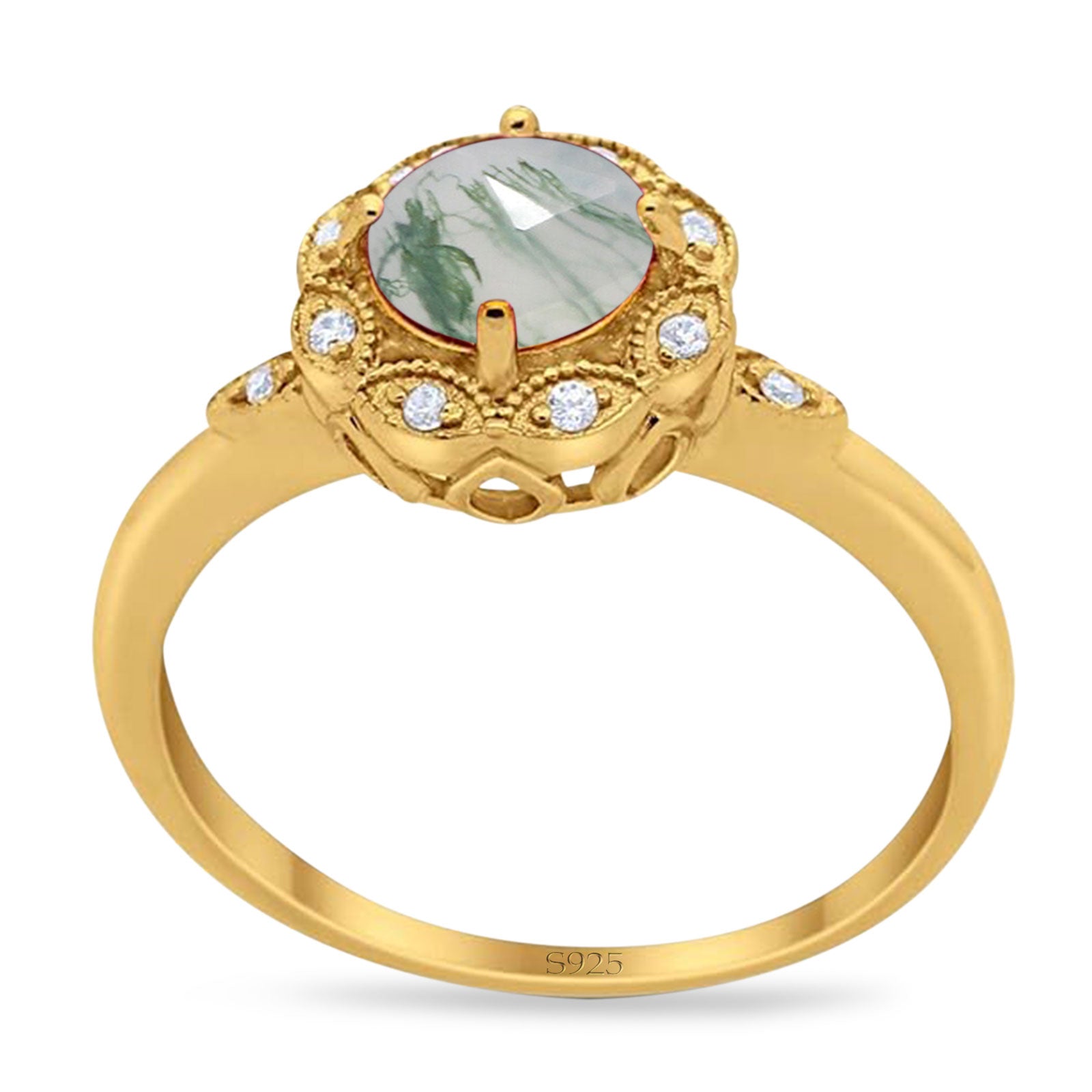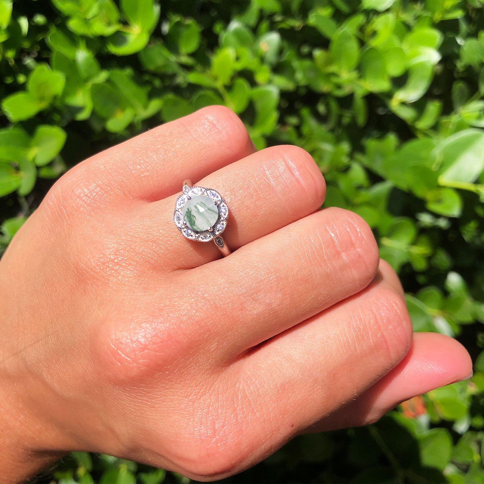 Art Deco Ring Round Natural Green Moss Agate Flower Ring 925 Sterling Silver