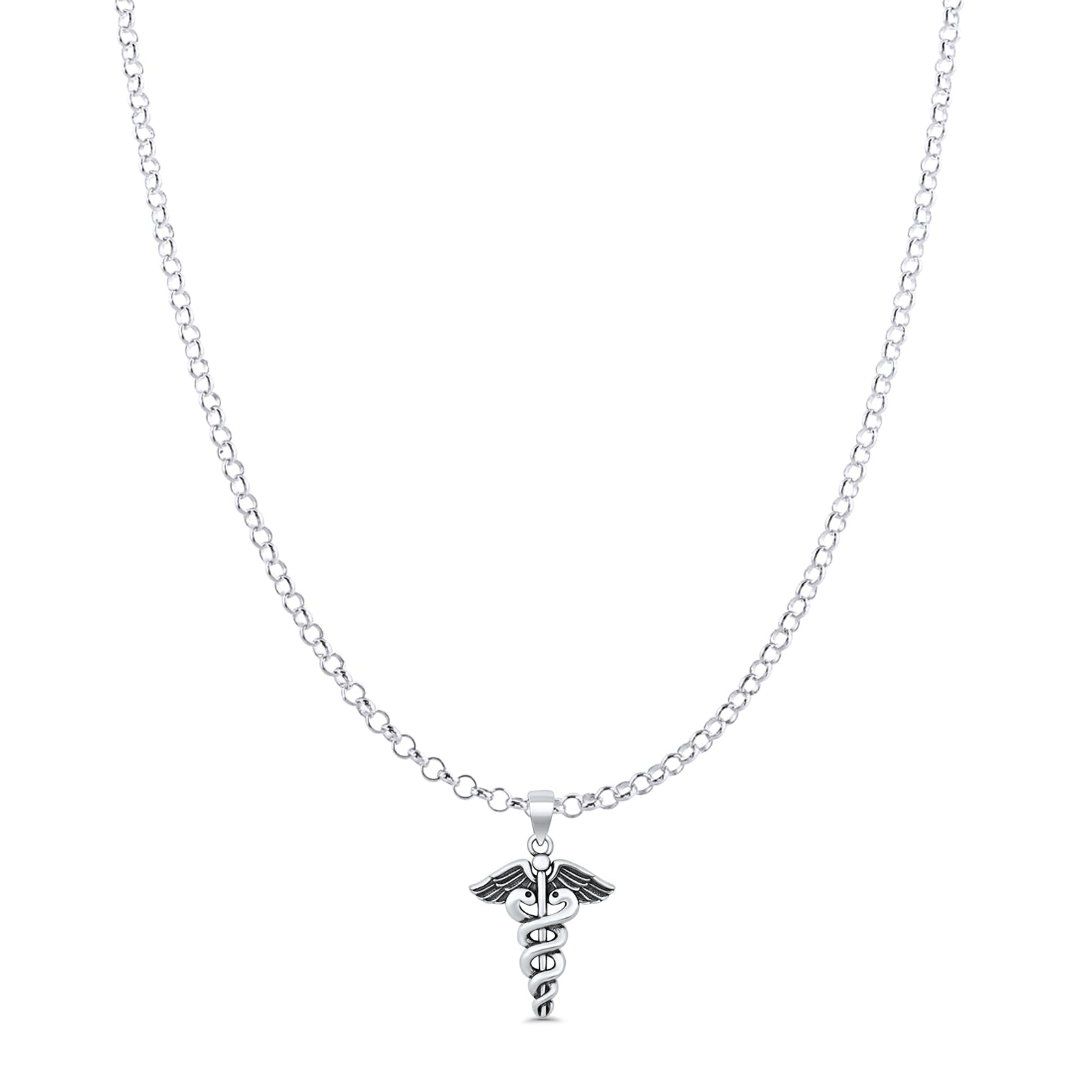 Caduceus Pendant Rolo Chain Necklace Oxidized 925 Sterling Silver