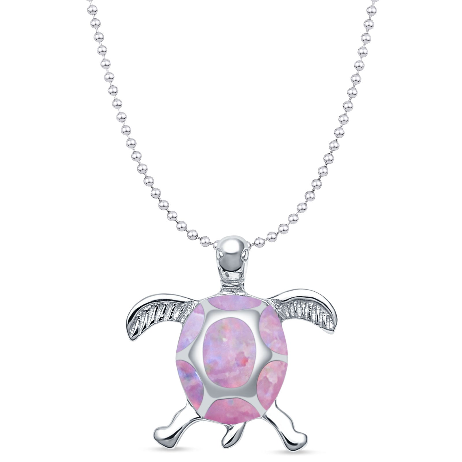 Lab Created Pink Opal Turtle Pendant Bead Chain Necklace 925 Sterling Silver