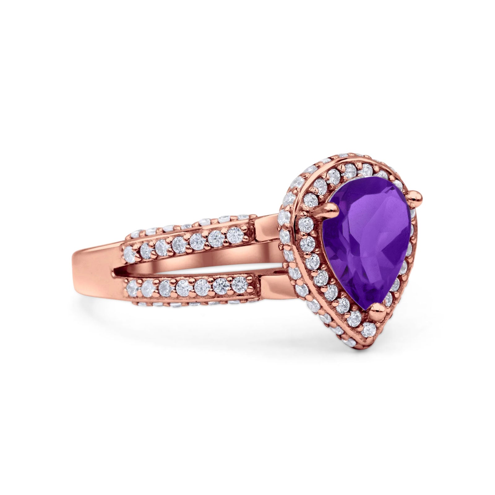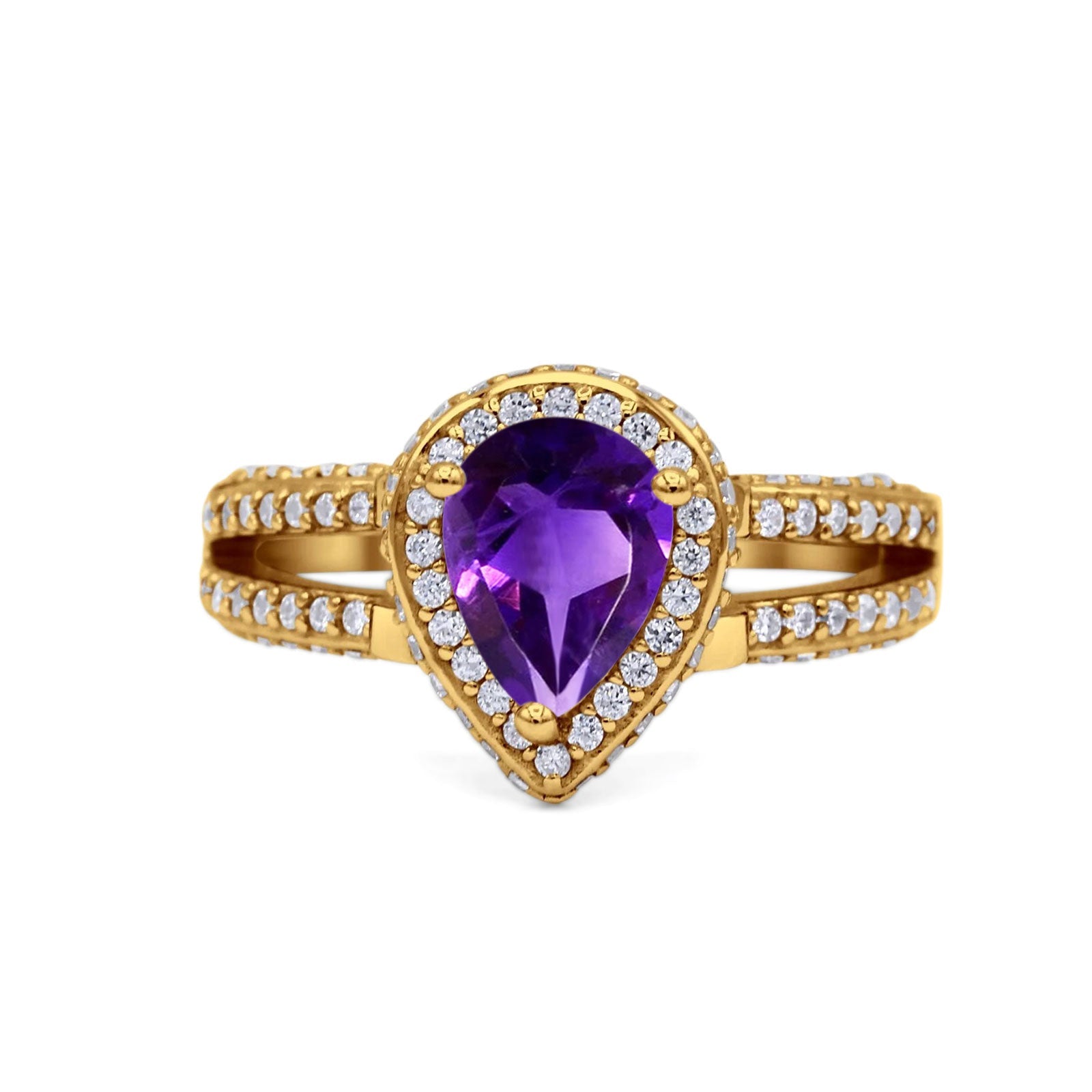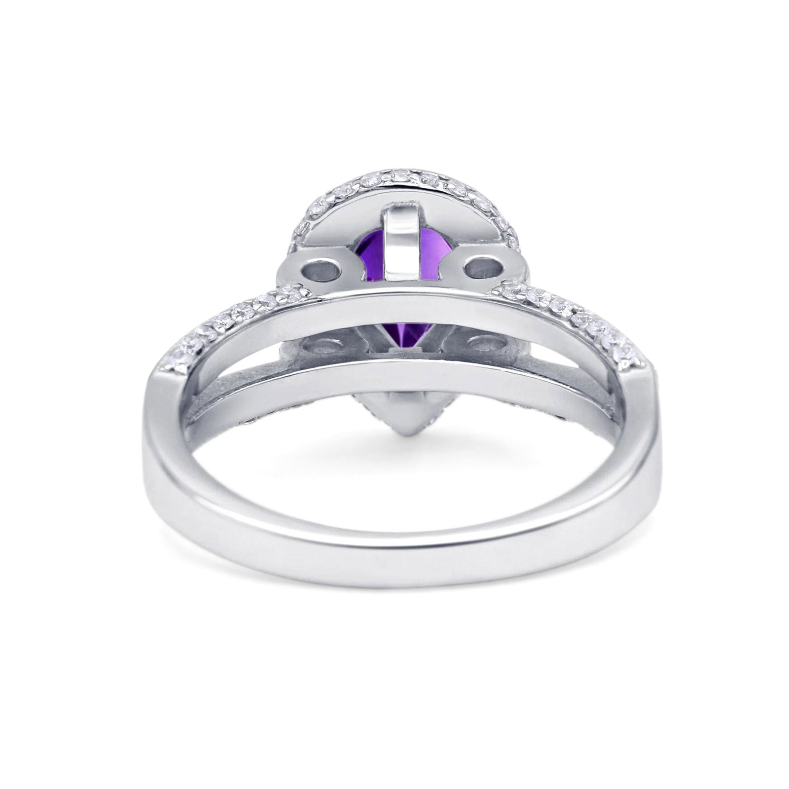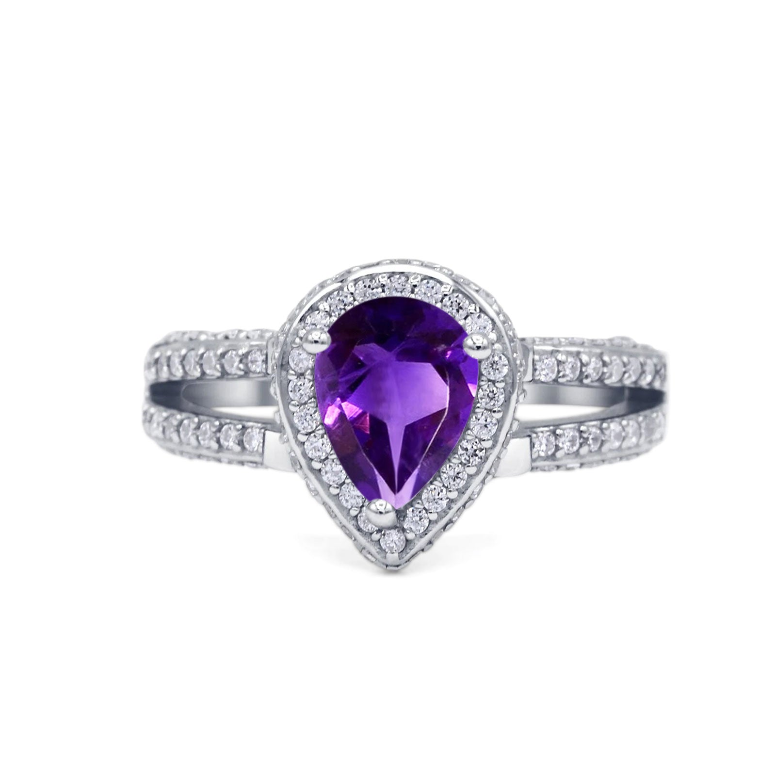 Pear Teardrop Natural Amethyst Halo Split Shank Ring 925 Sterling Silver