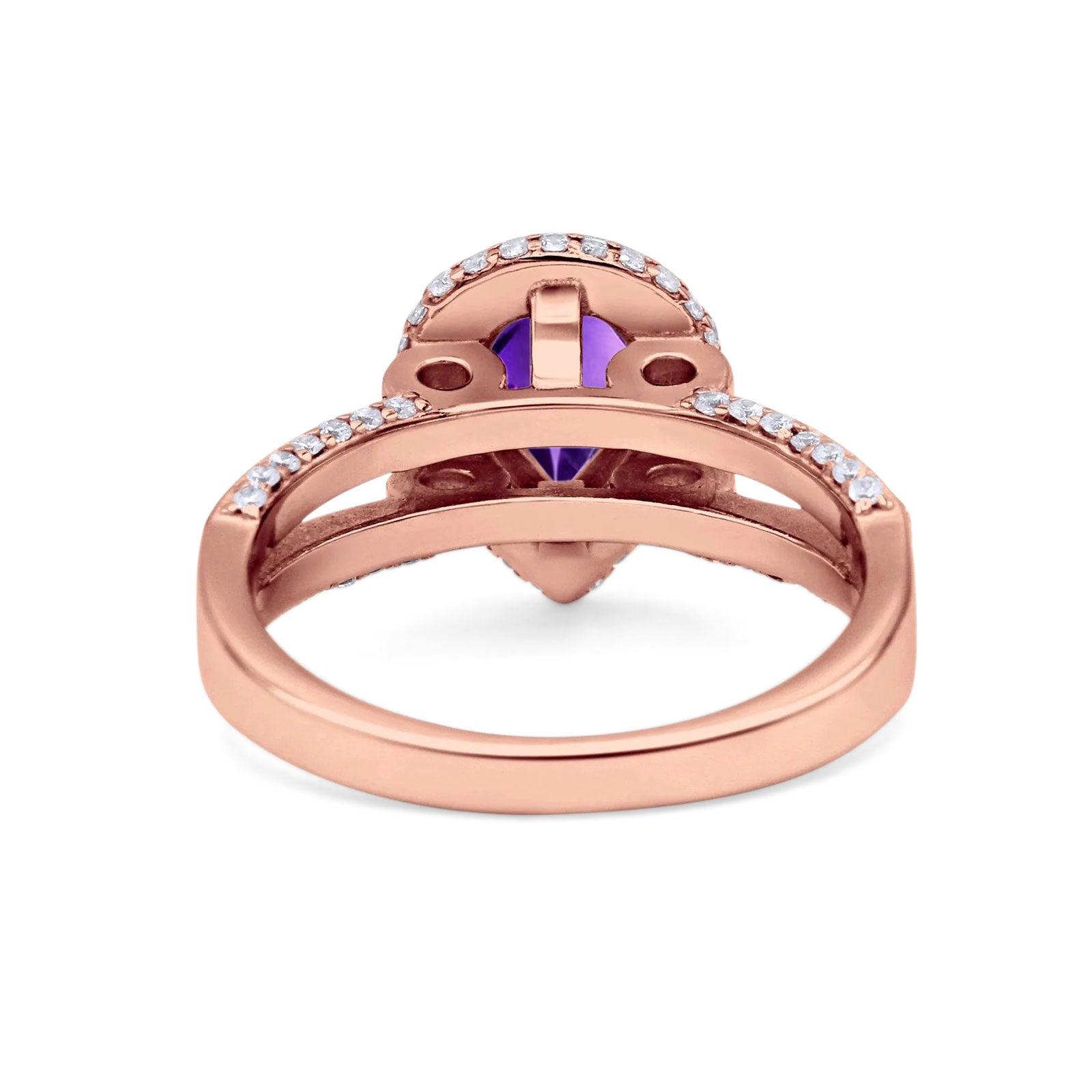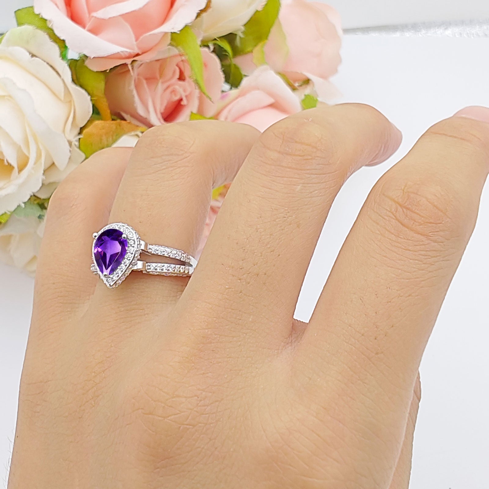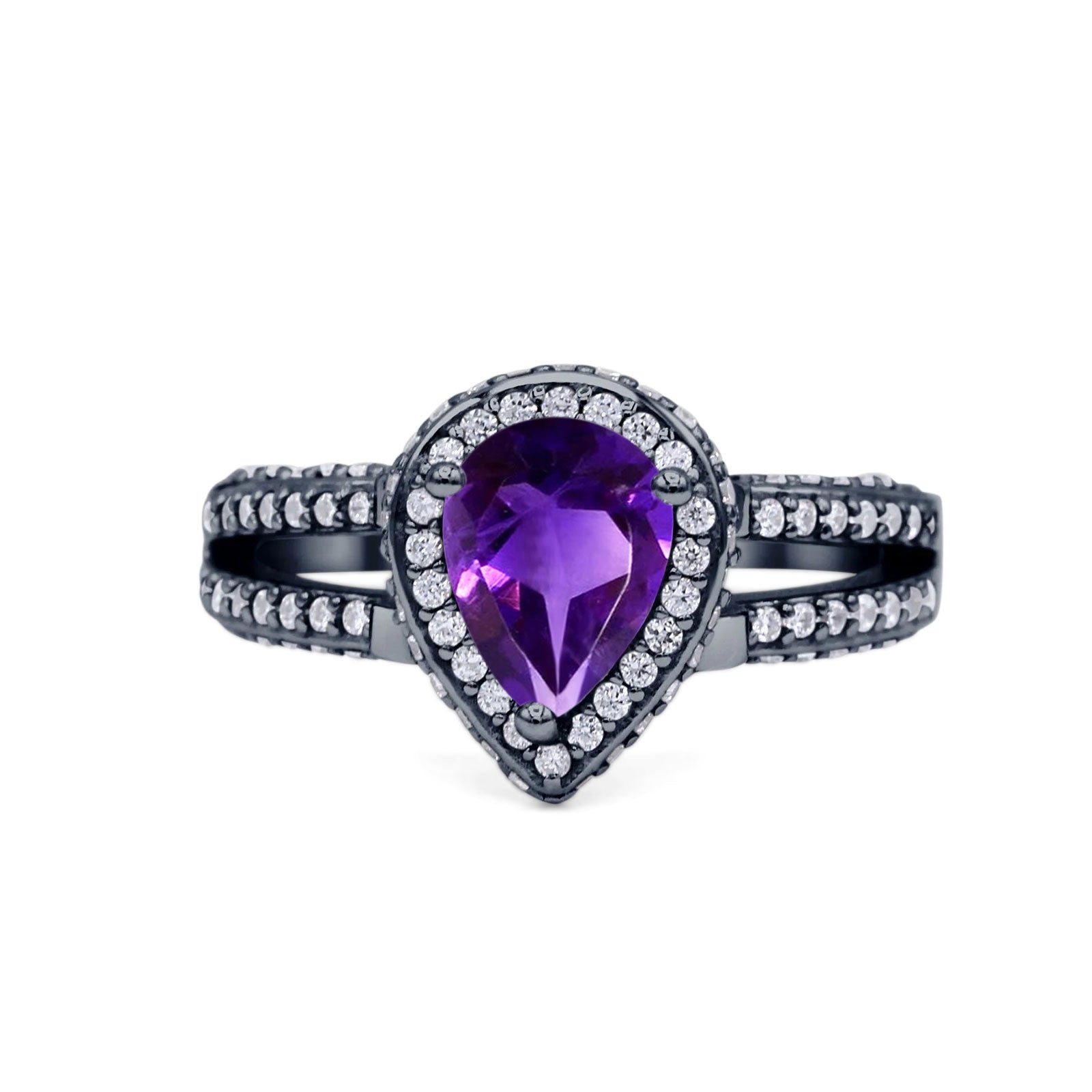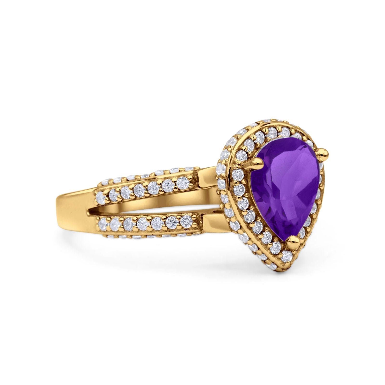 Pear Teardrop Natural Amethyst Halo Split Shank Ring 925 Sterling Silver