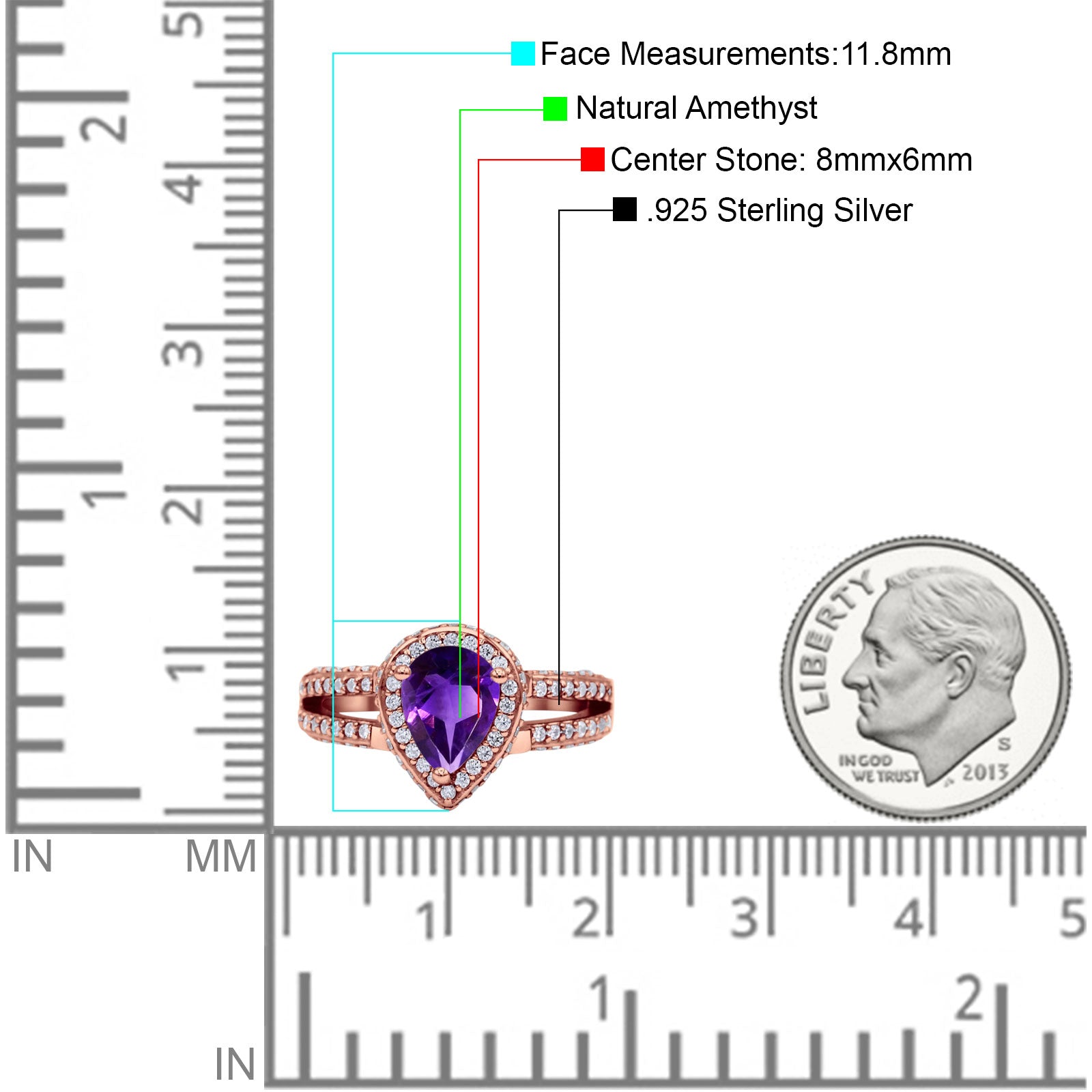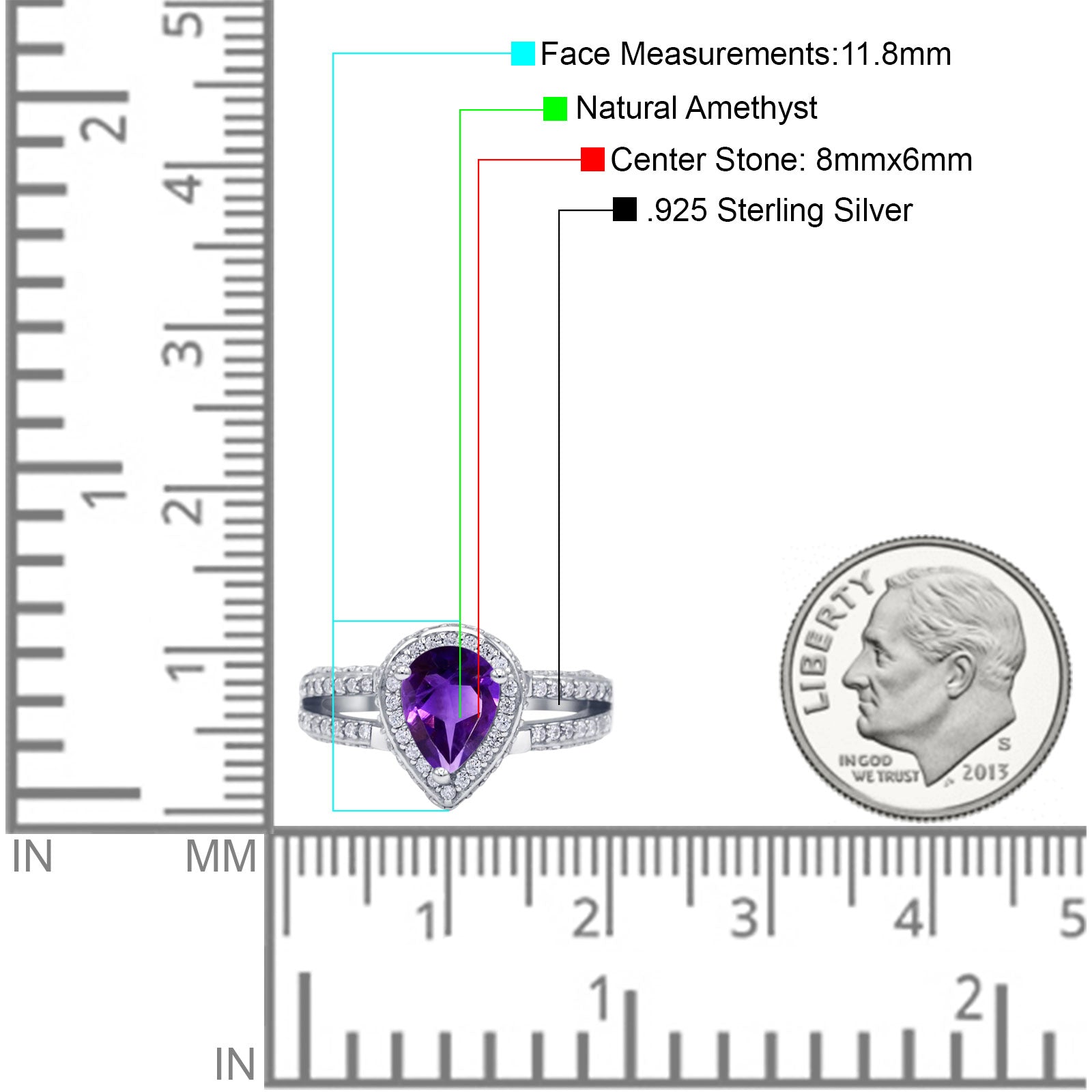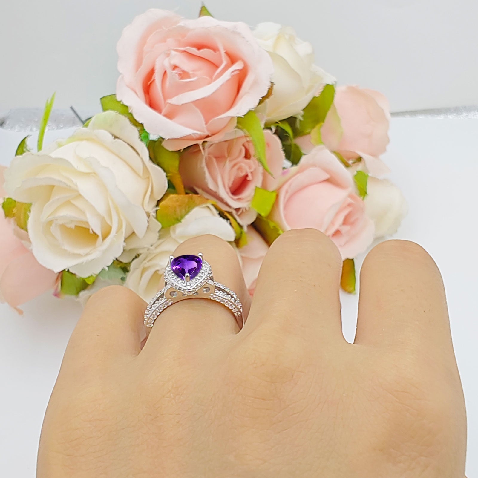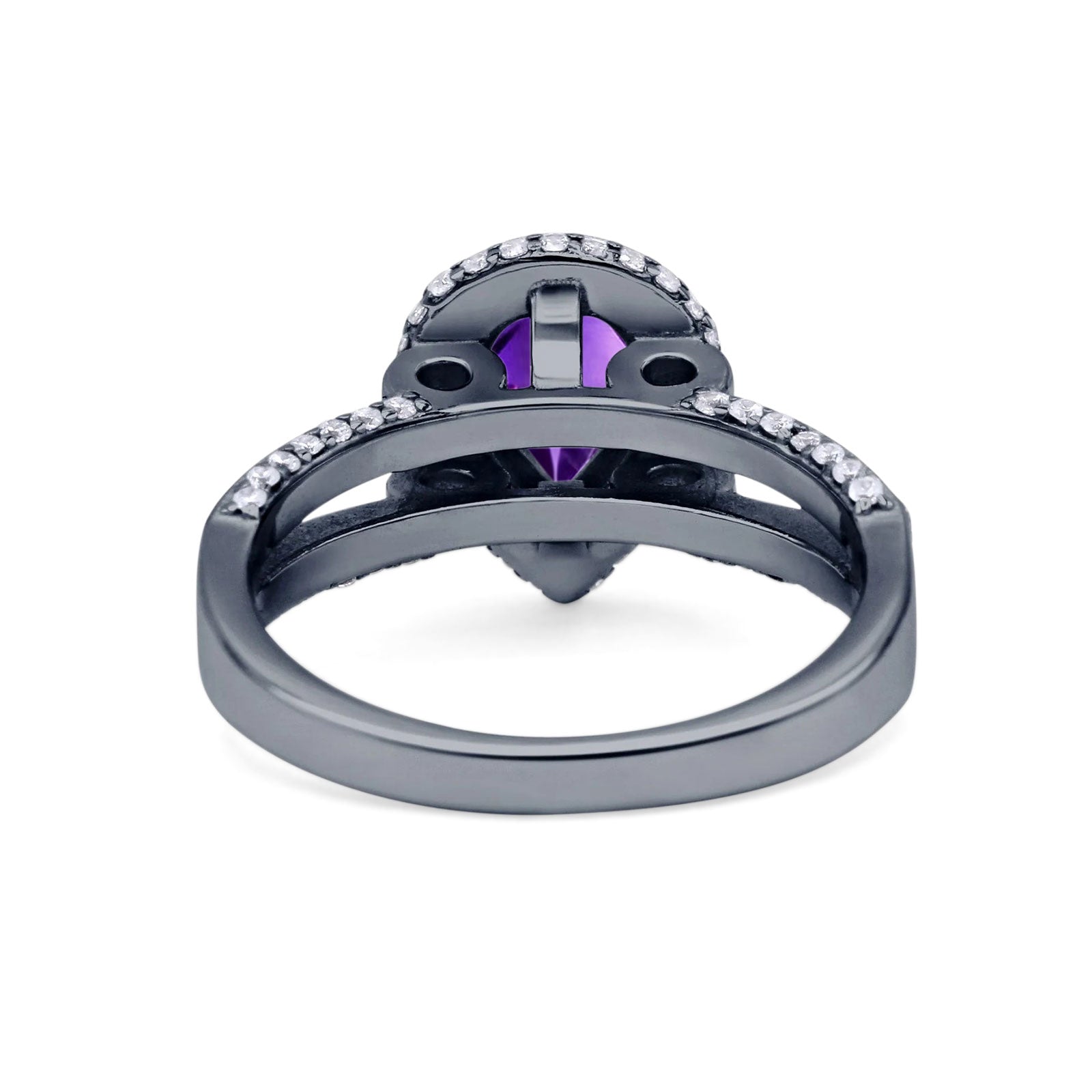 Pear Teardrop Natural Amethyst Halo Split Shank Ring 925 Sterling Silver