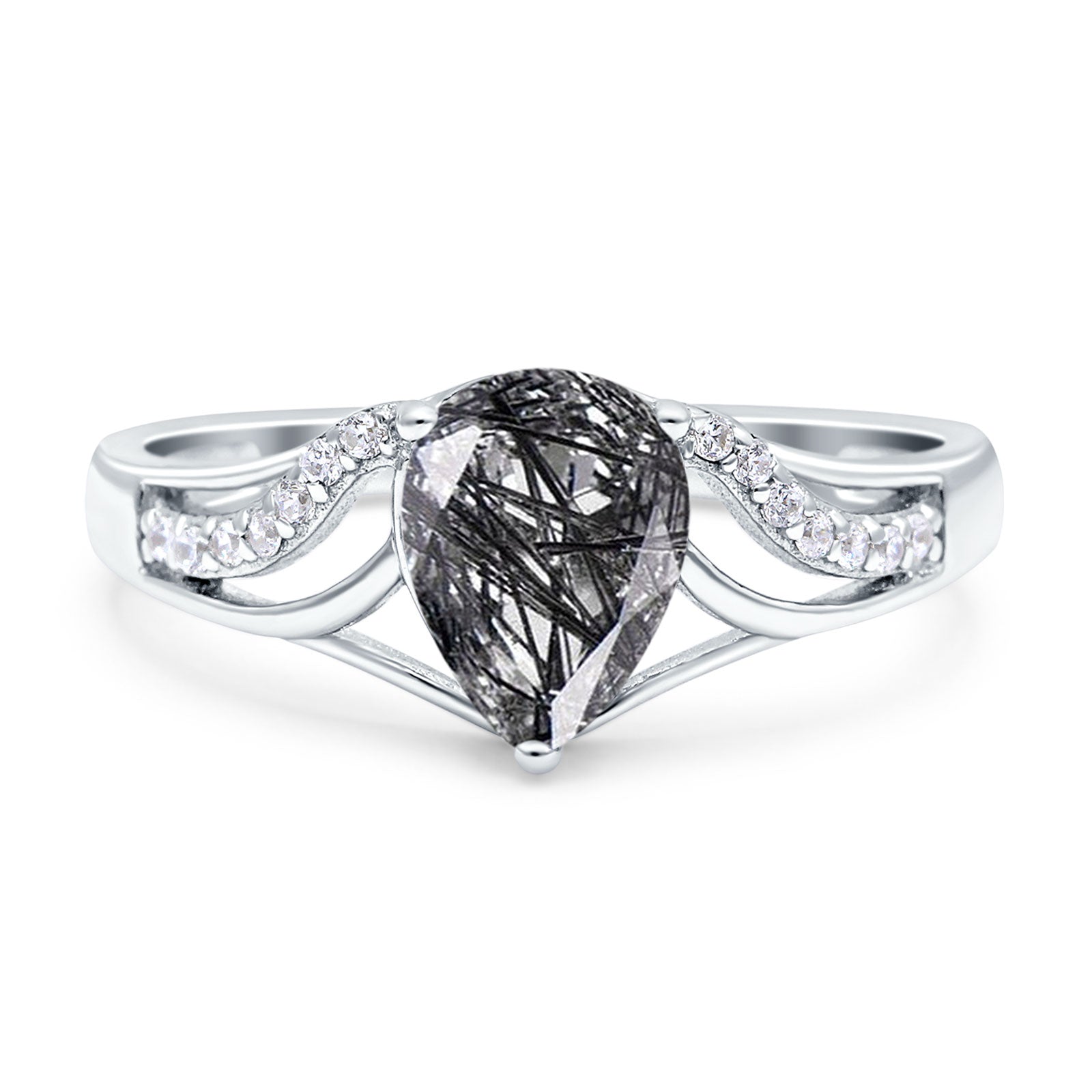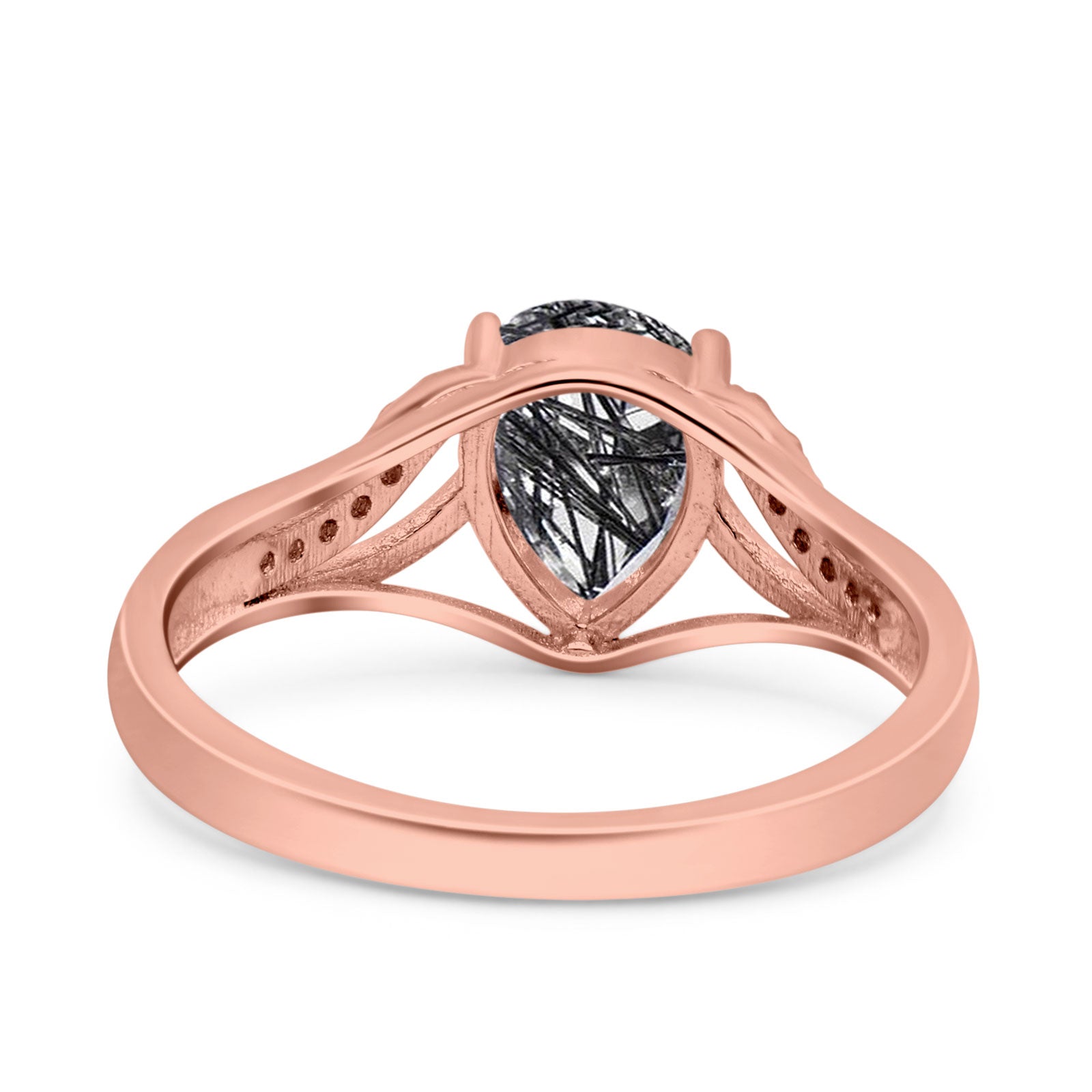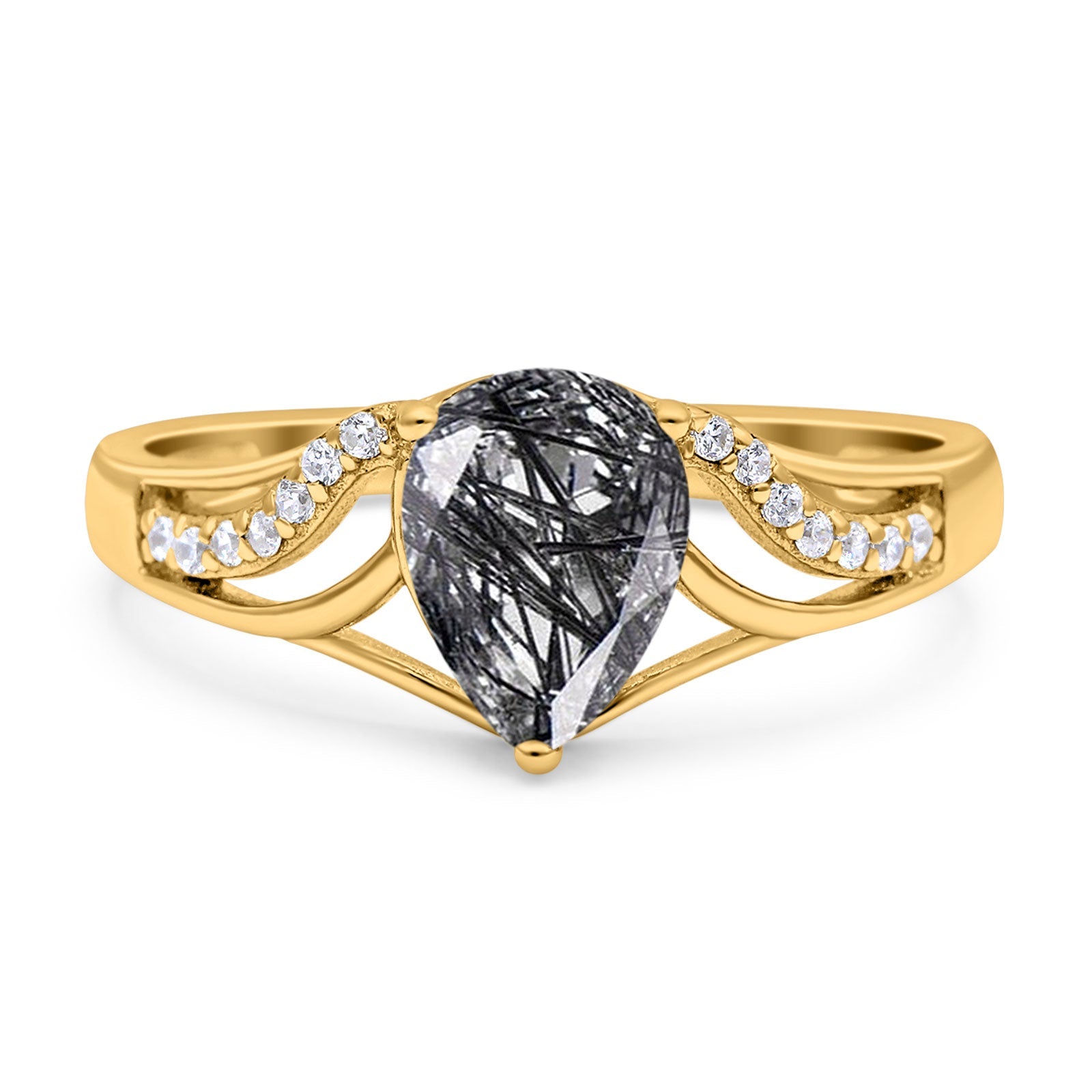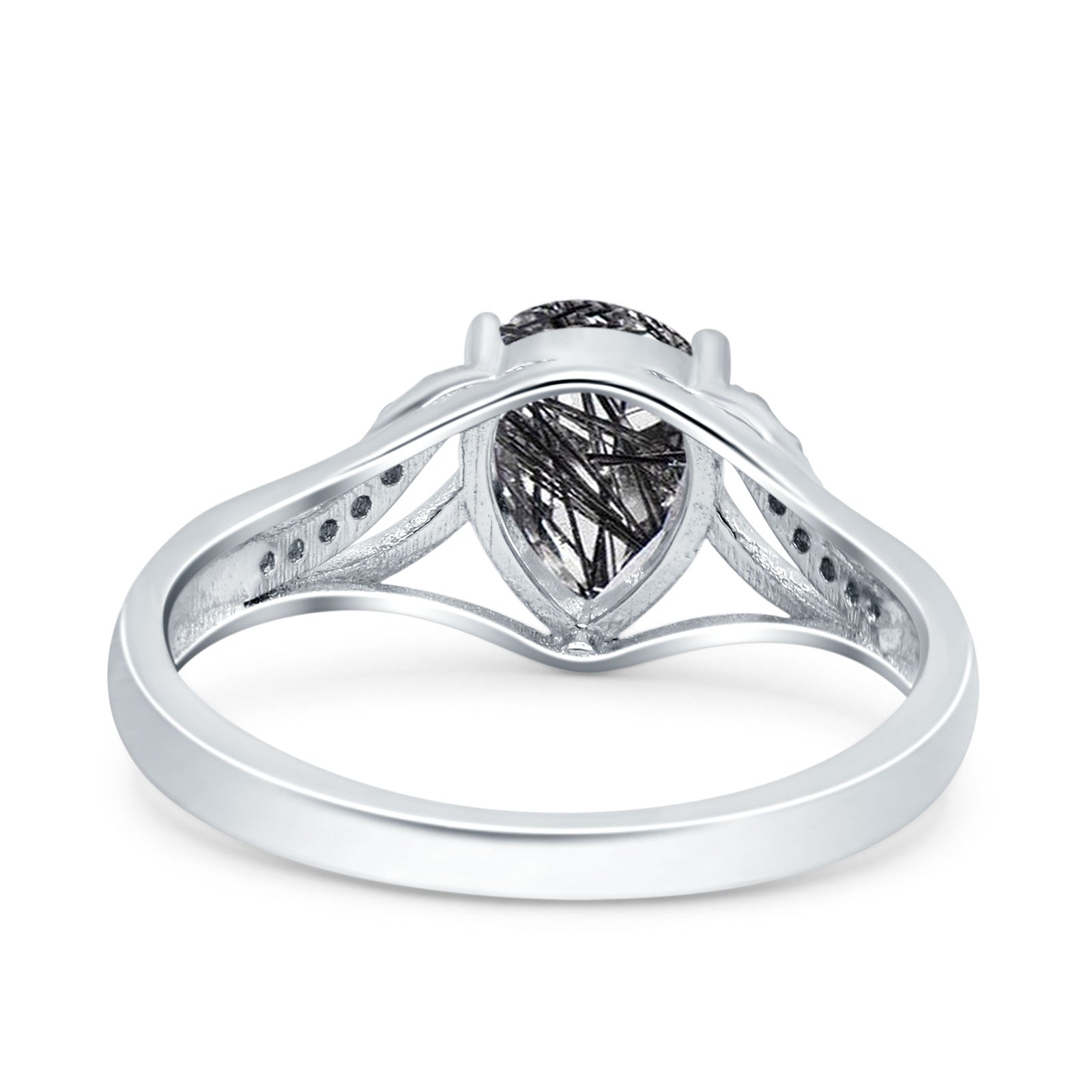 Pear Teardrop Natural Rutilated Quartz Art Deco Ring 925 Sterling Silver
