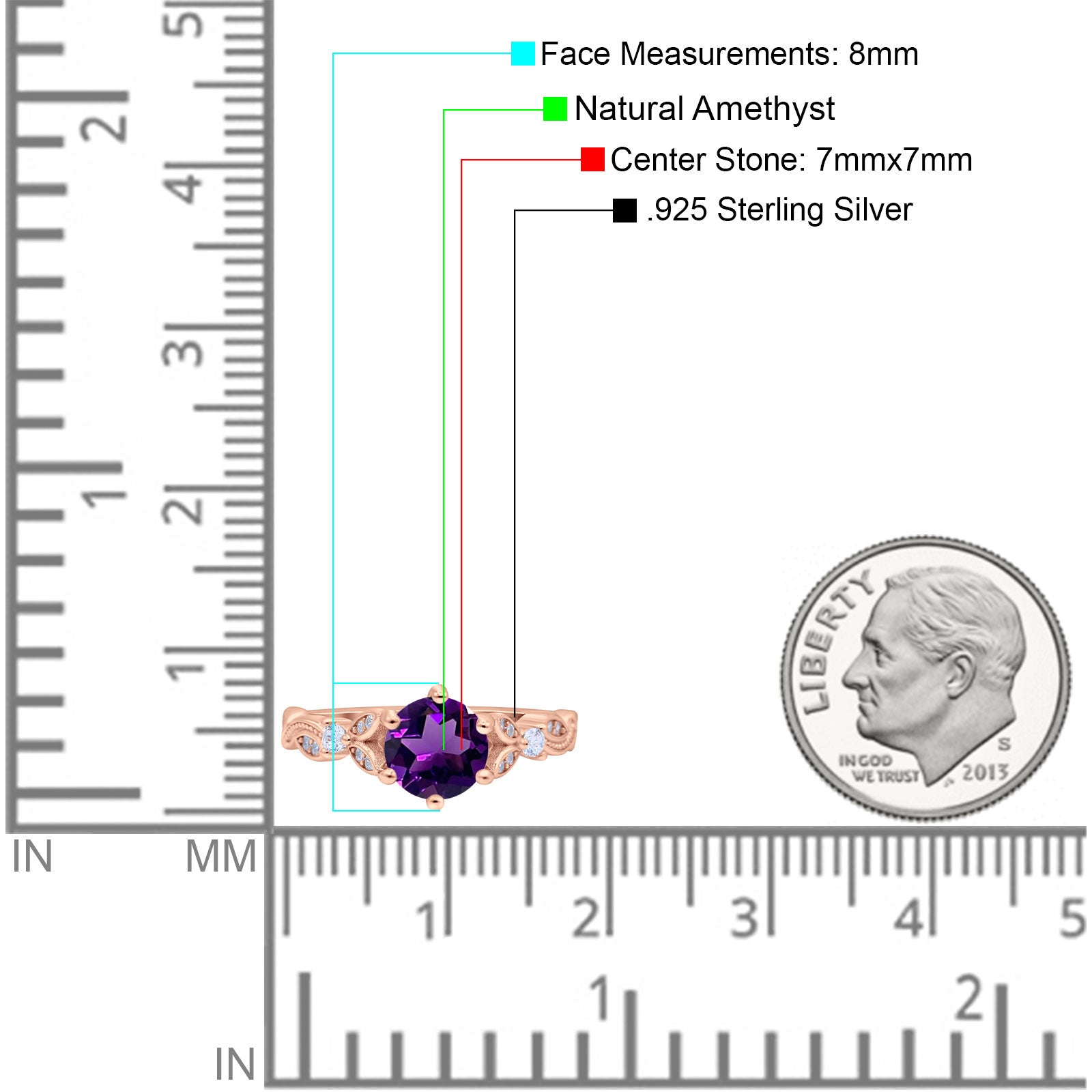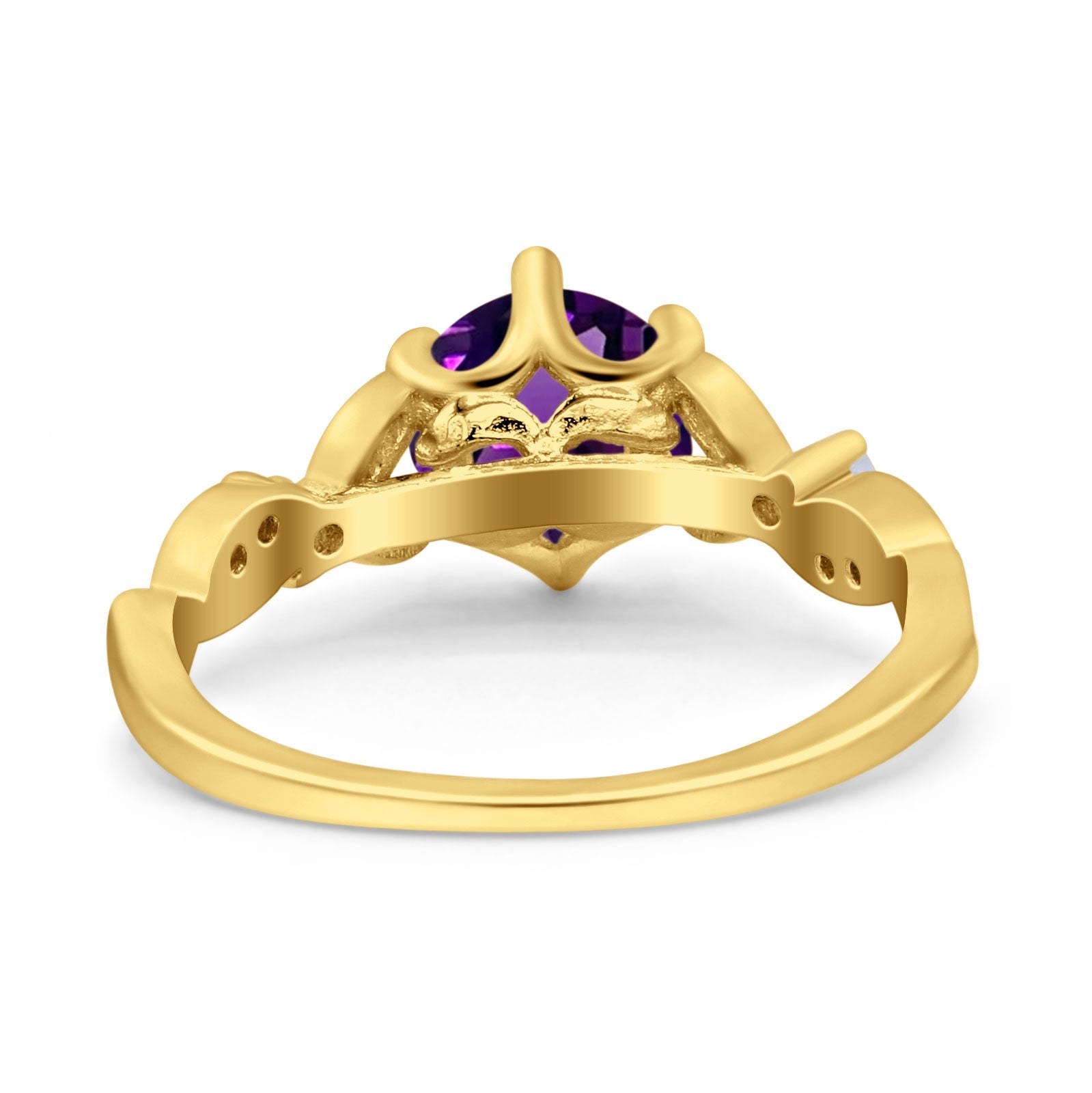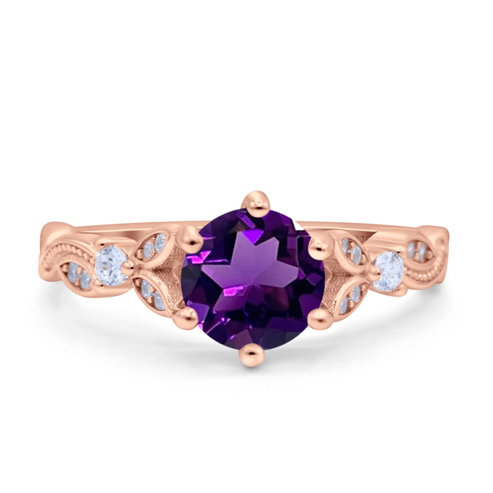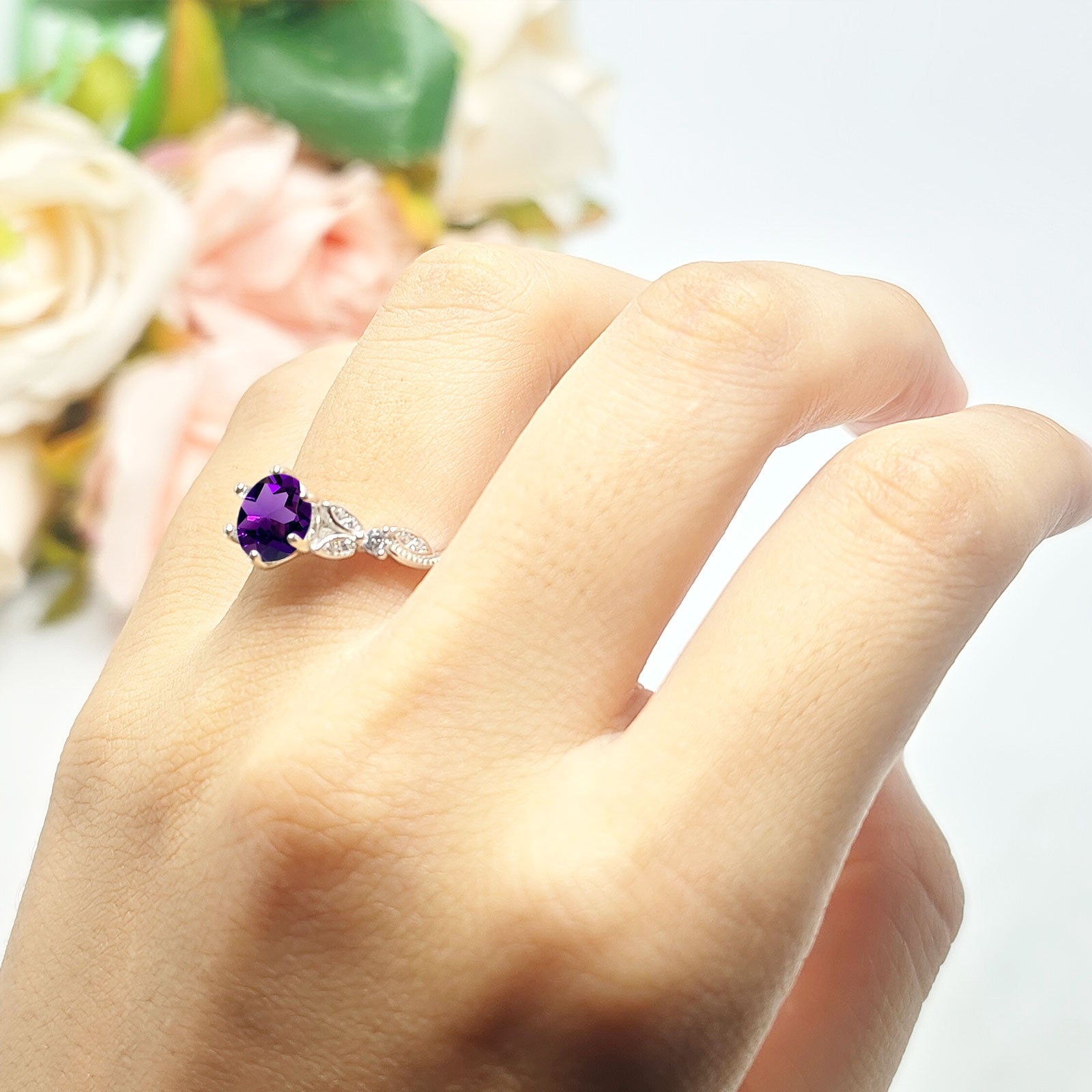 Round Natural Amethyst Leaf Vintage Style Ring 925 Sterling Silver
