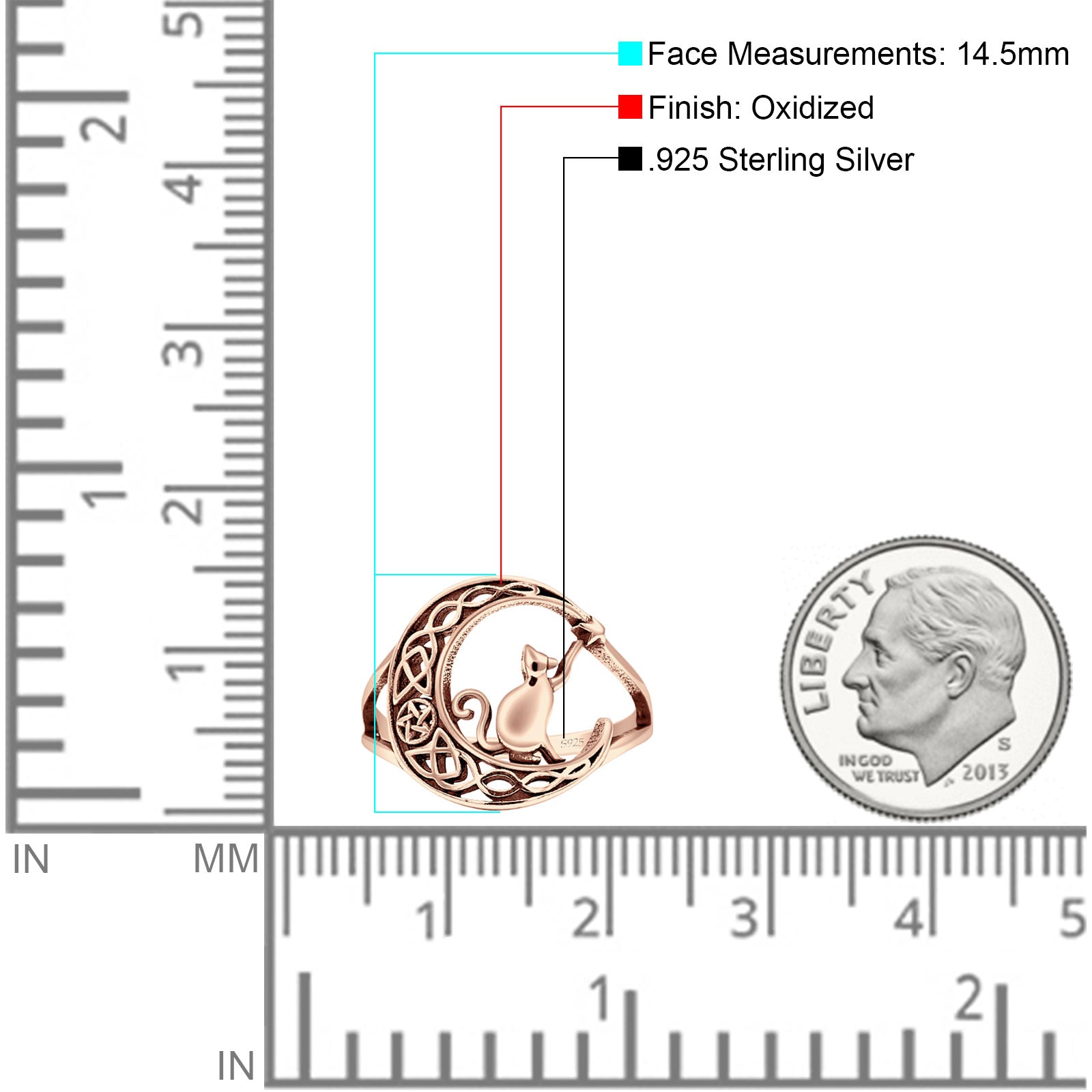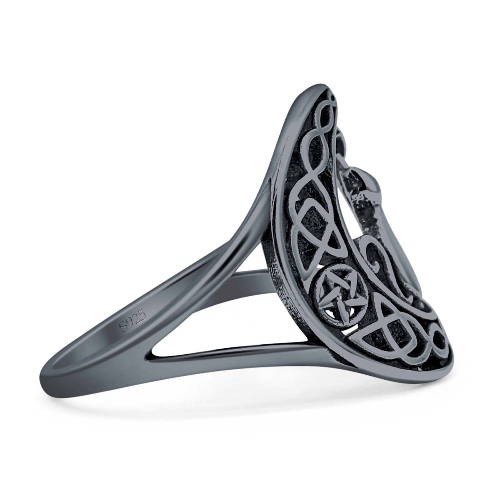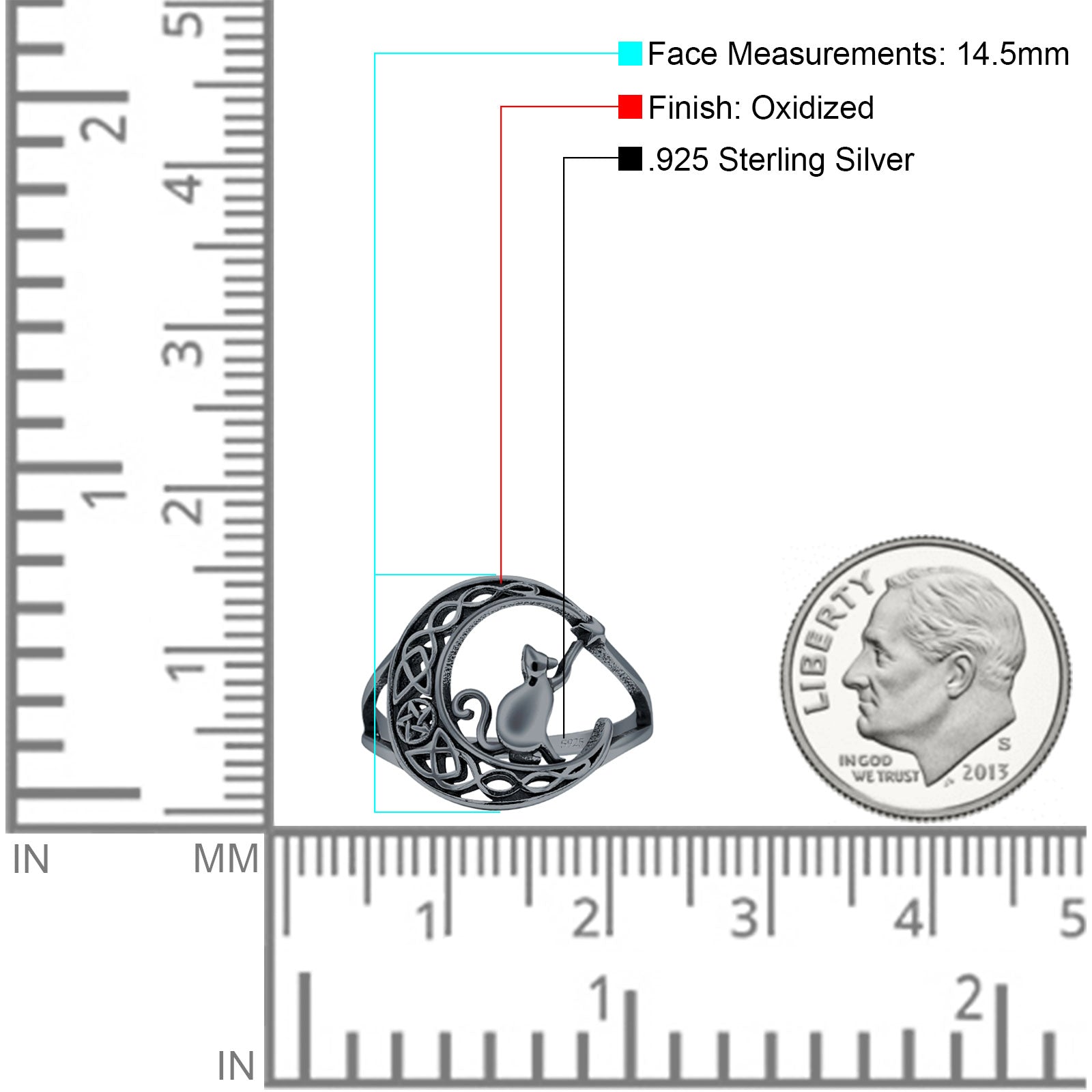 Split Shank 14.5mm Cat On Moon Ring Oxidized 925 Sterling Silver