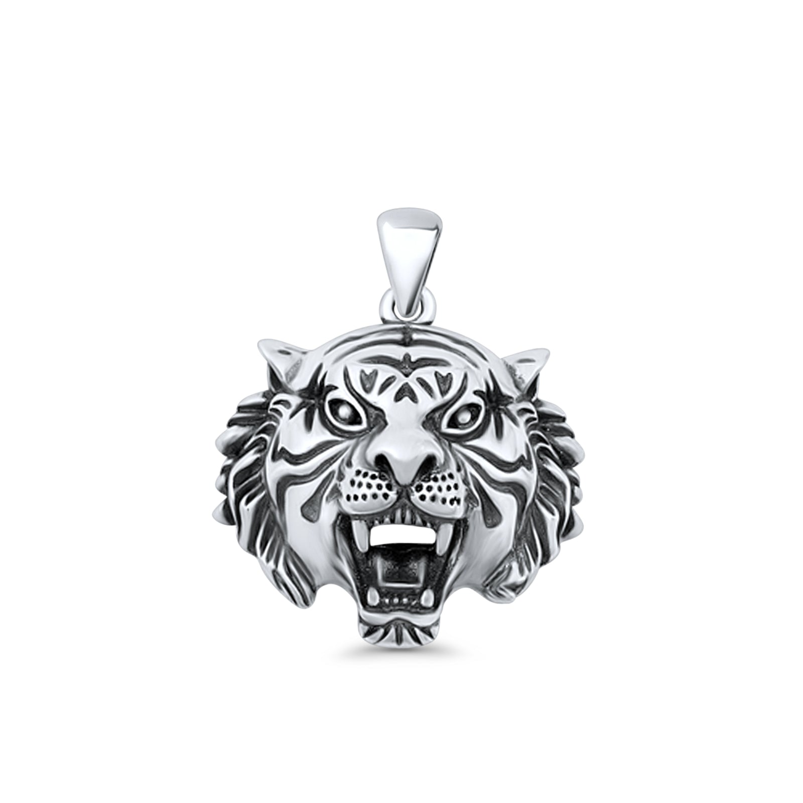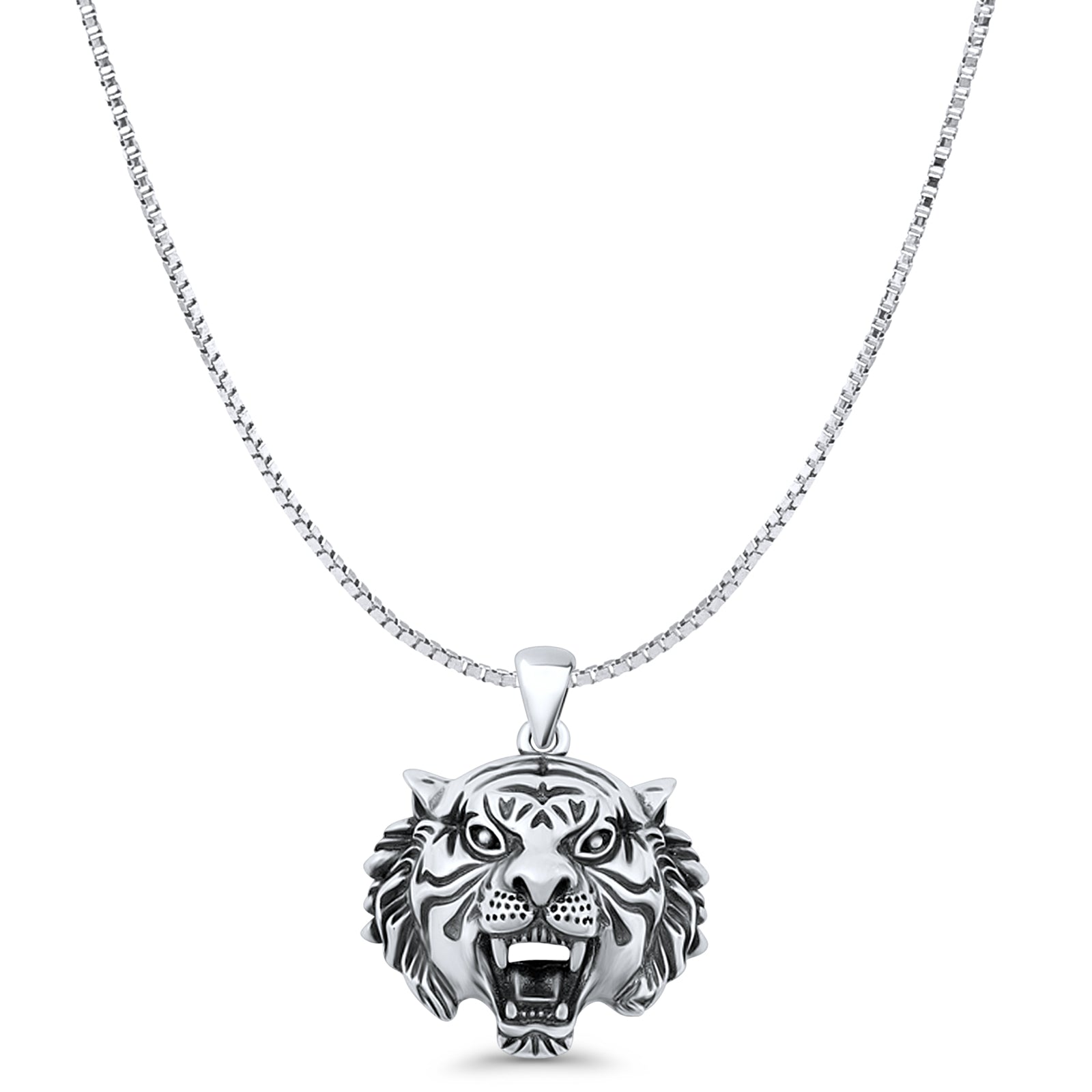 Tiger Head Pendant Box Chain Necklace Oxidized 925 Sterling Silver