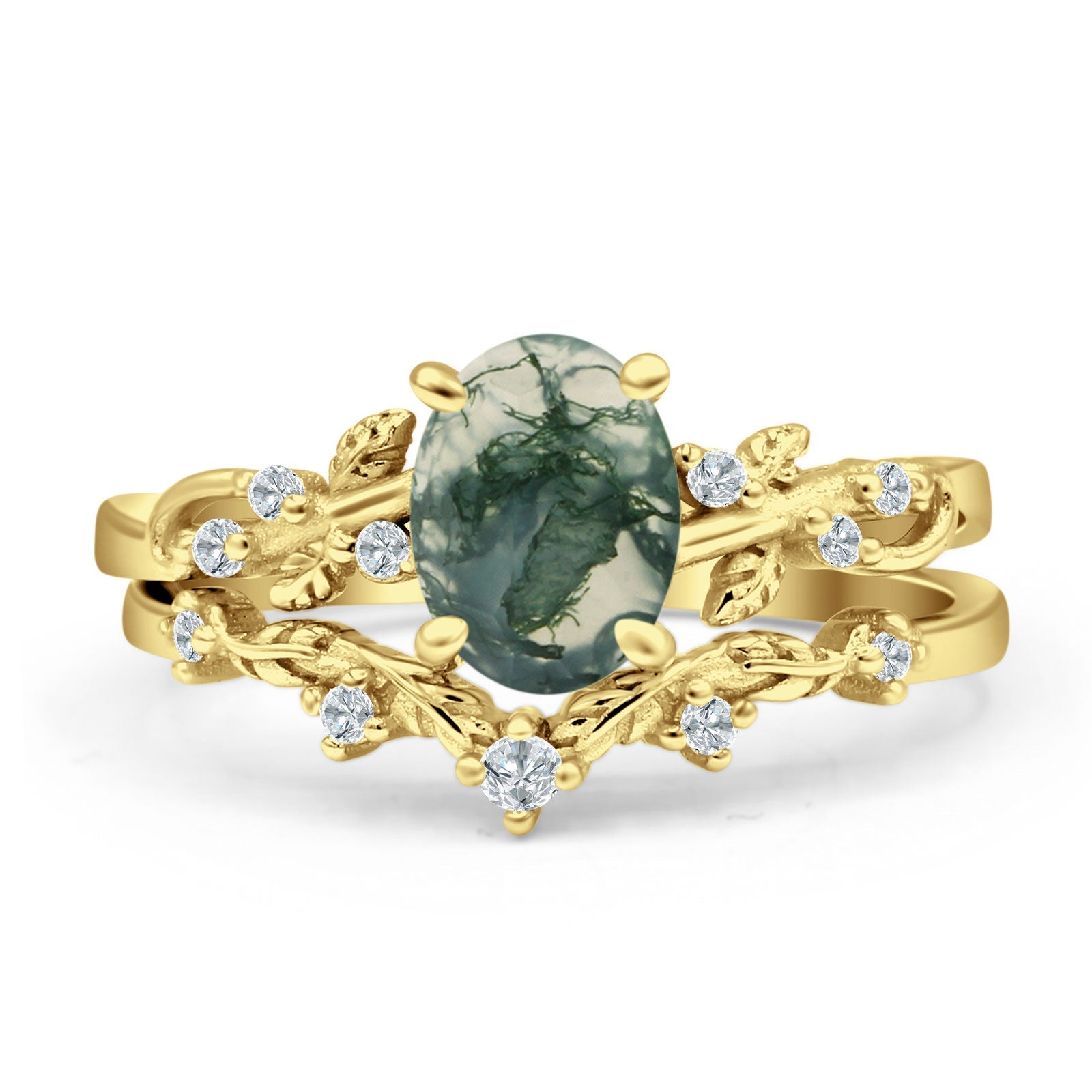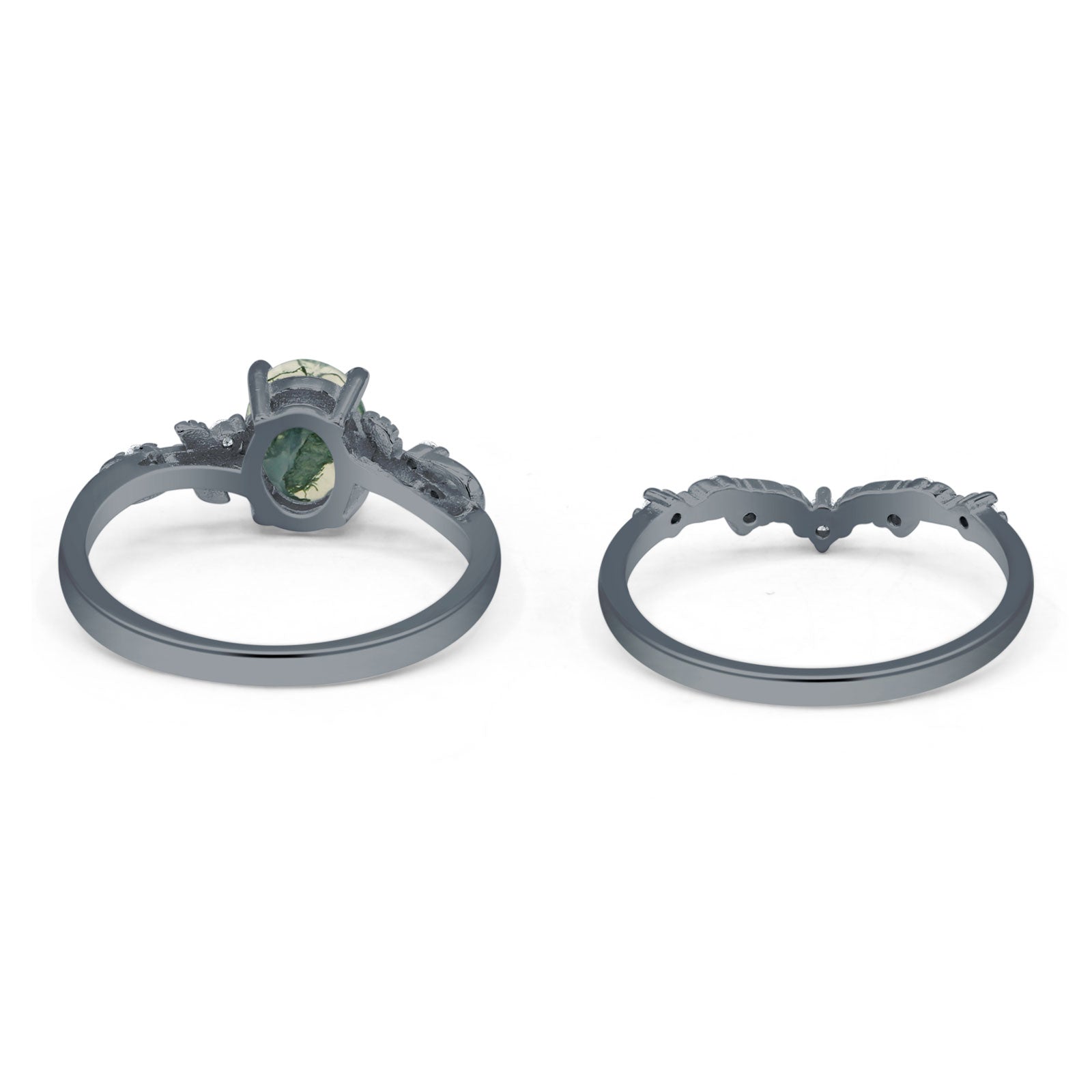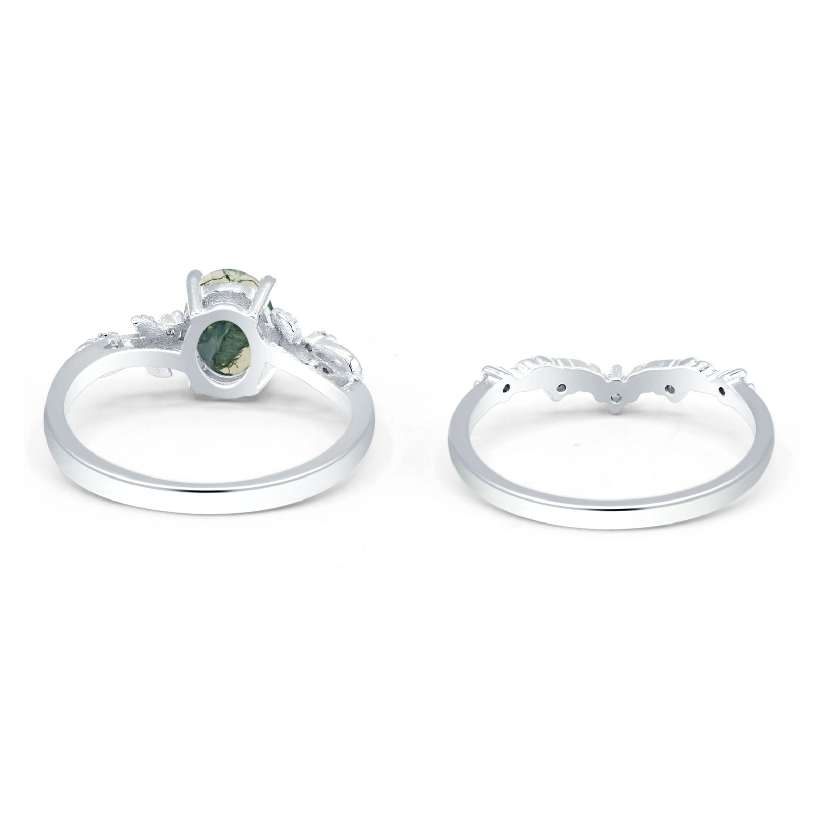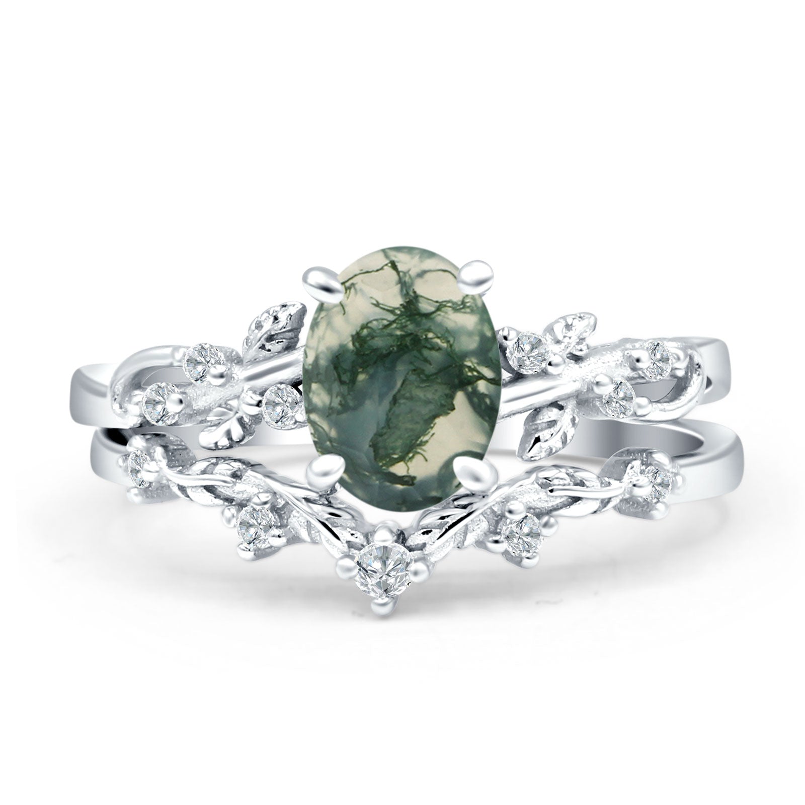 Two Piece Oval Natural Green Moss Agate Leaf Style Chevron Rings 925 Sterling Silver
