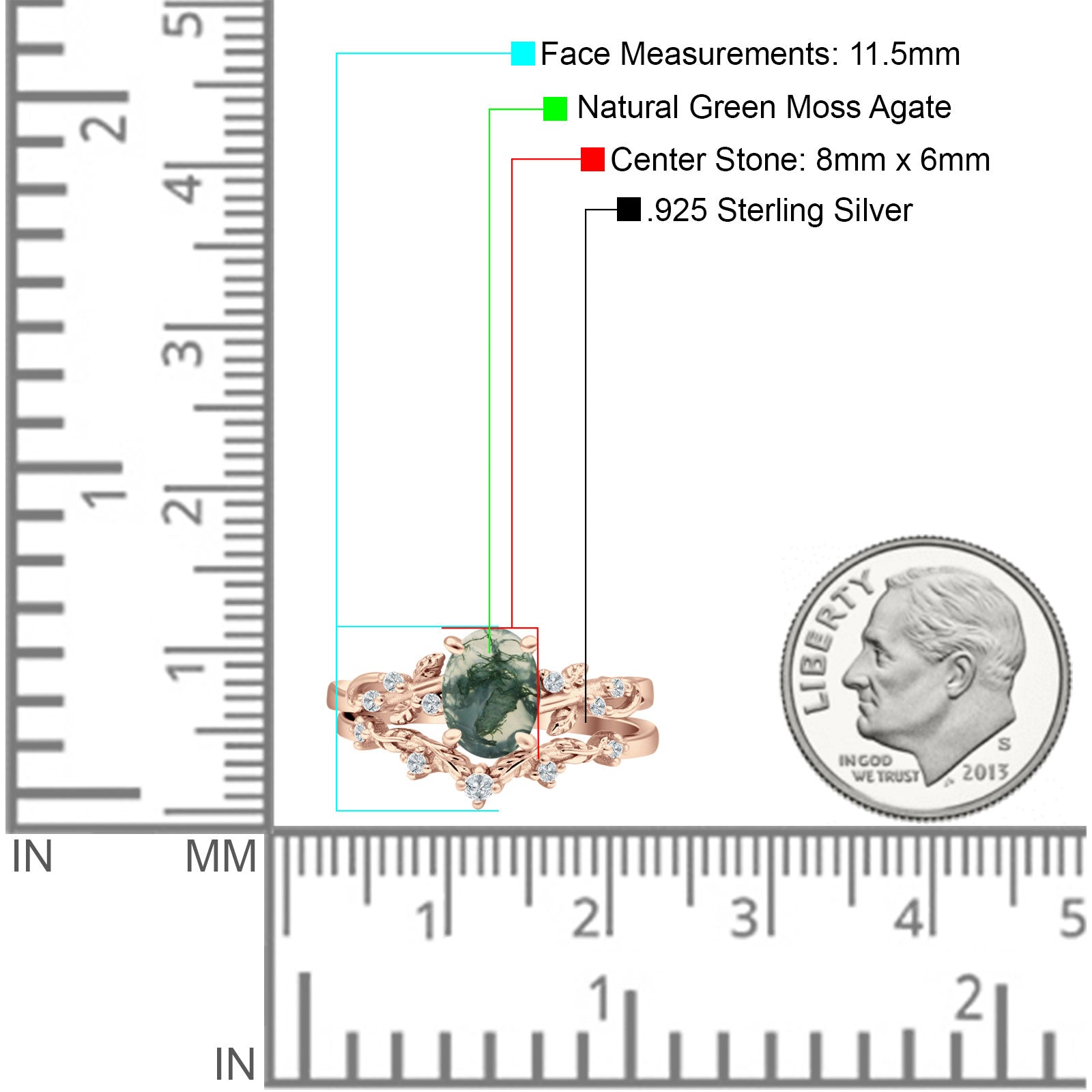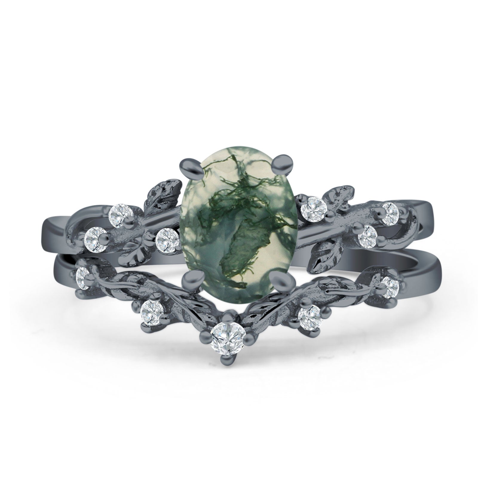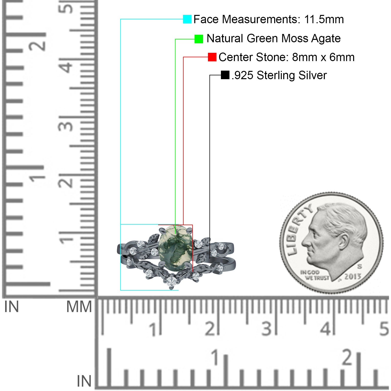 Two Piece Oval Natural Green Moss Agate Leaf Style Chevron Rings 925 Sterling Silver