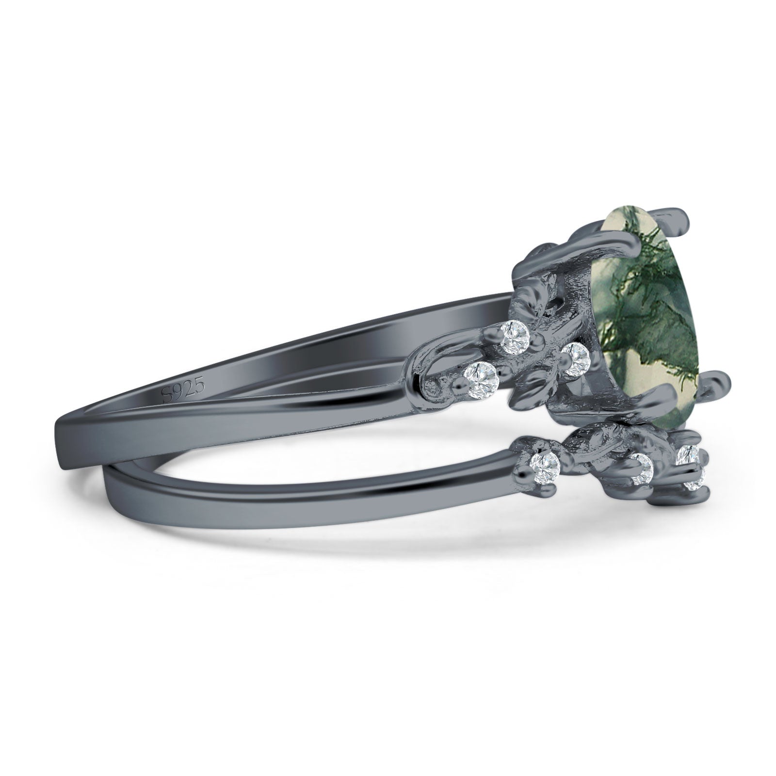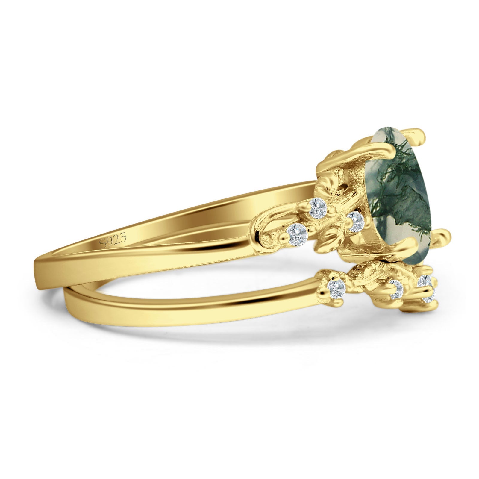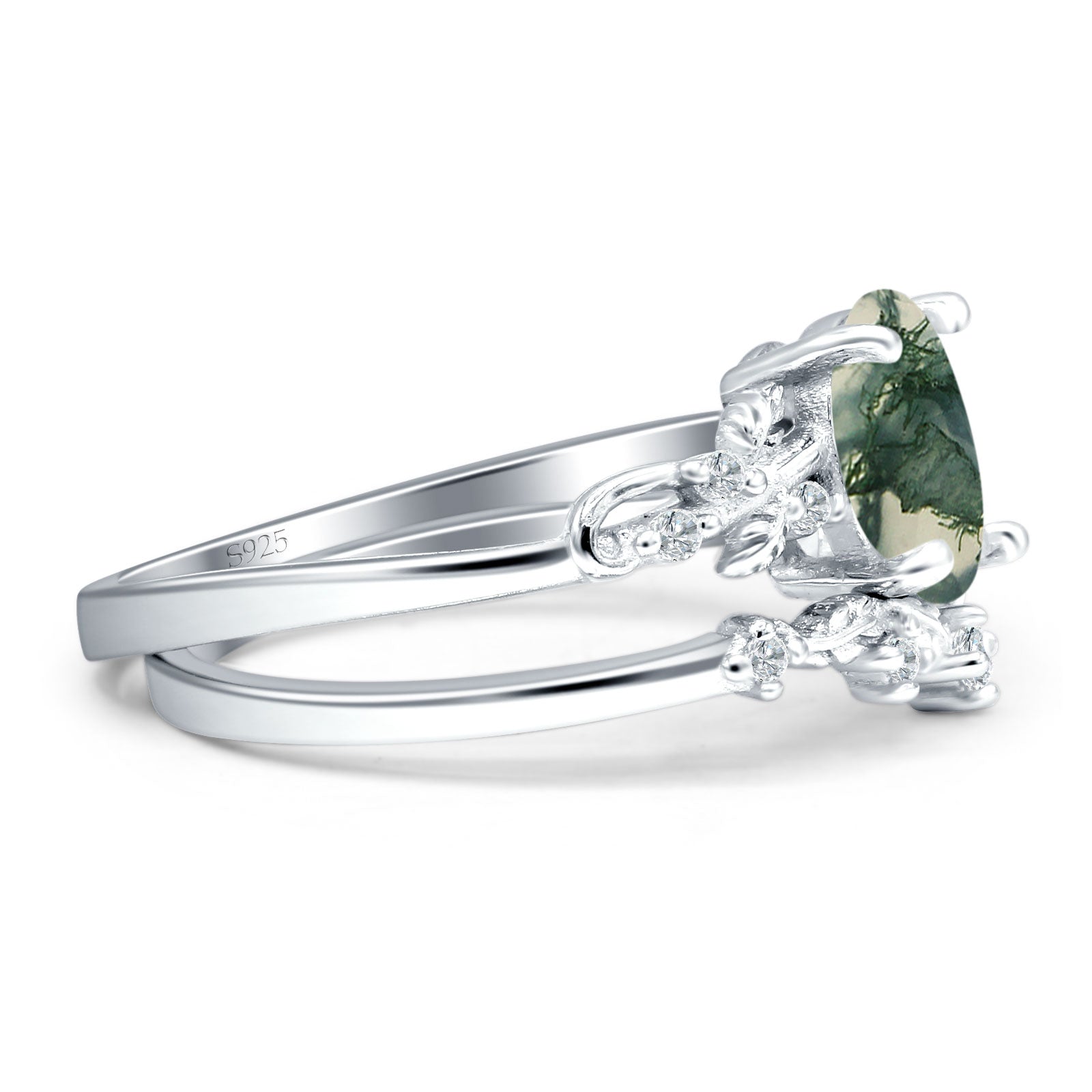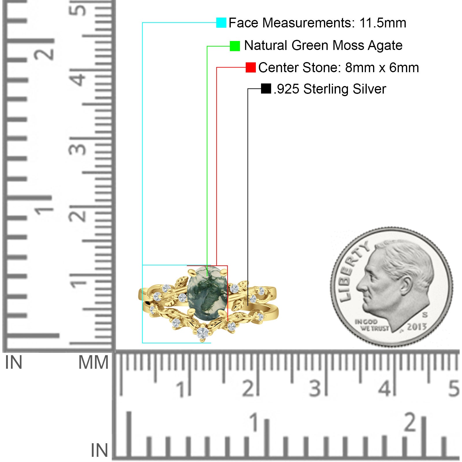 Two Piece Oval Natural Green Moss Agate Leaf Style Chevron Rings 925 Sterling Silver