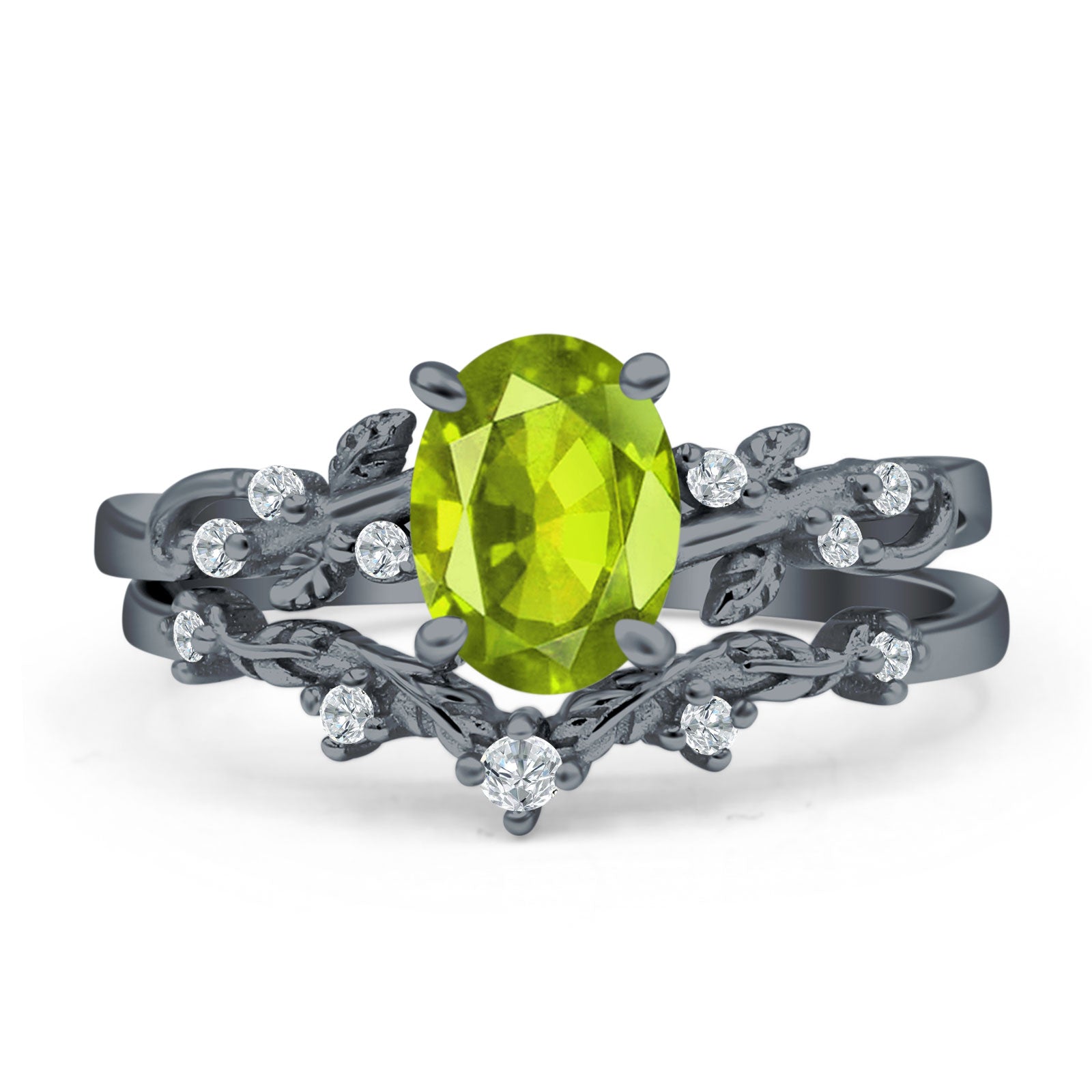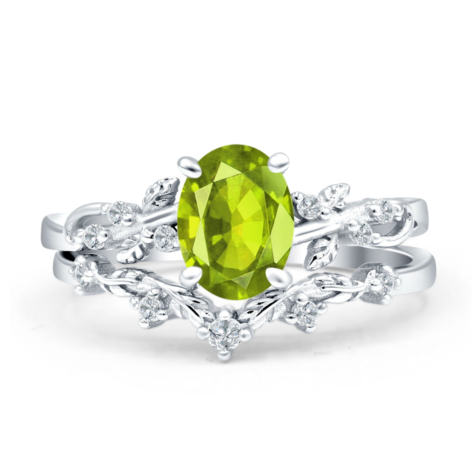 Two Piece Oval Peridot CZ Leaf Style Chevron Rings 925 Sterling Silver
