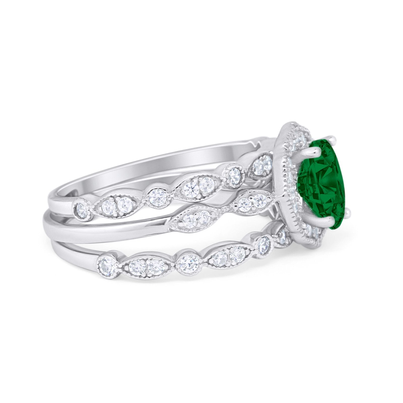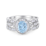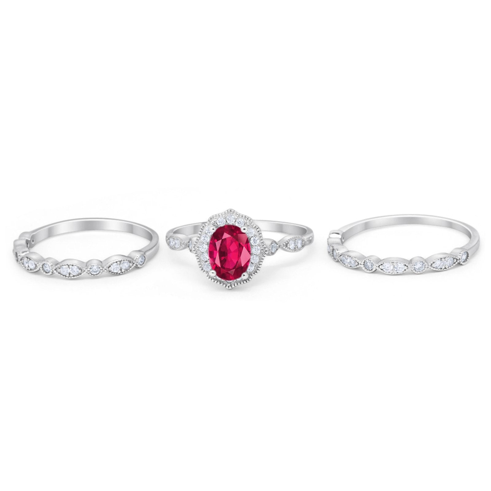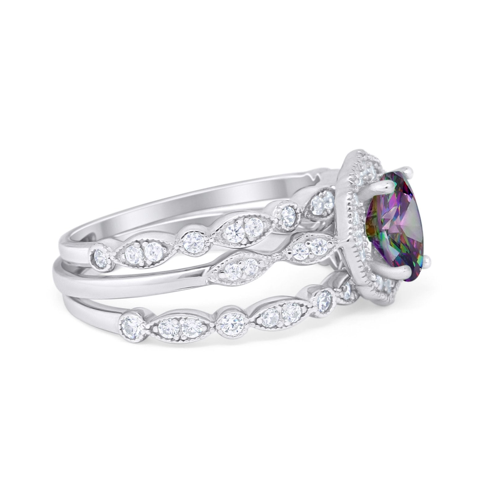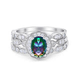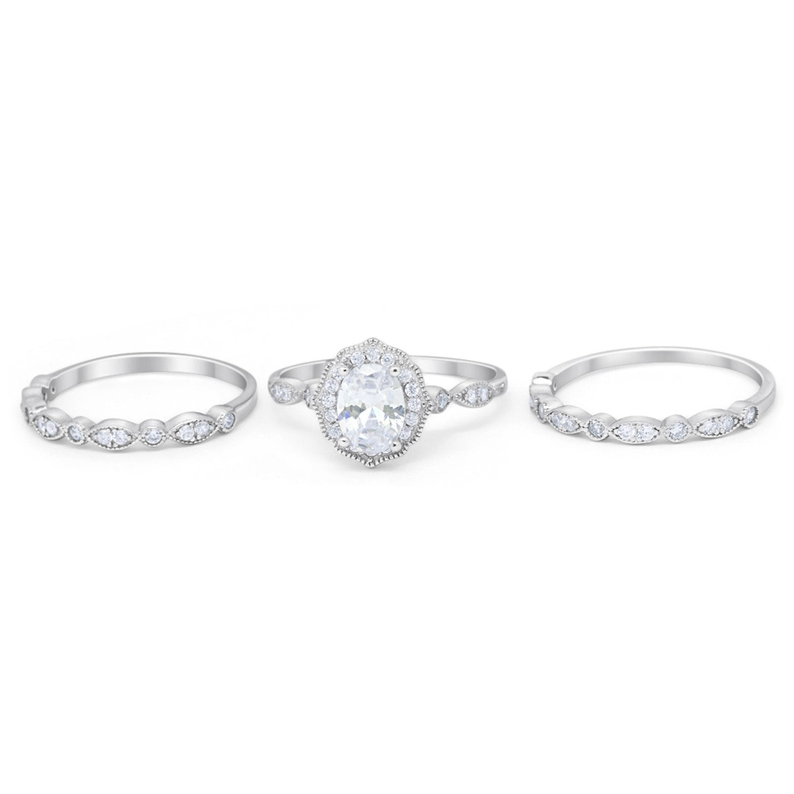 Vintage Style Halo Oval Art Deco Three Piece Wedding Engagement Ring Bridal Set Round Simulated Cubic Zirconia 925 Sterling Silver