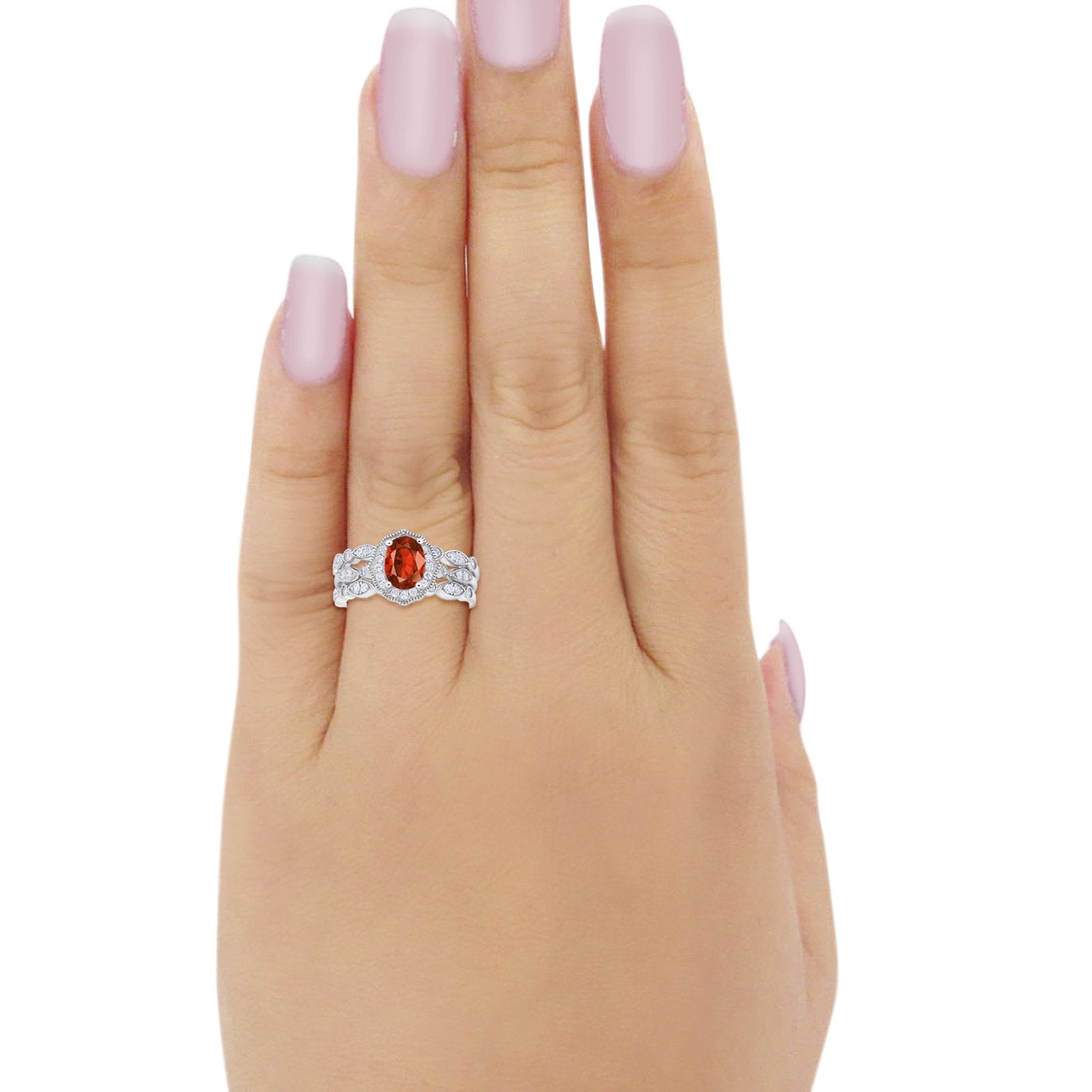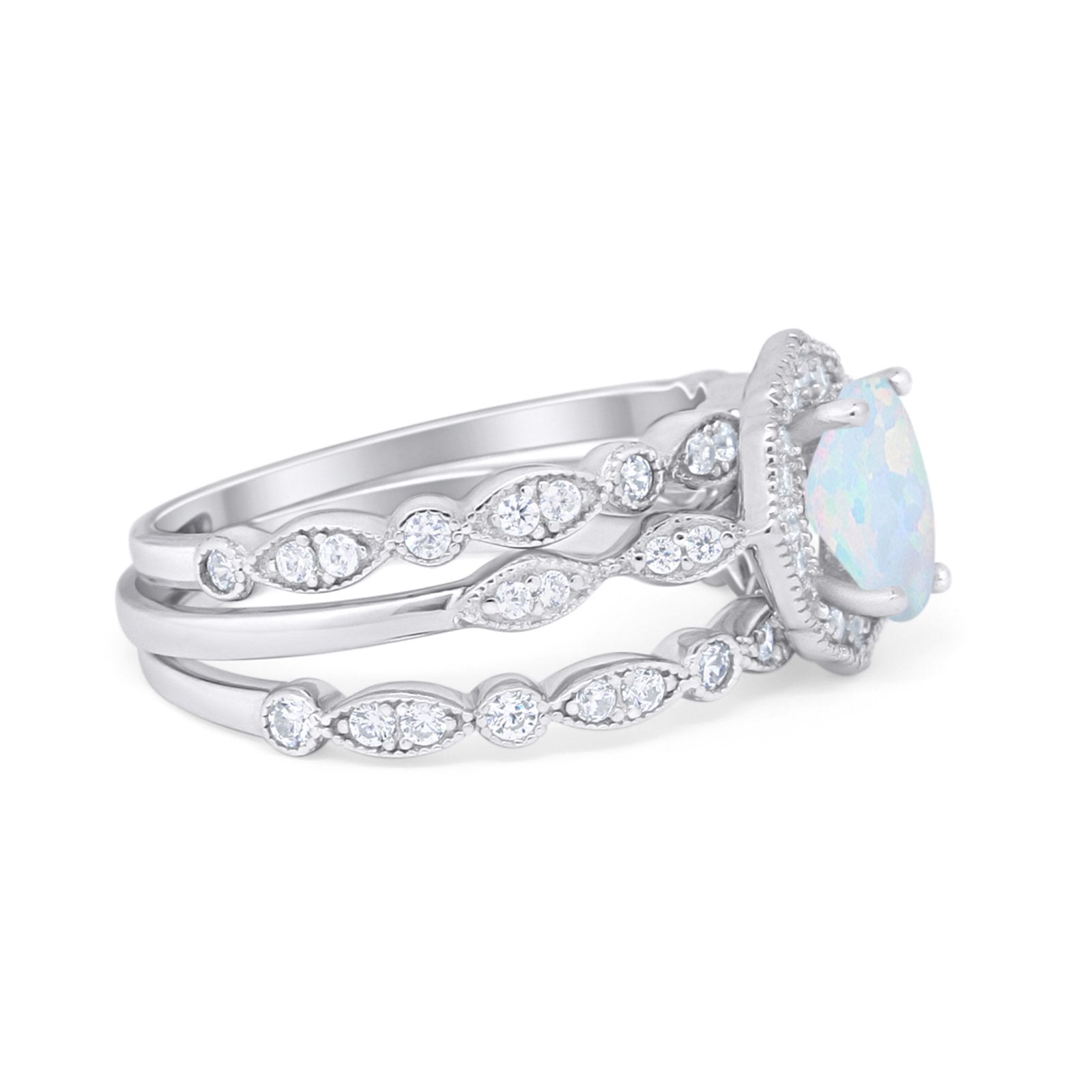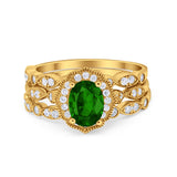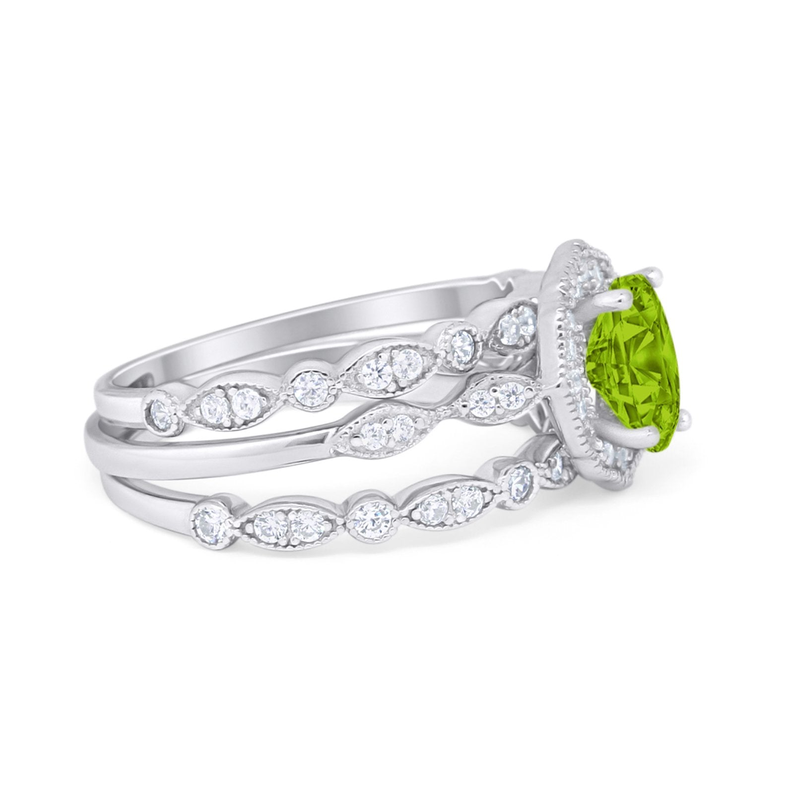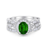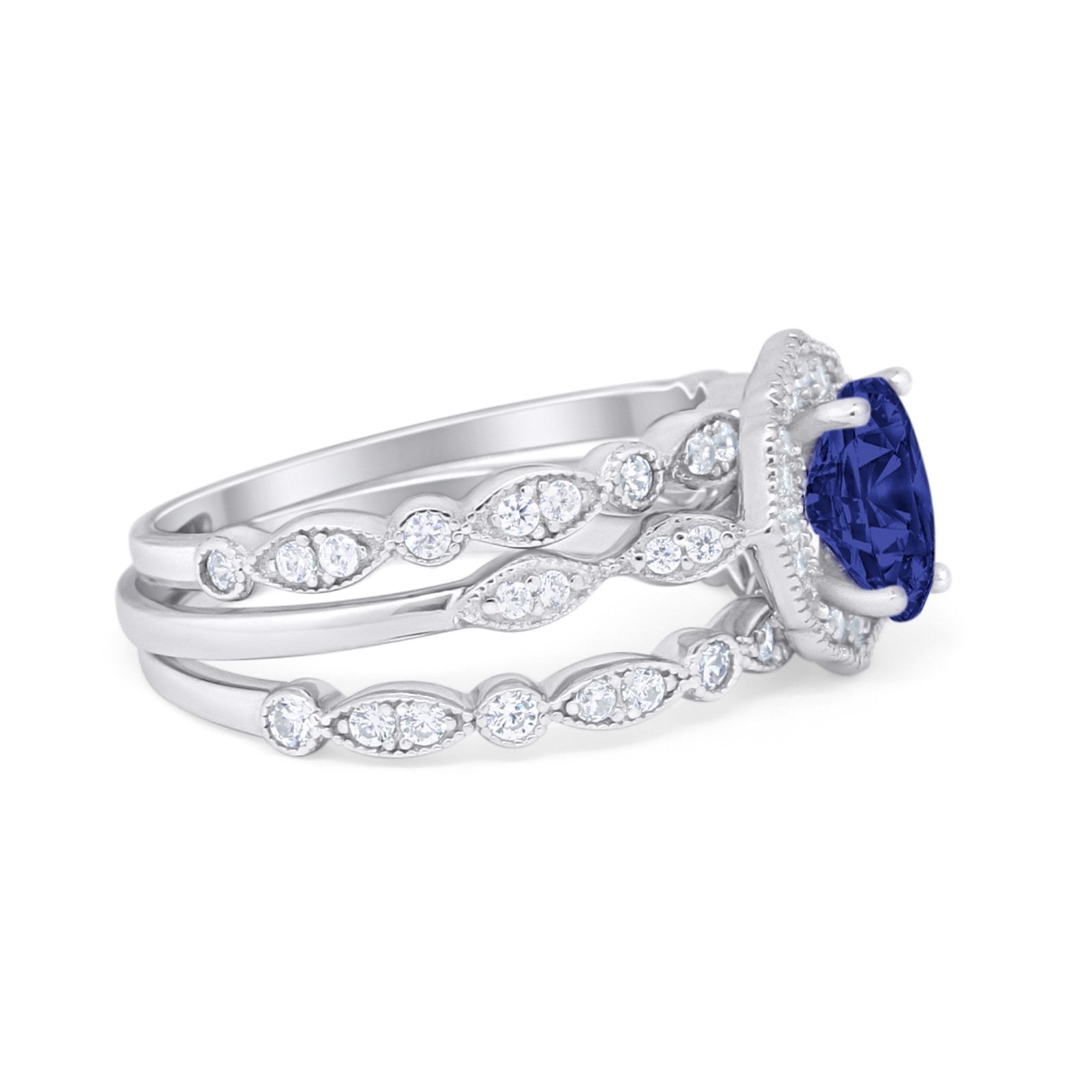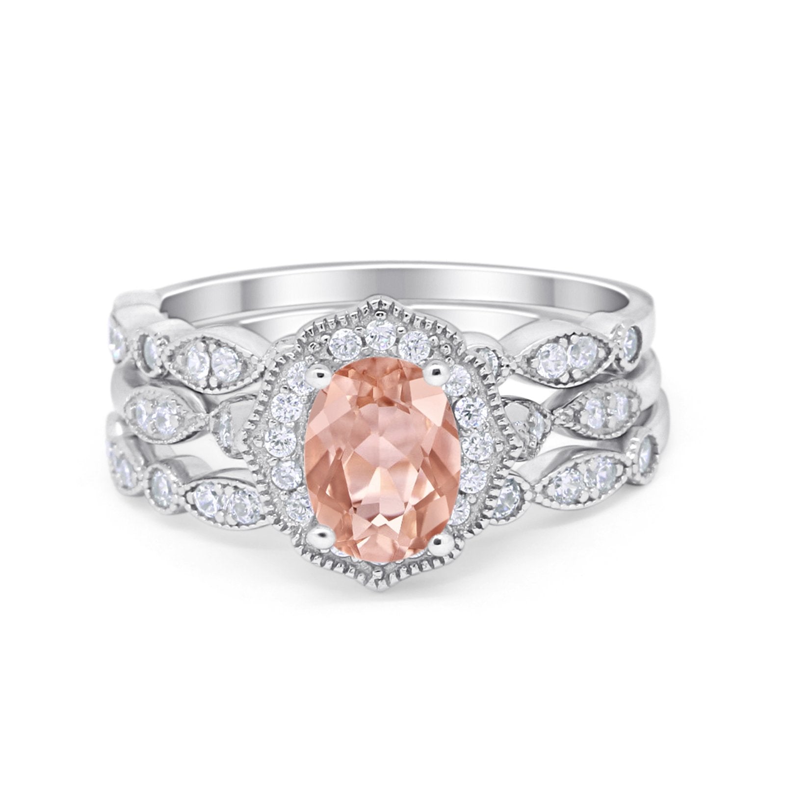 Vintage Style Halo Oval Art Deco Three Piece Wedding Engagement Ring Bridal Set Round Simulated Cubic Zirconia 925 Sterling Silver
