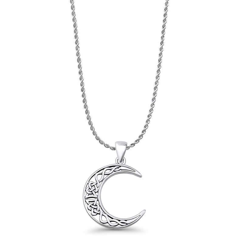 Celtic Moon Pendant Rope Chain Necklace Oxidized 925 Sterling Silver