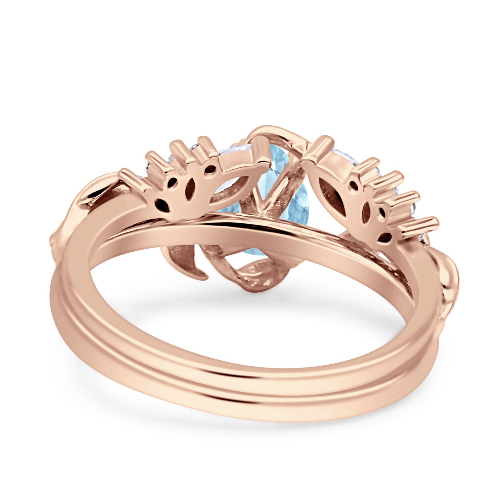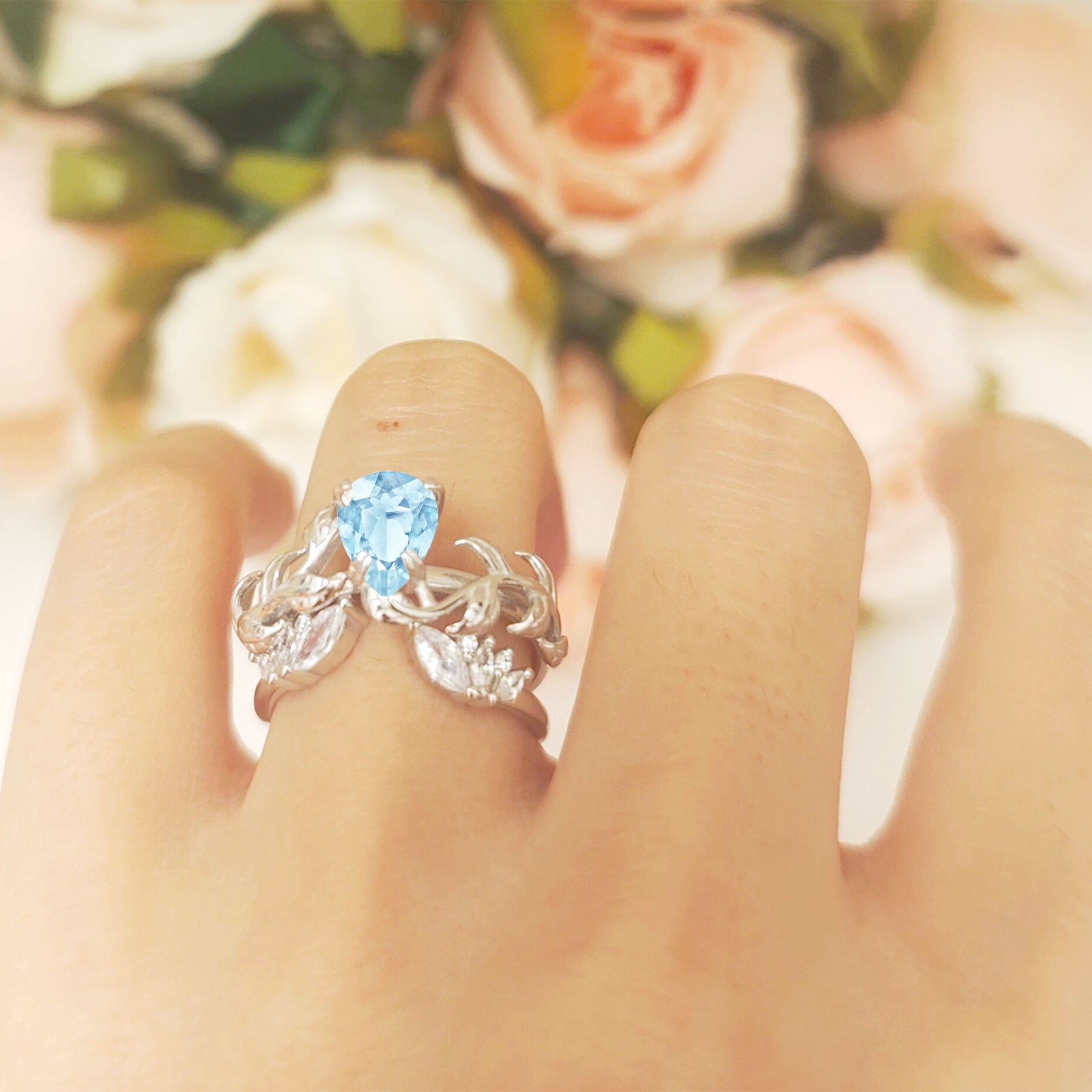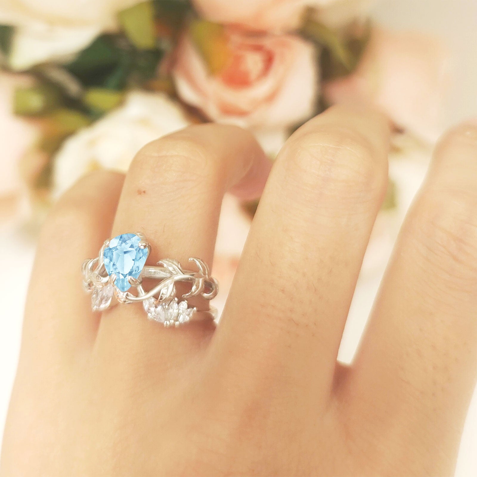Teardrop Pear Natural Aquamarine Leaf Style Two Piece Ring 925 Sterling Silver
