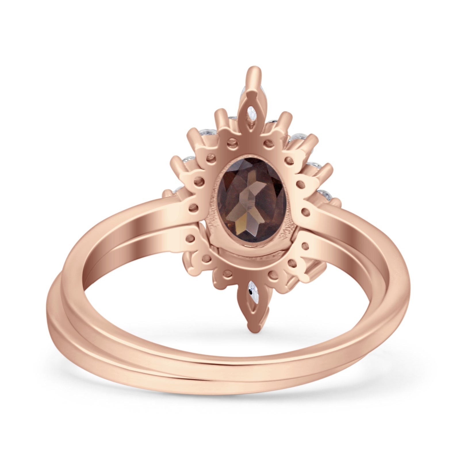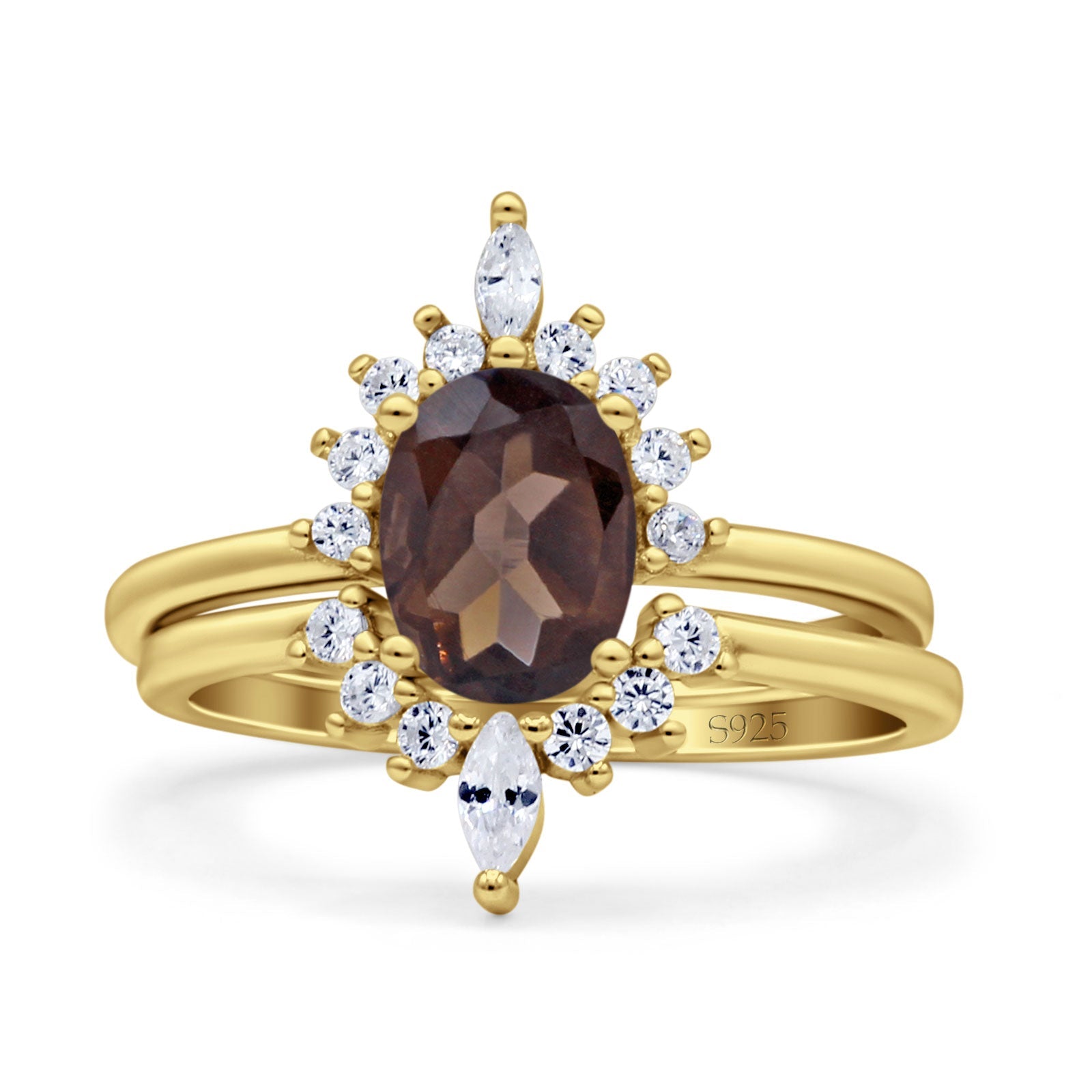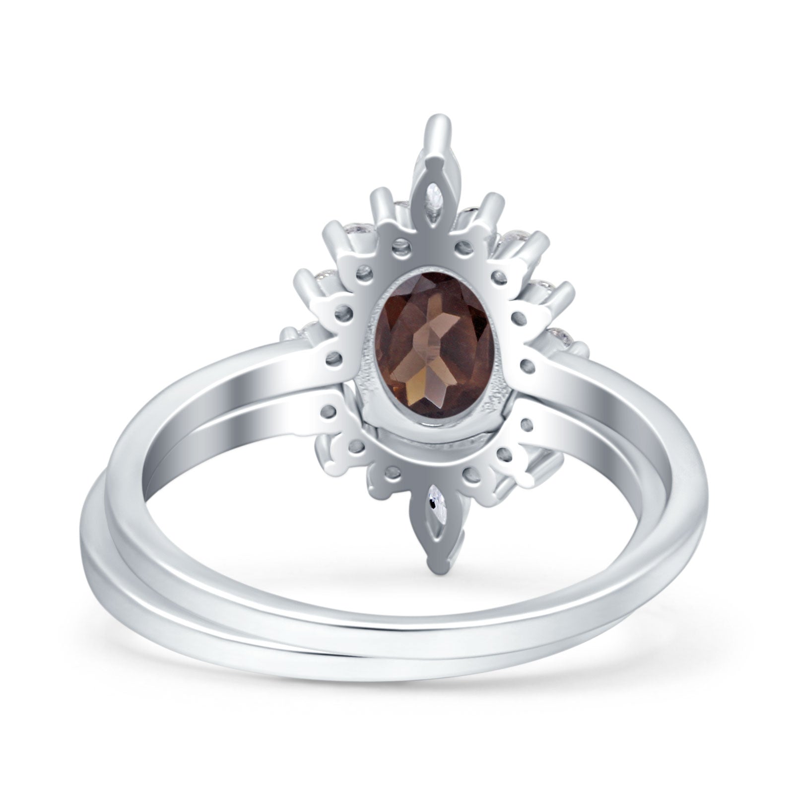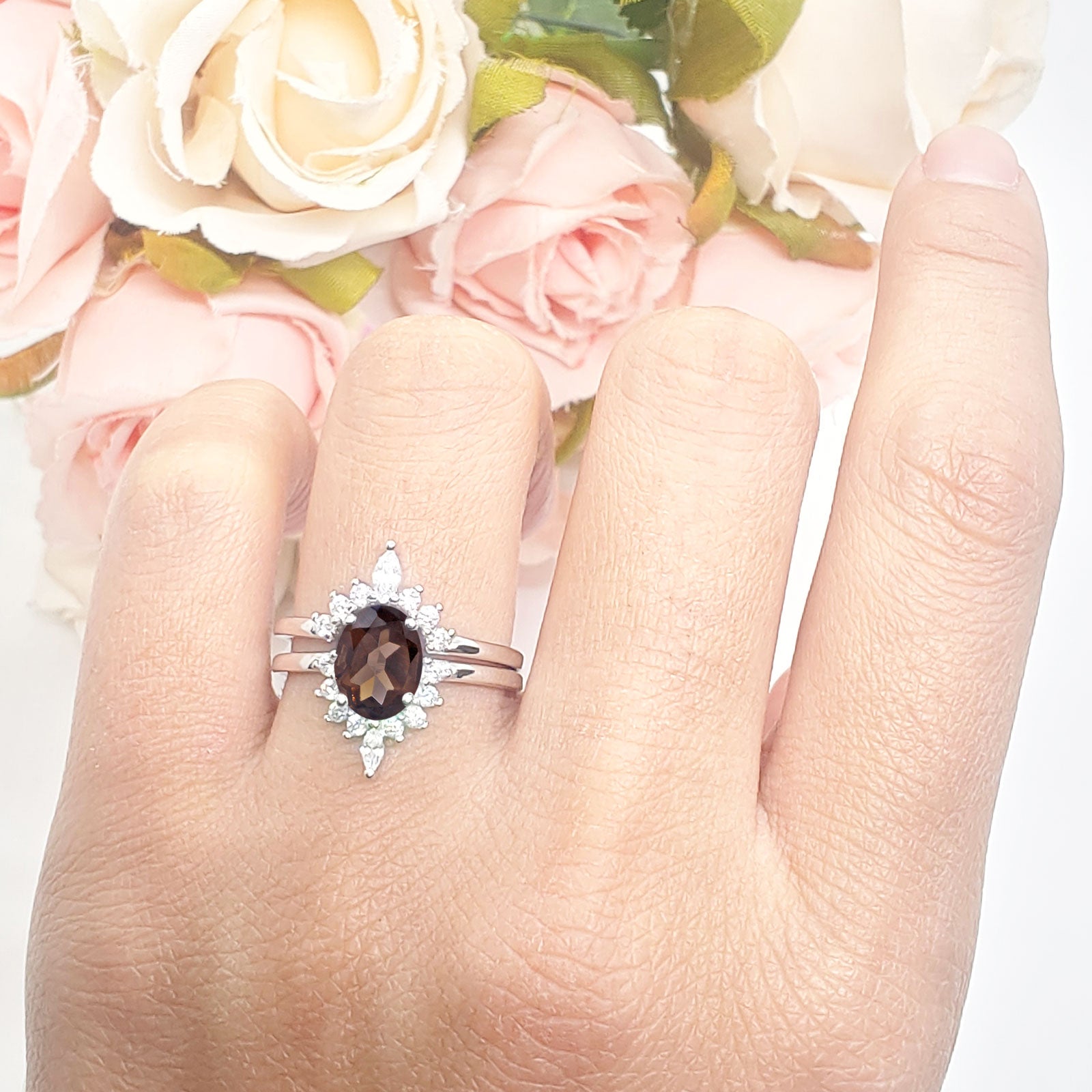 Two Piece Oval Natural Chocolate Smoky Quartz Ring Curved Contour Band 925 Sterlig Silver