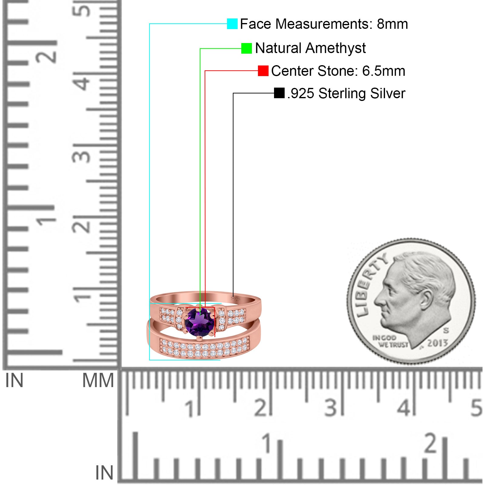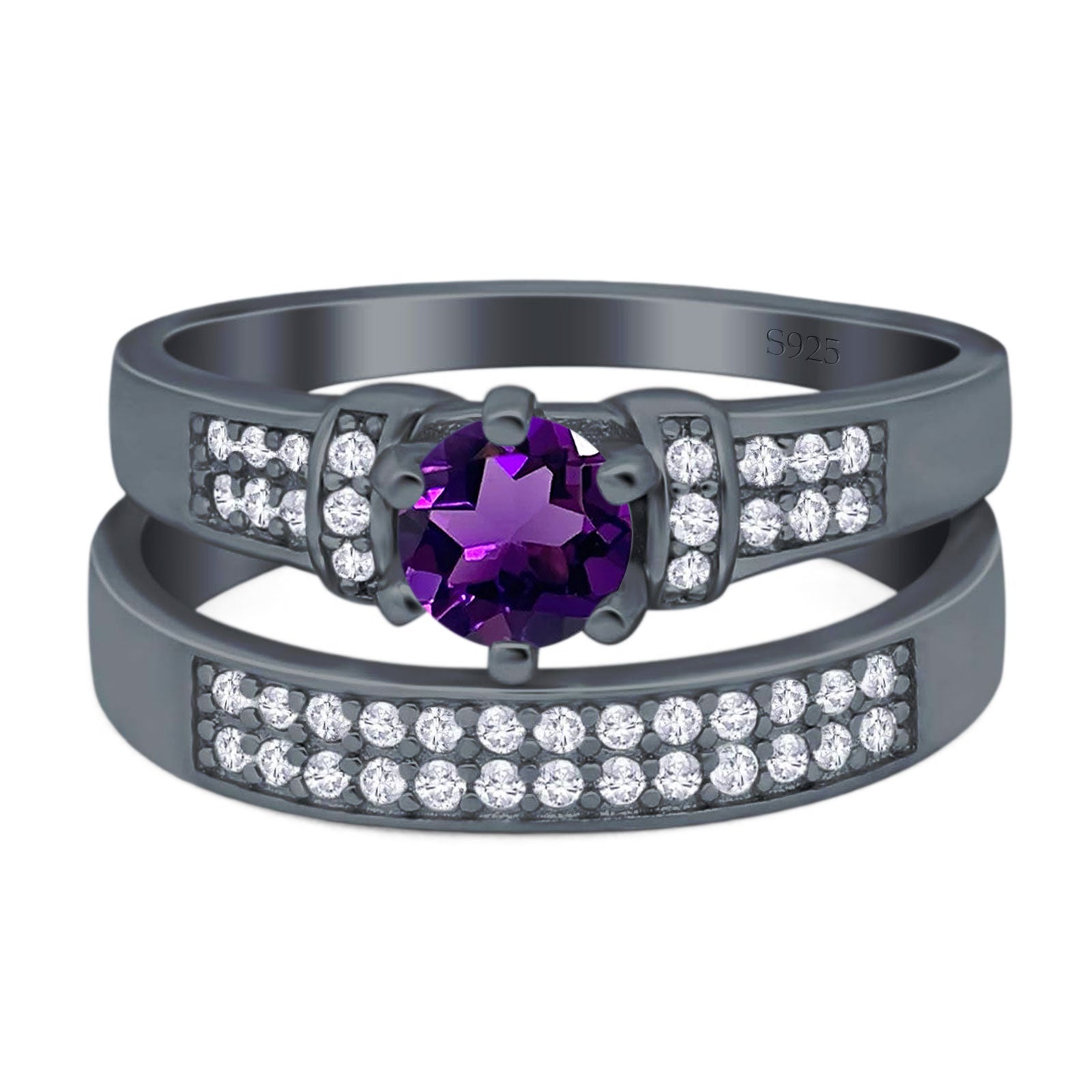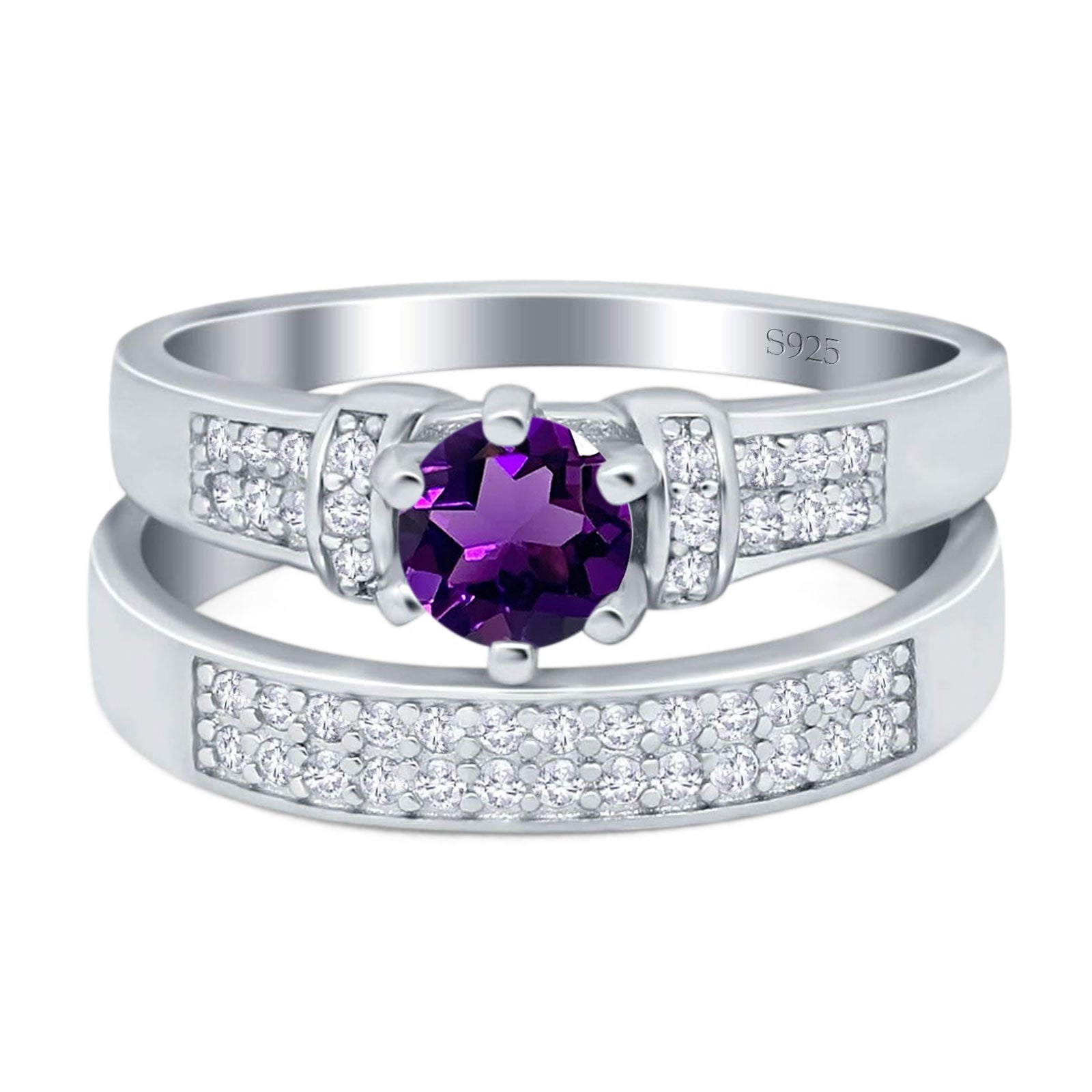 Two Piece Round Natural Amethyst Cluster Bridal Ring 925 Sterling Silver