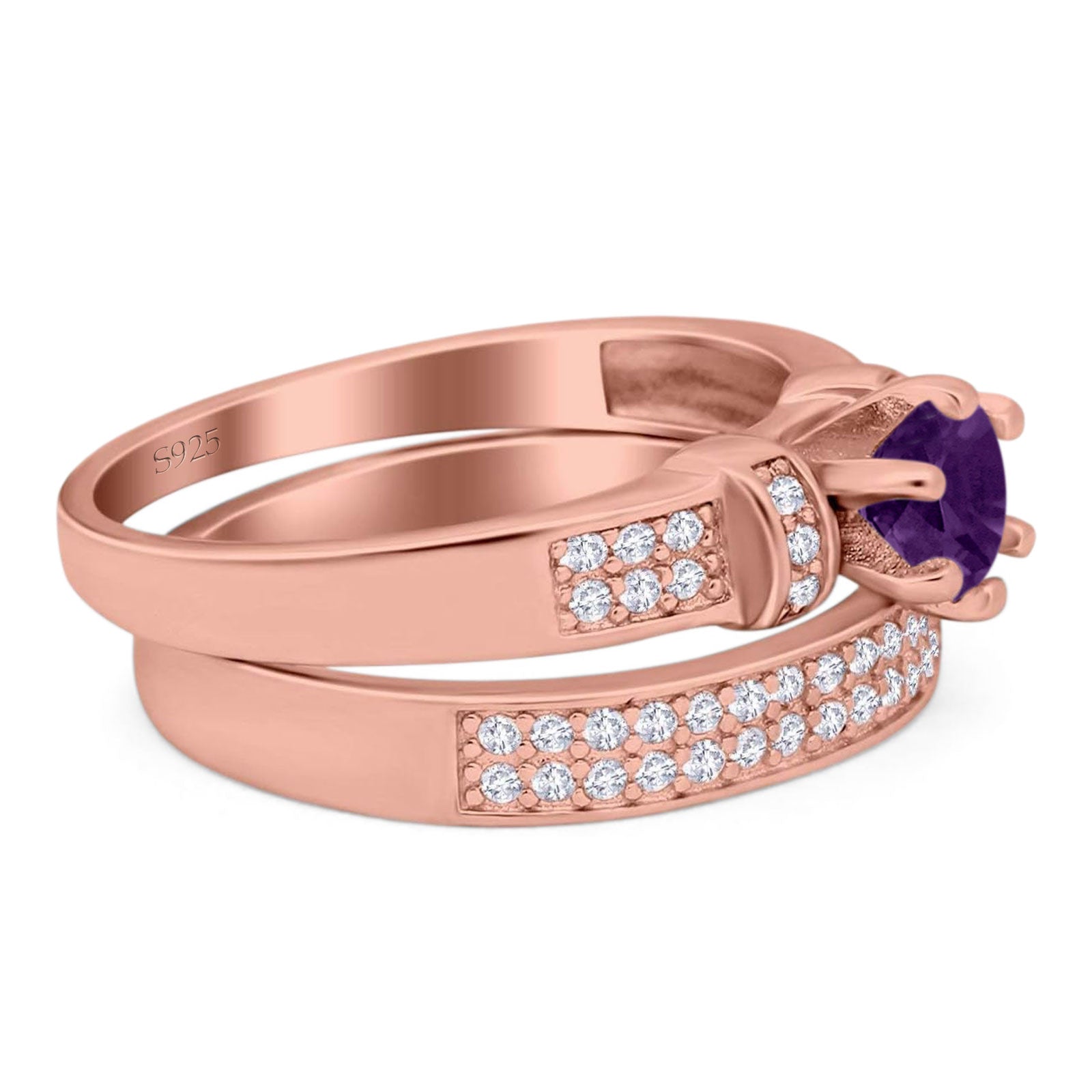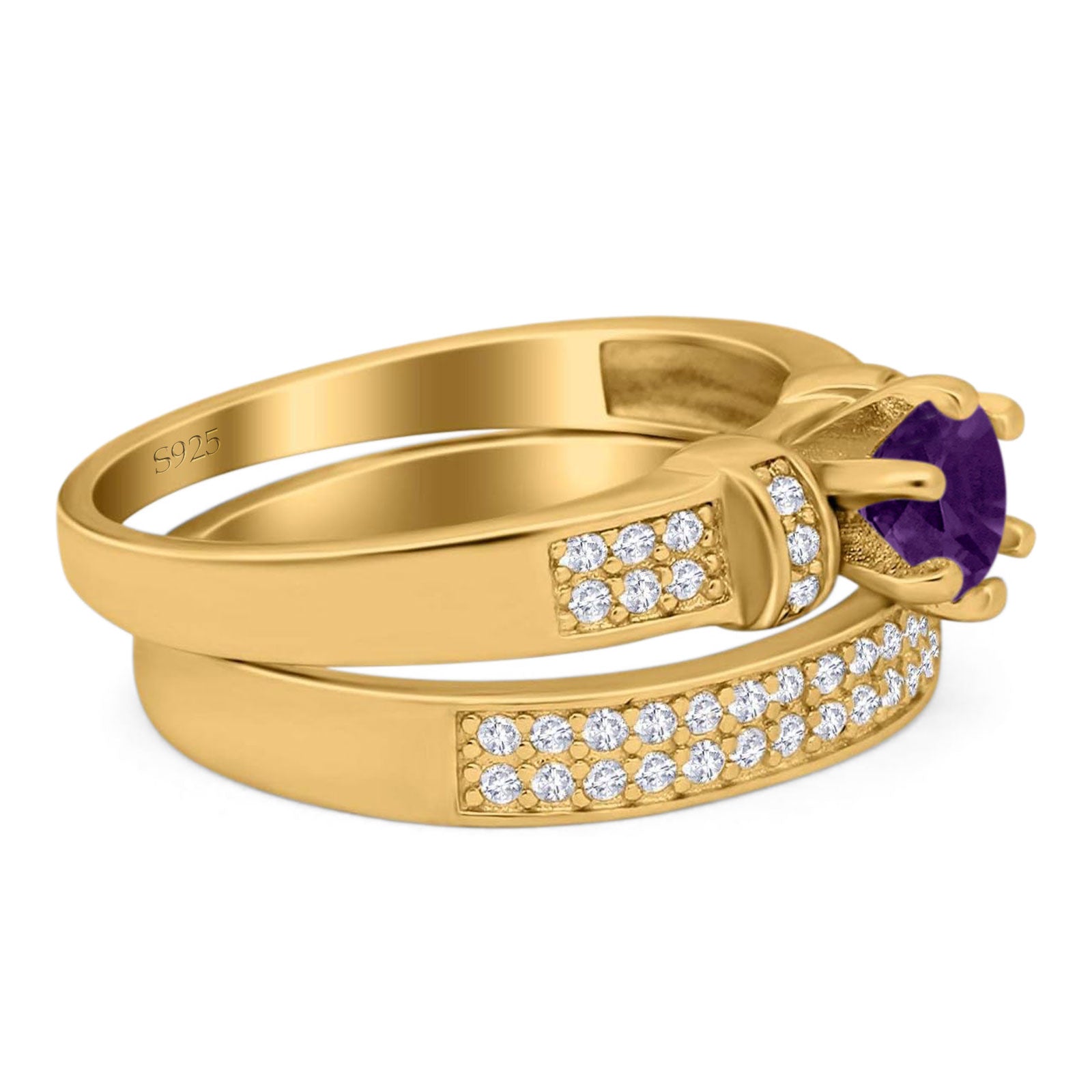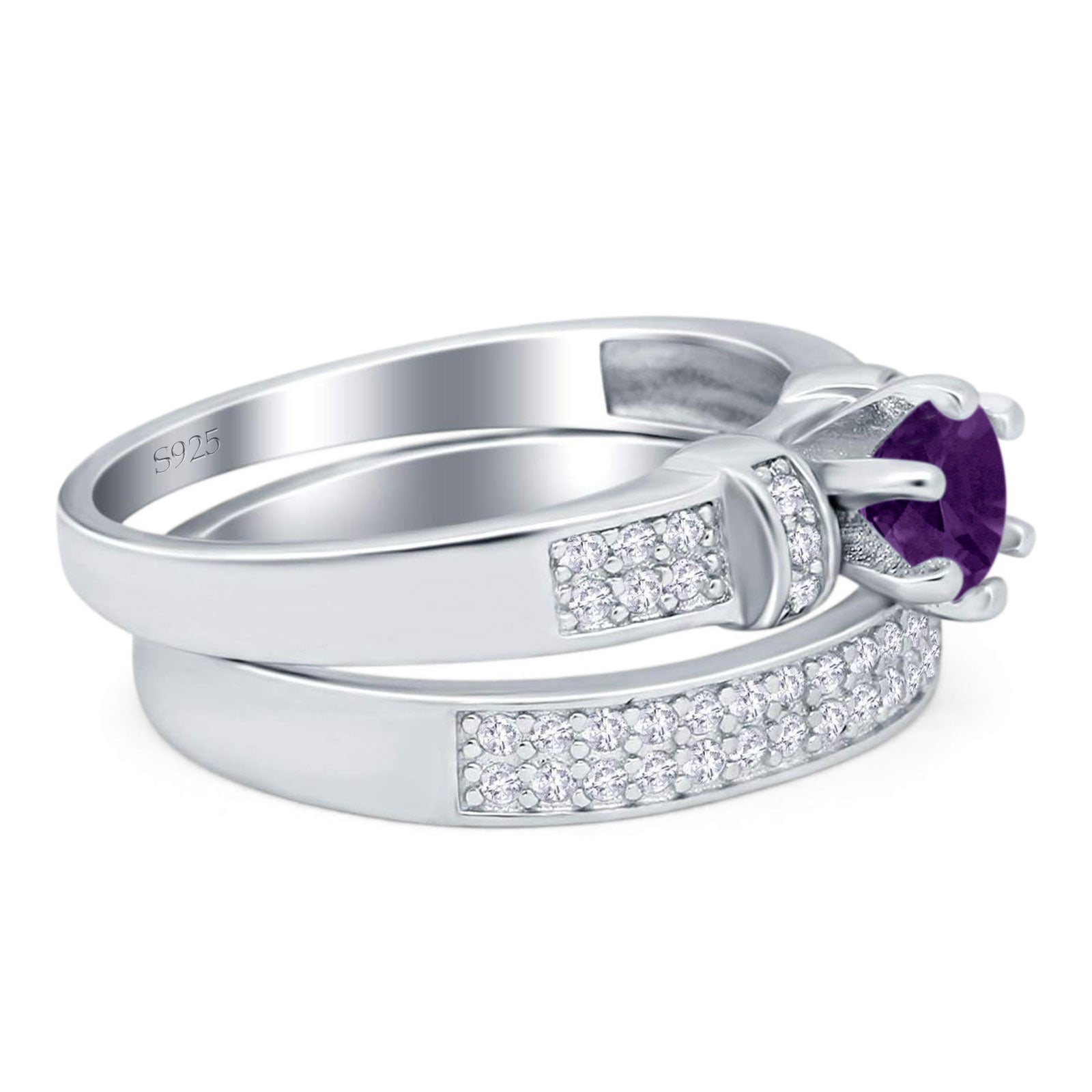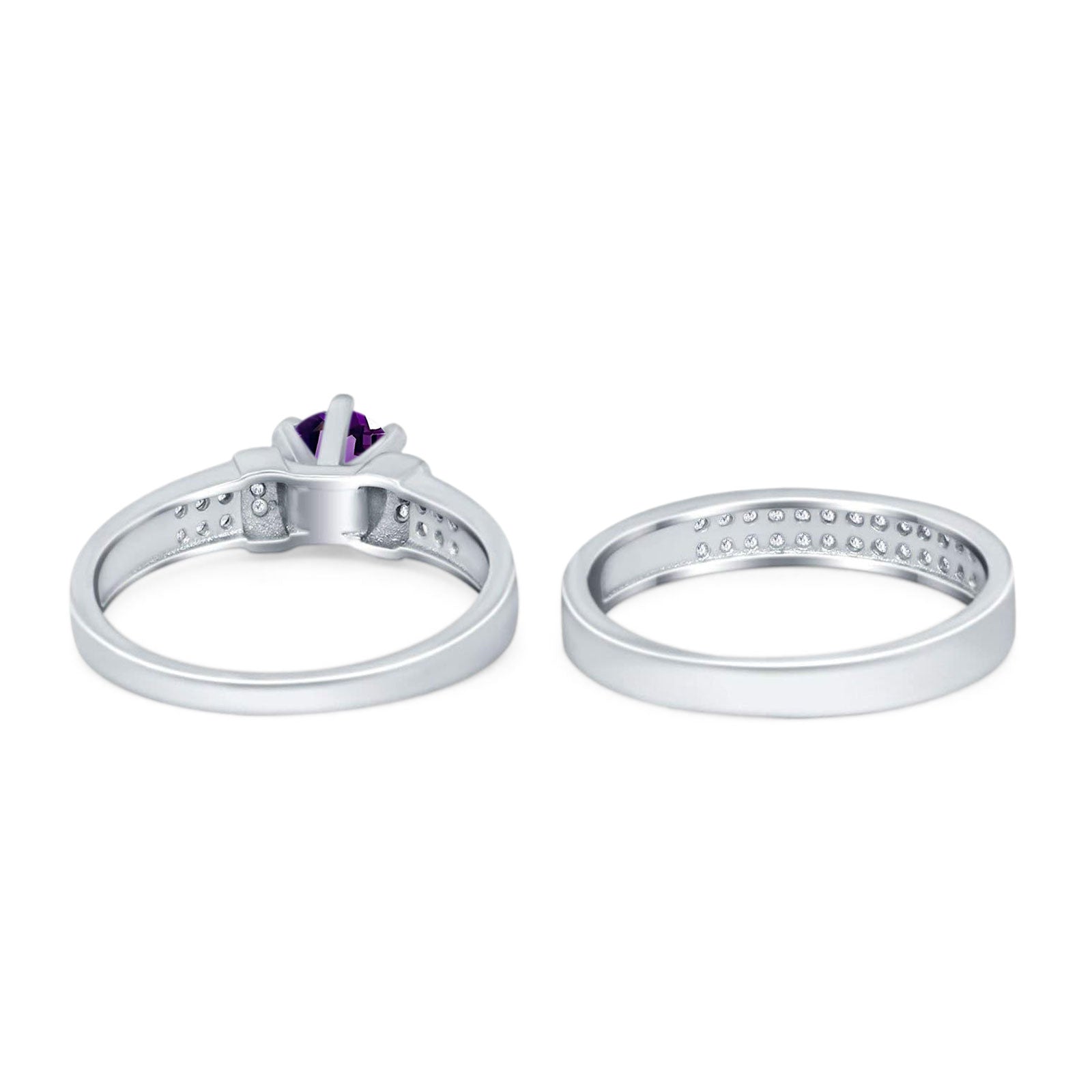 Two Piece Round Natural Amethyst Cluster Bridal Ring 925 Sterling Silver