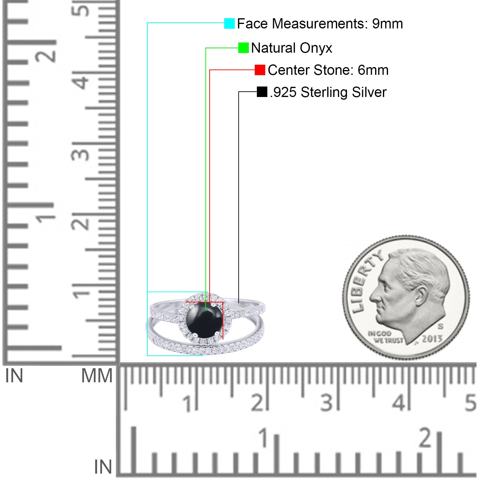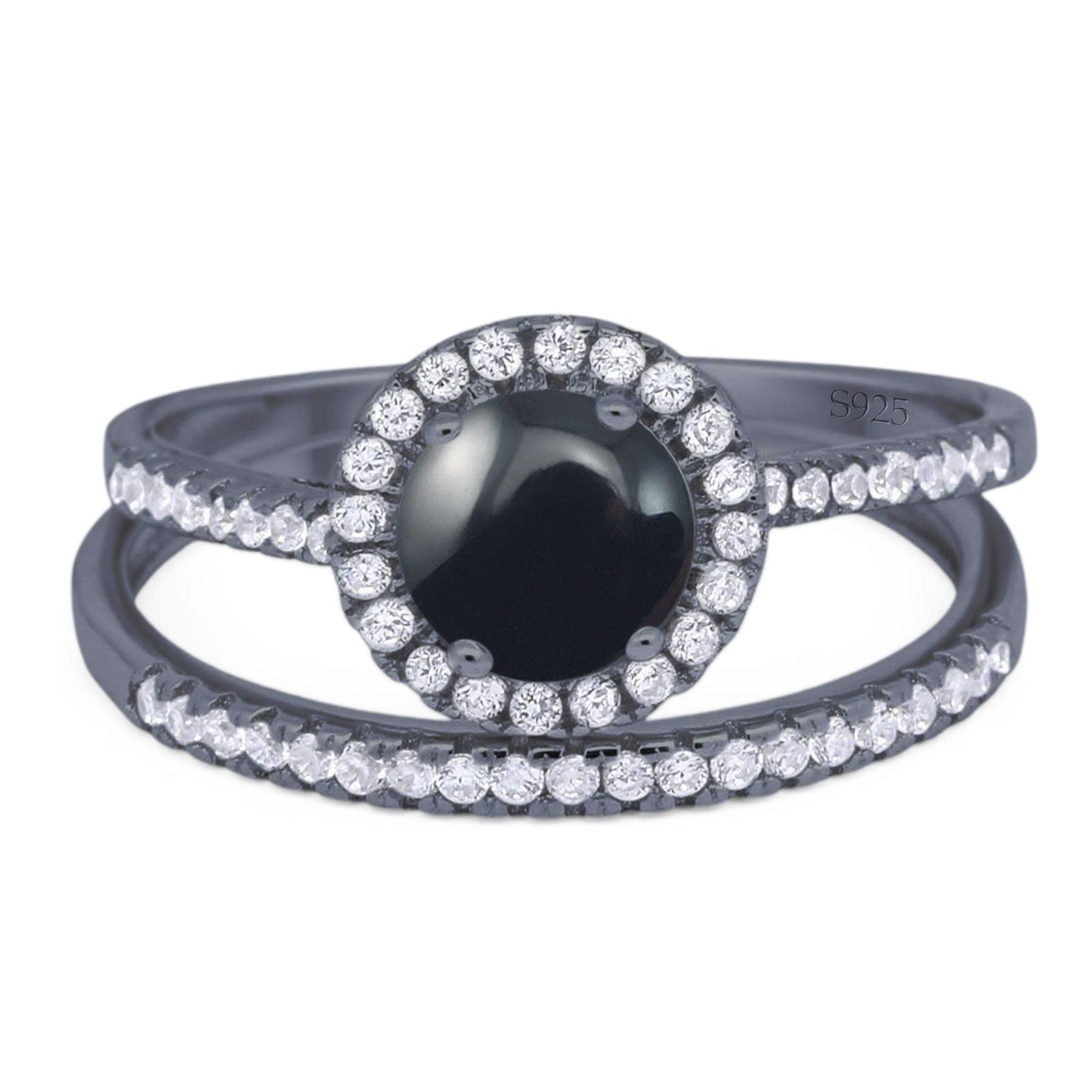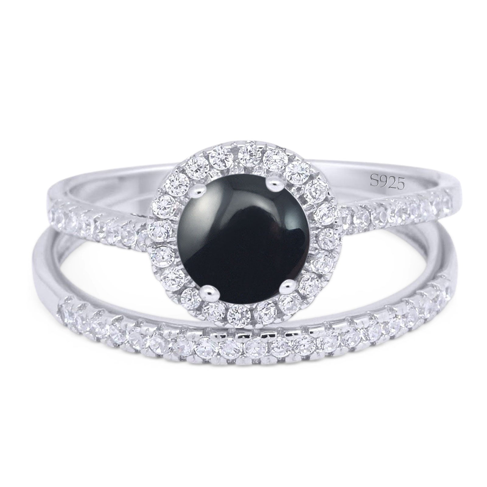 Two Piece Round Natural Black Onyx Wedding Set Ring 925 Sterling Silver