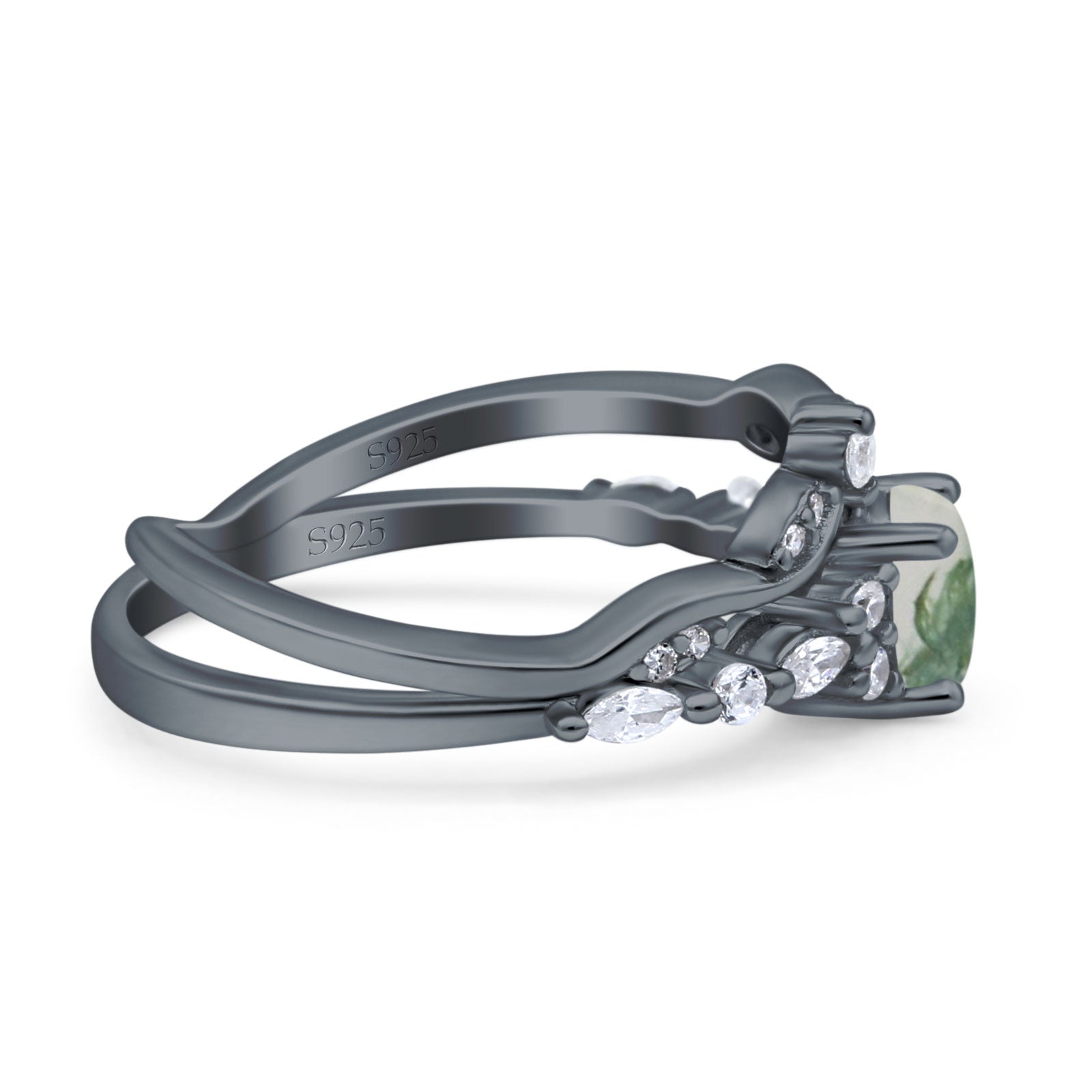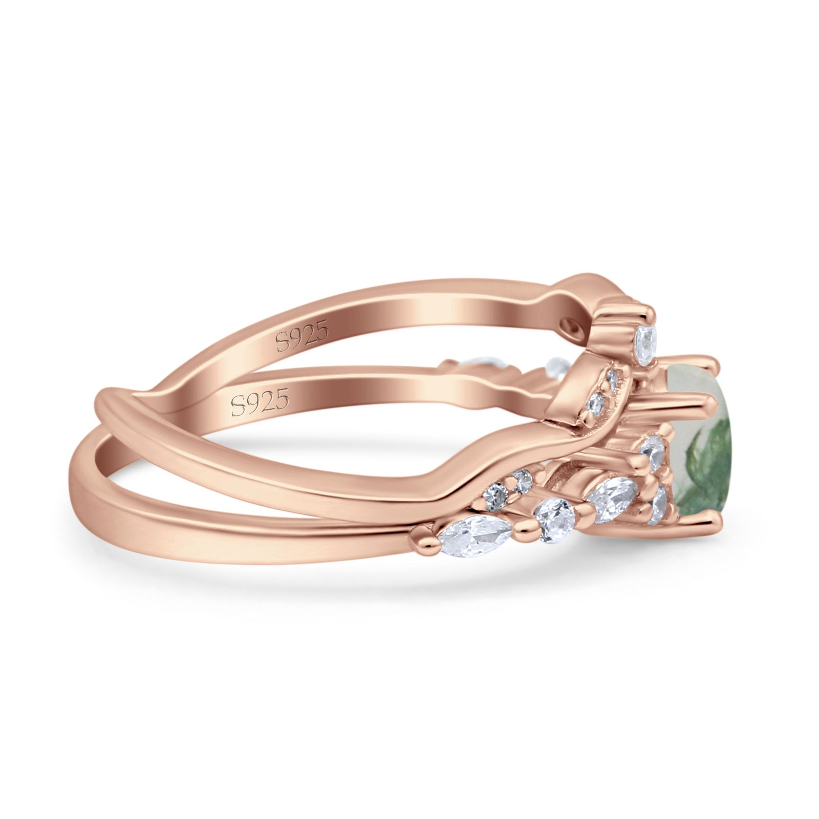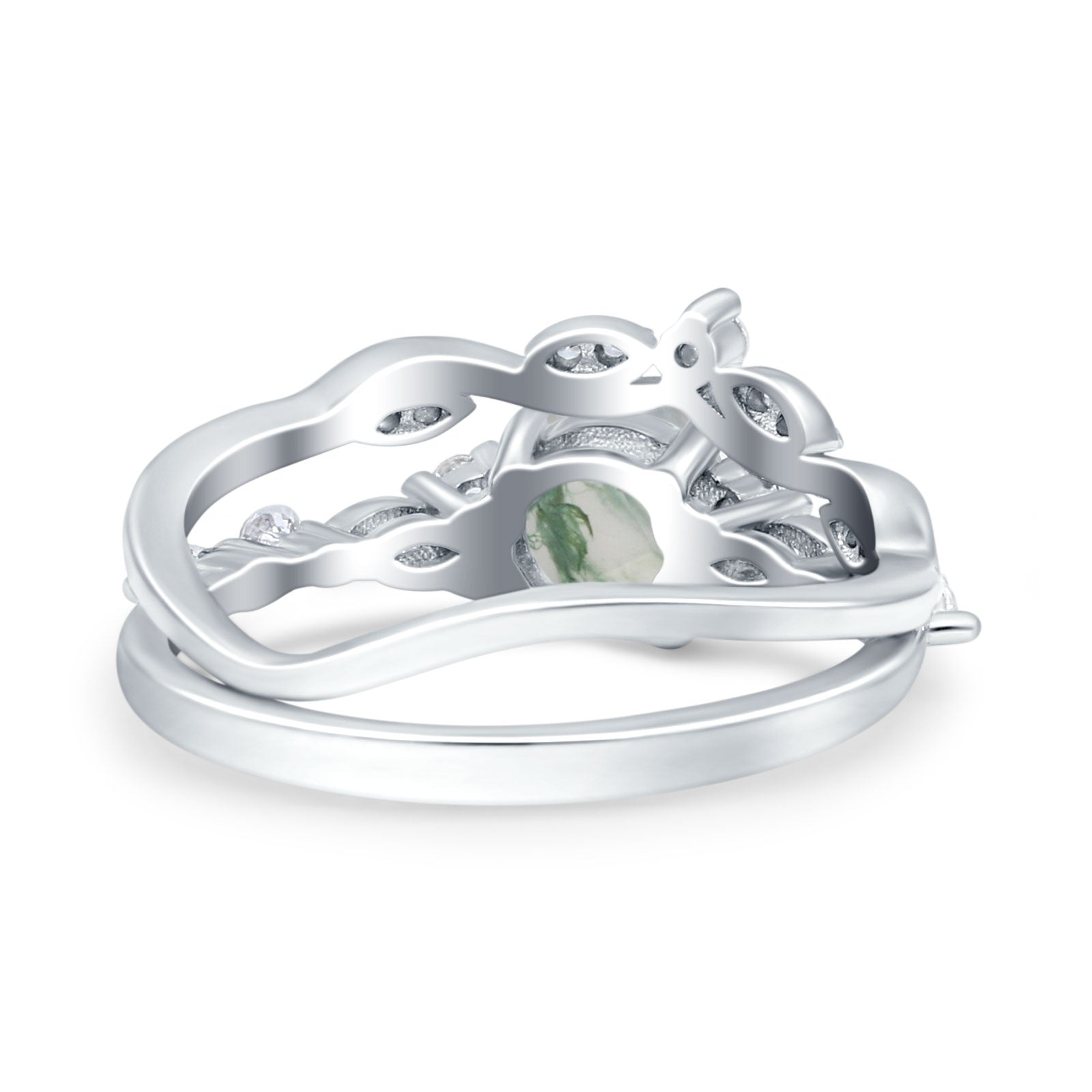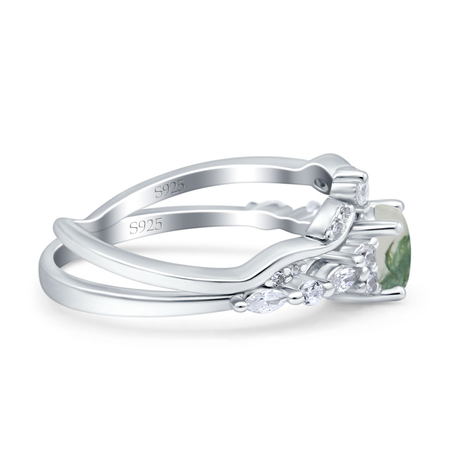 Two Piece Round Natural Green Moss Agate Marquise Style Bridal Ring 925 Sterling Silver
