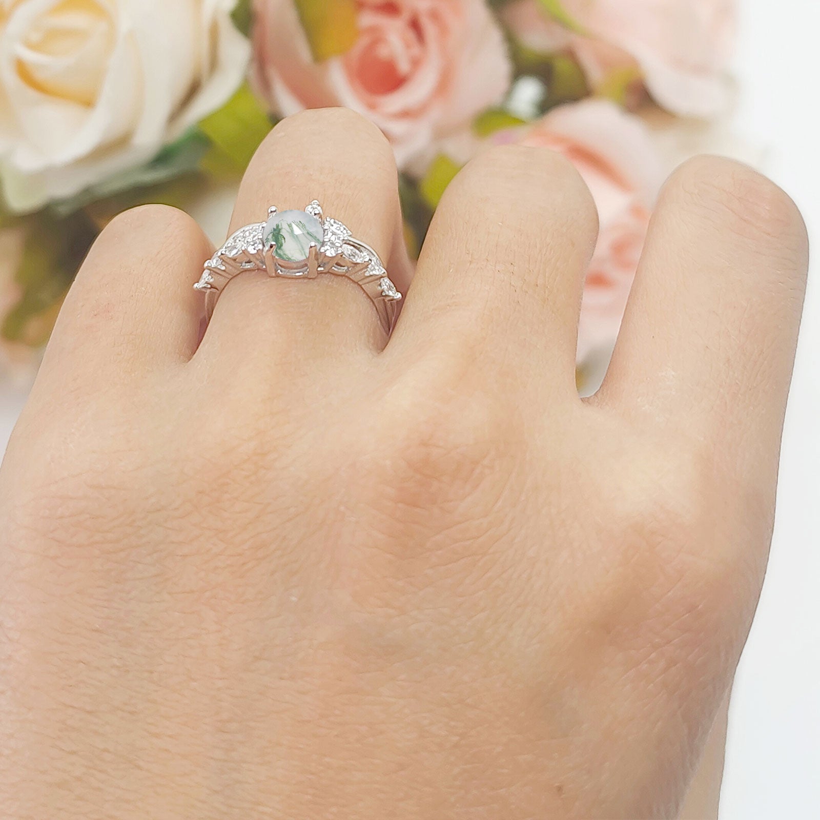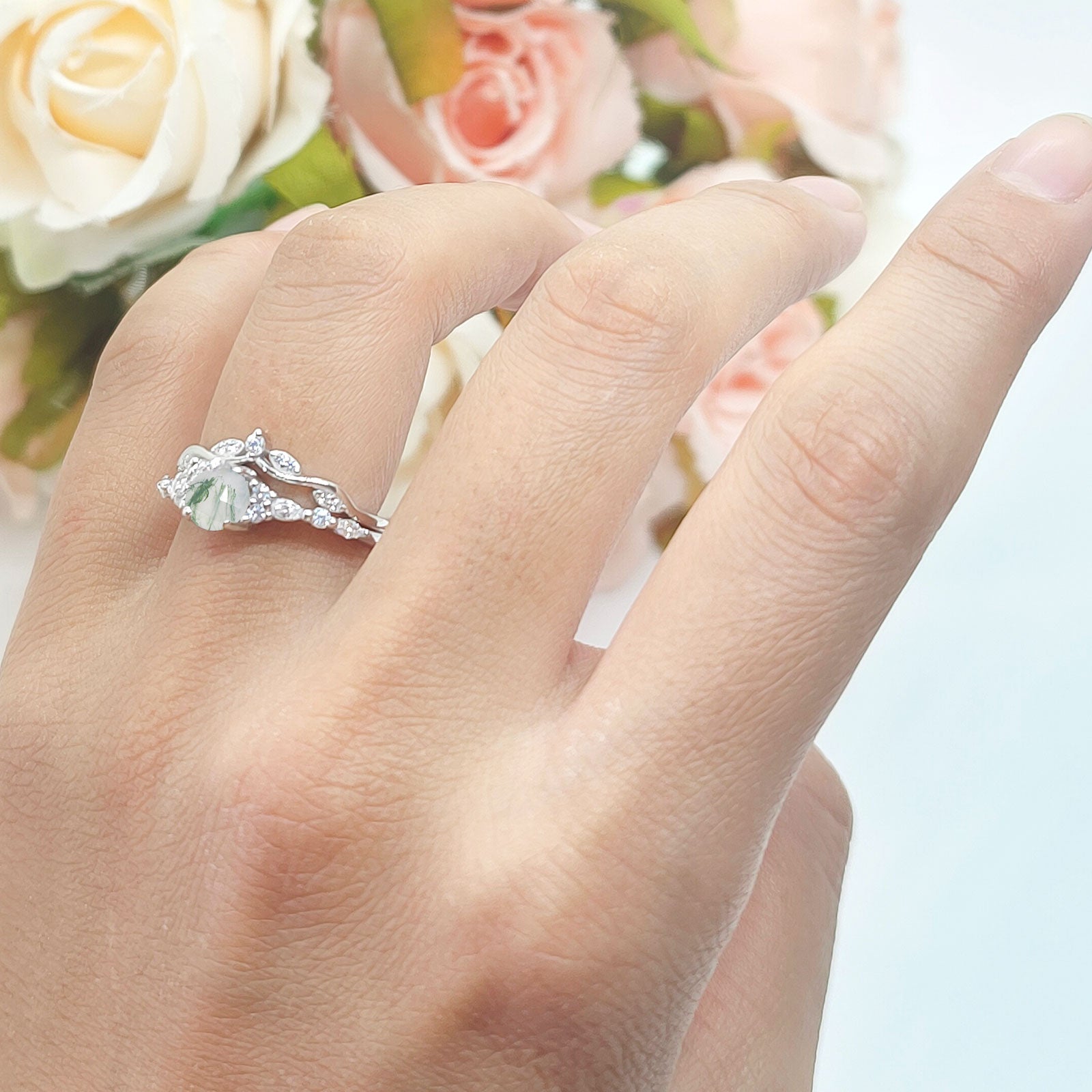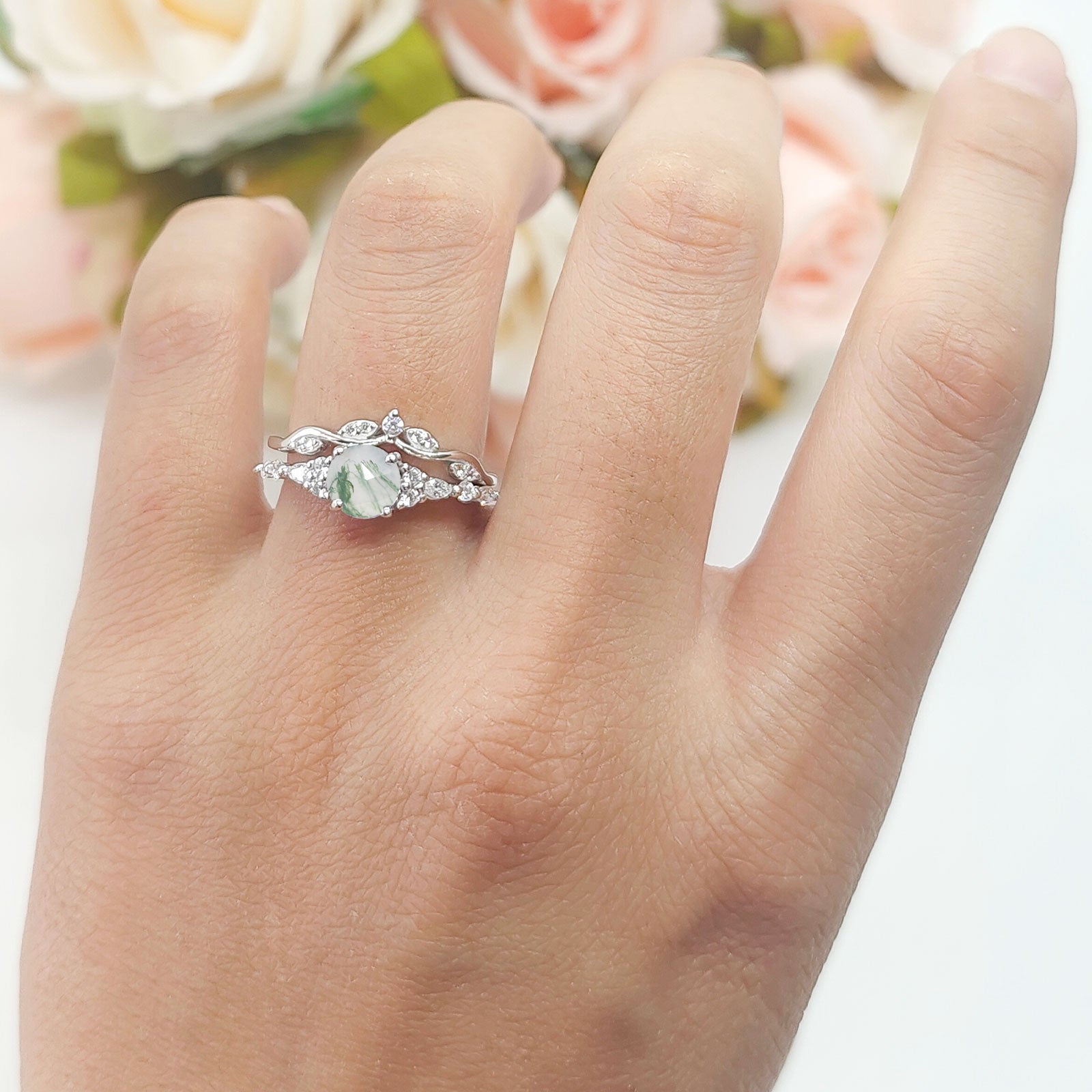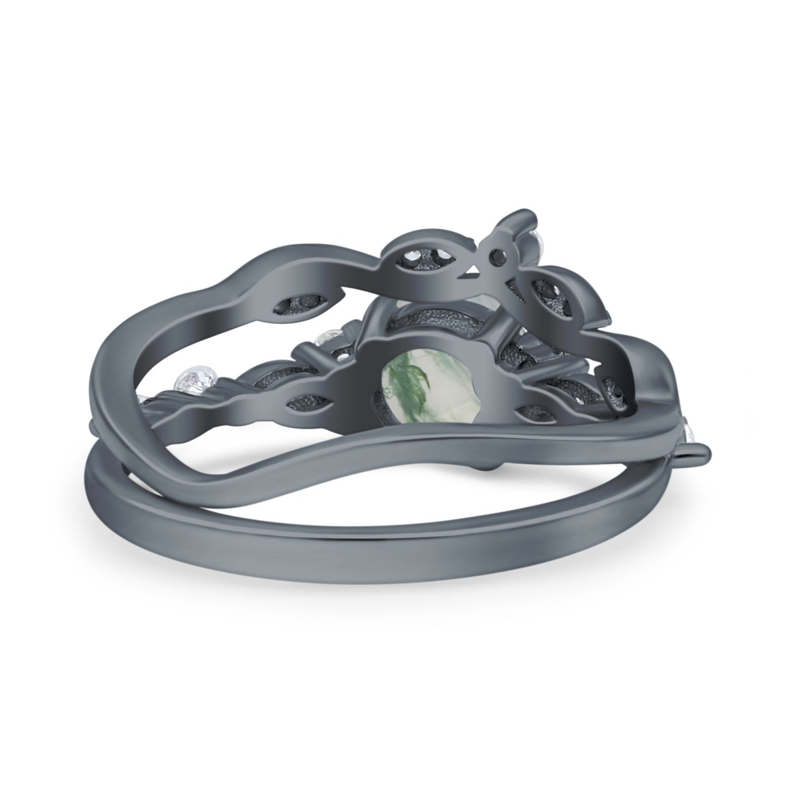 Two Piece Round Natural Green Moss Agate Marquise Style Bridal Ring 925 Sterling Silver