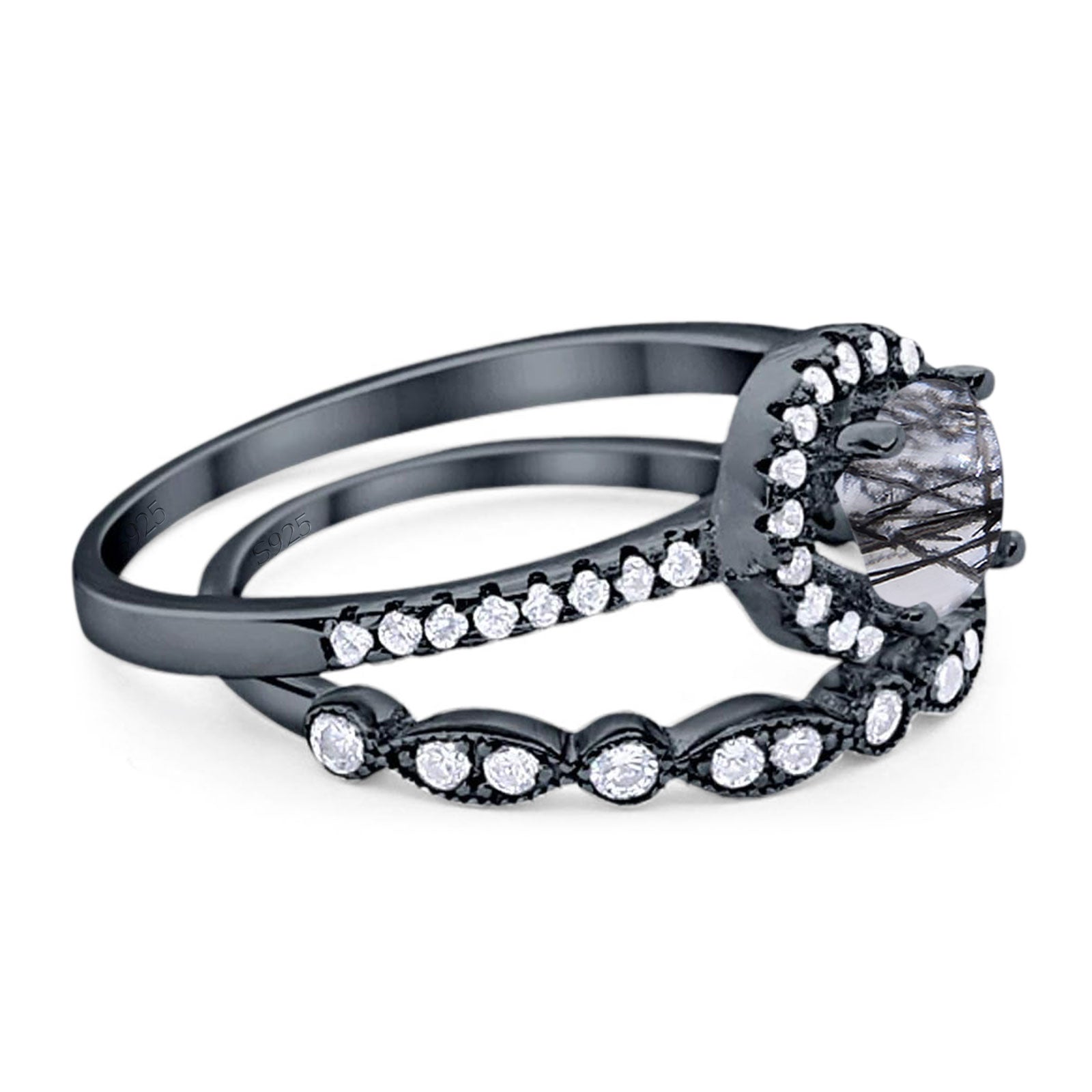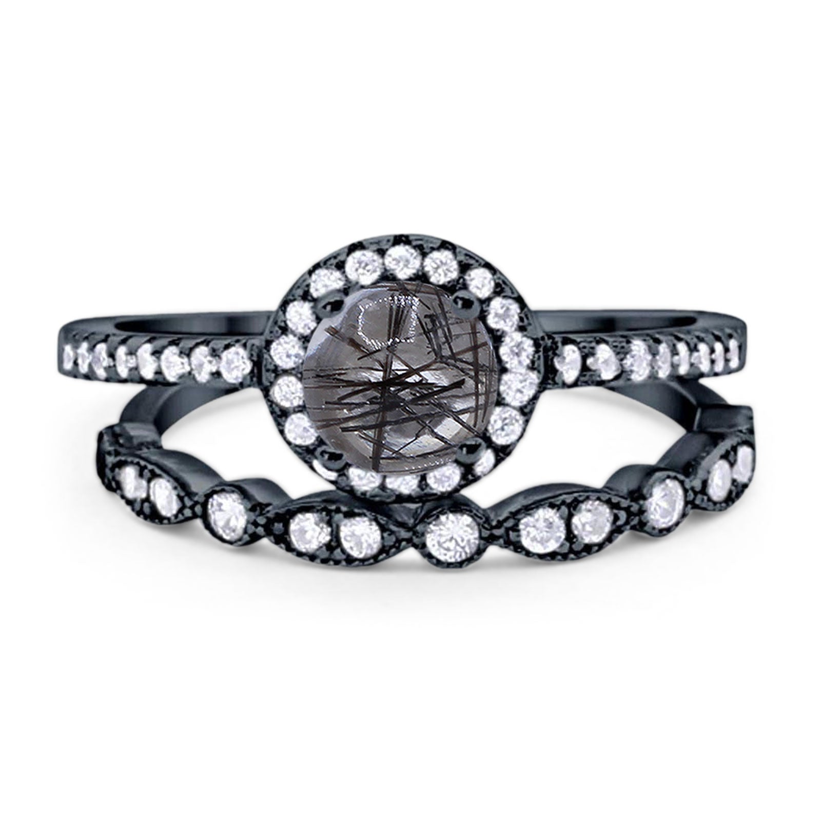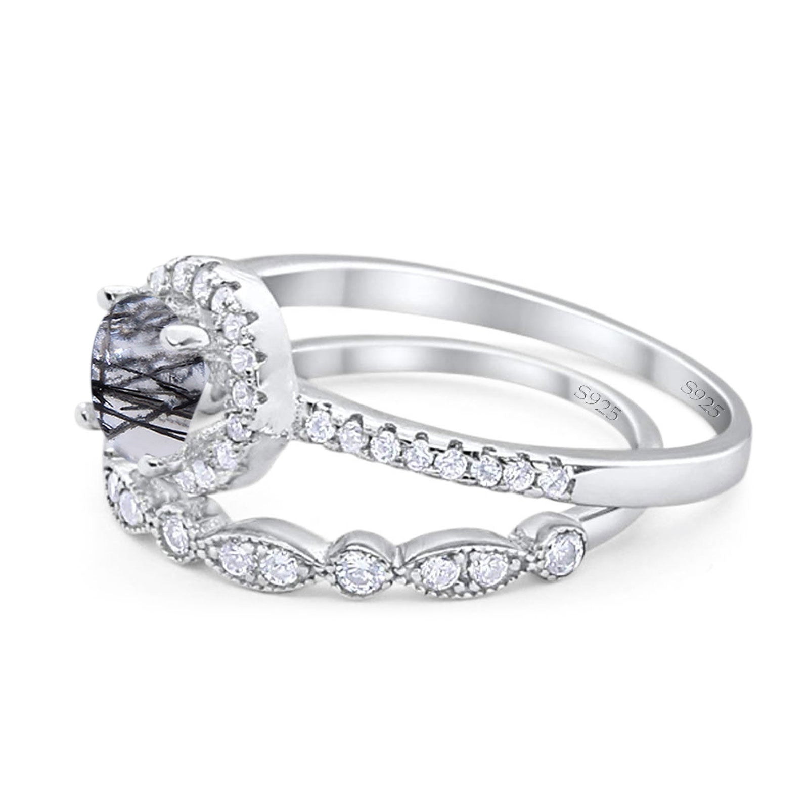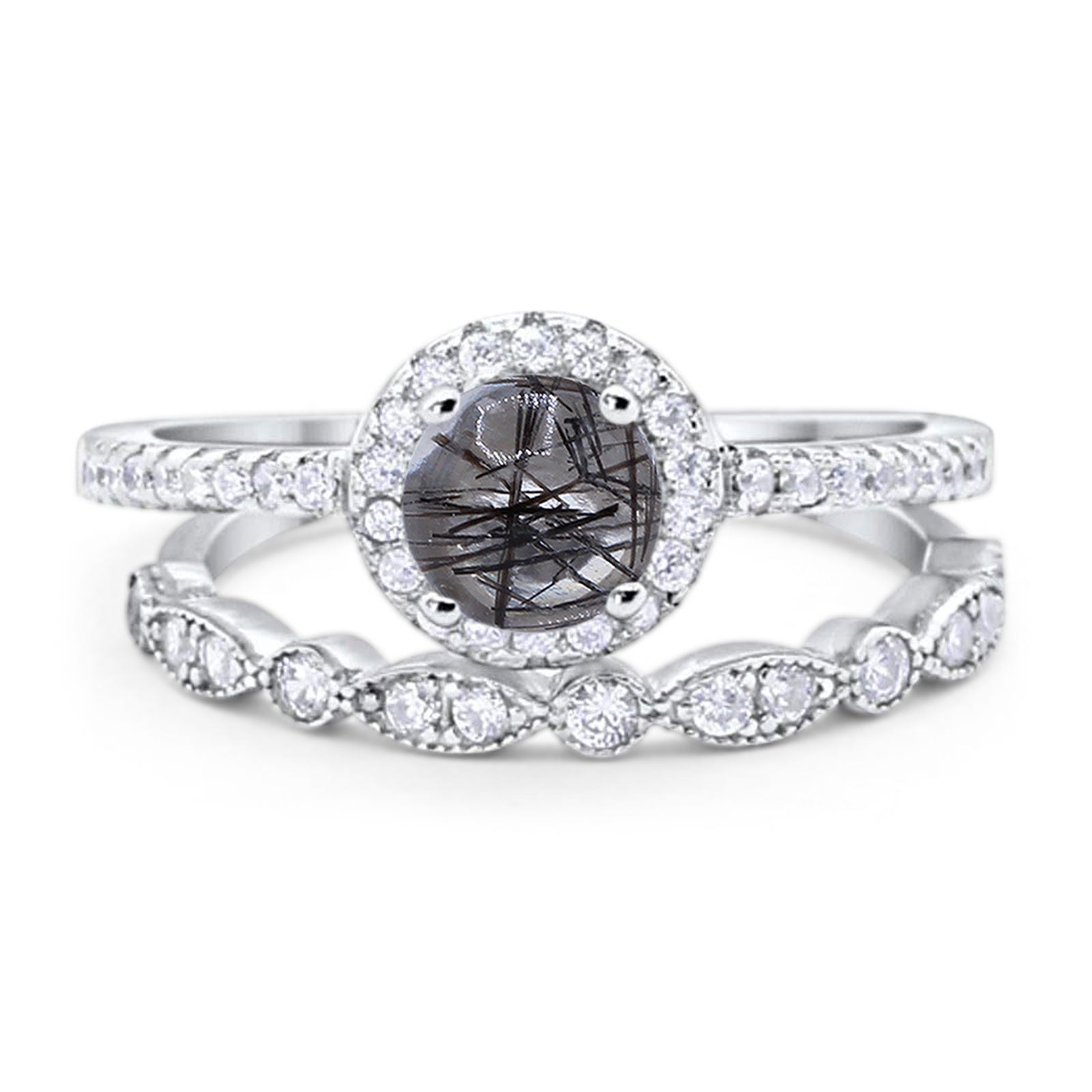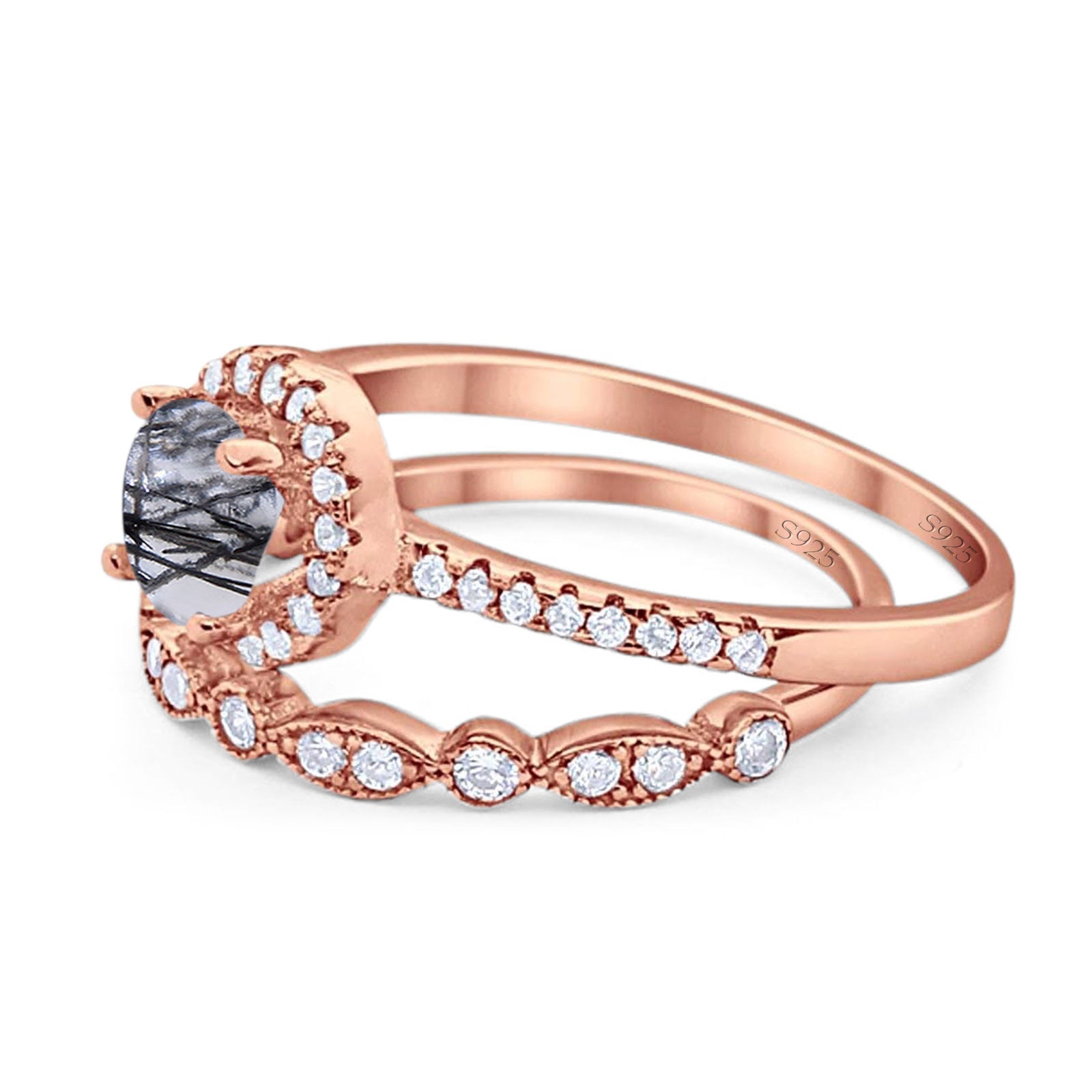Two Piece Round Natural Rutilated Quartz Bridal Ring 925 Sterling Silver