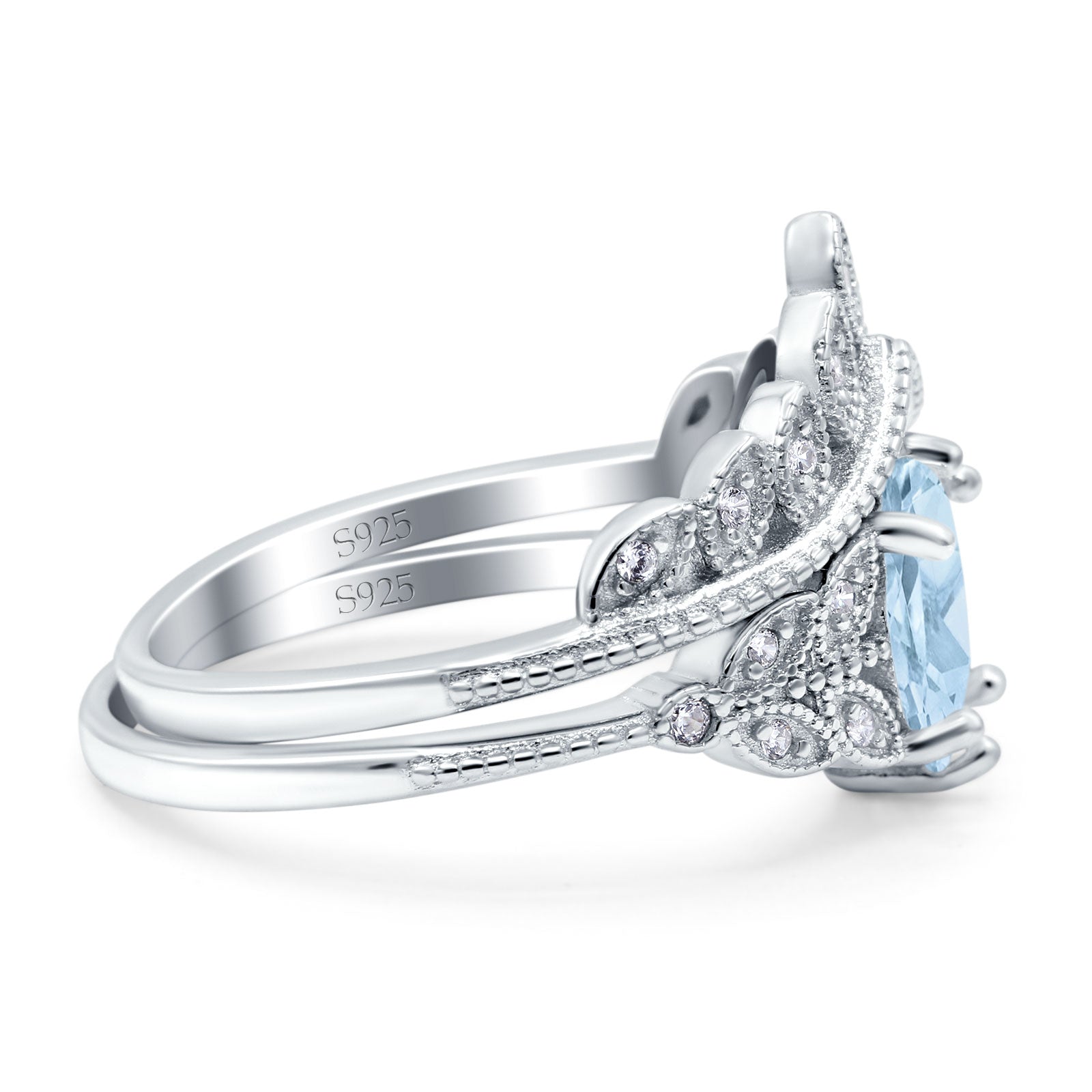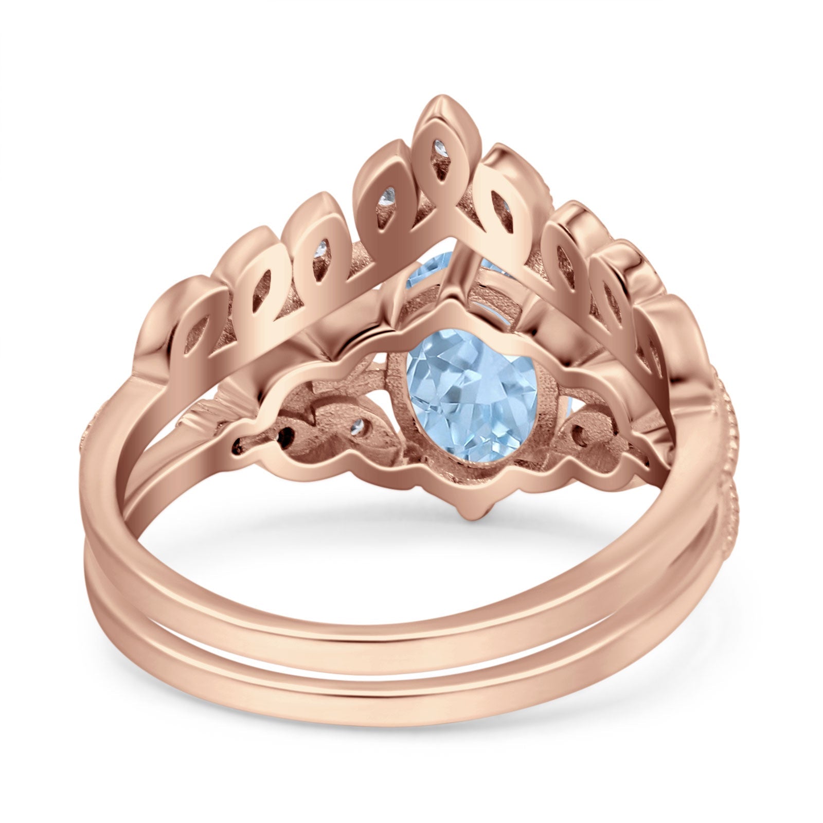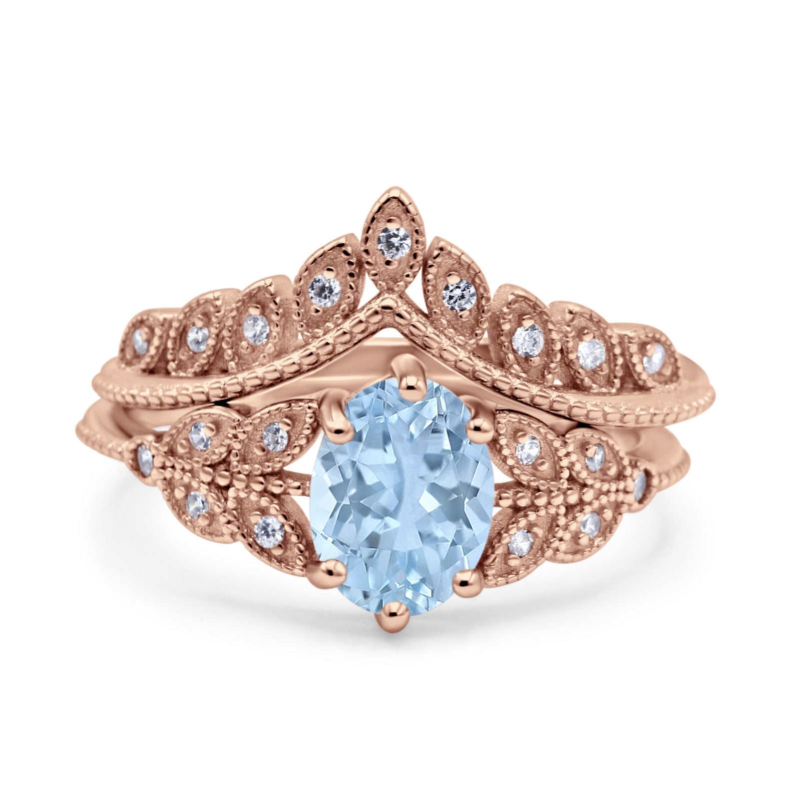 Vintage Oval Natural Aquamarine Leaf Style Chevron Two Piece Ring 925 Sterling Silver