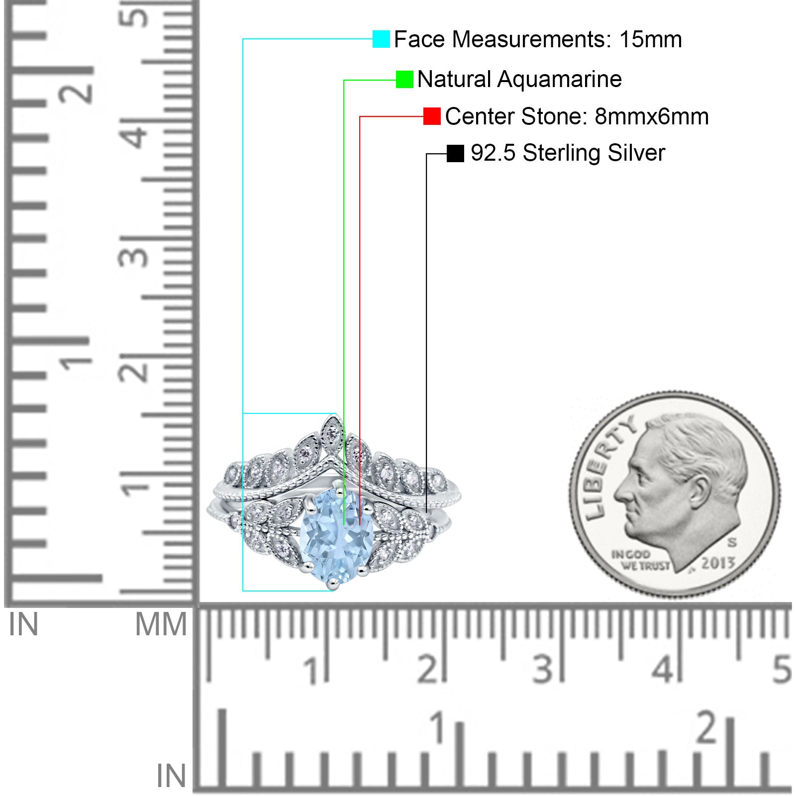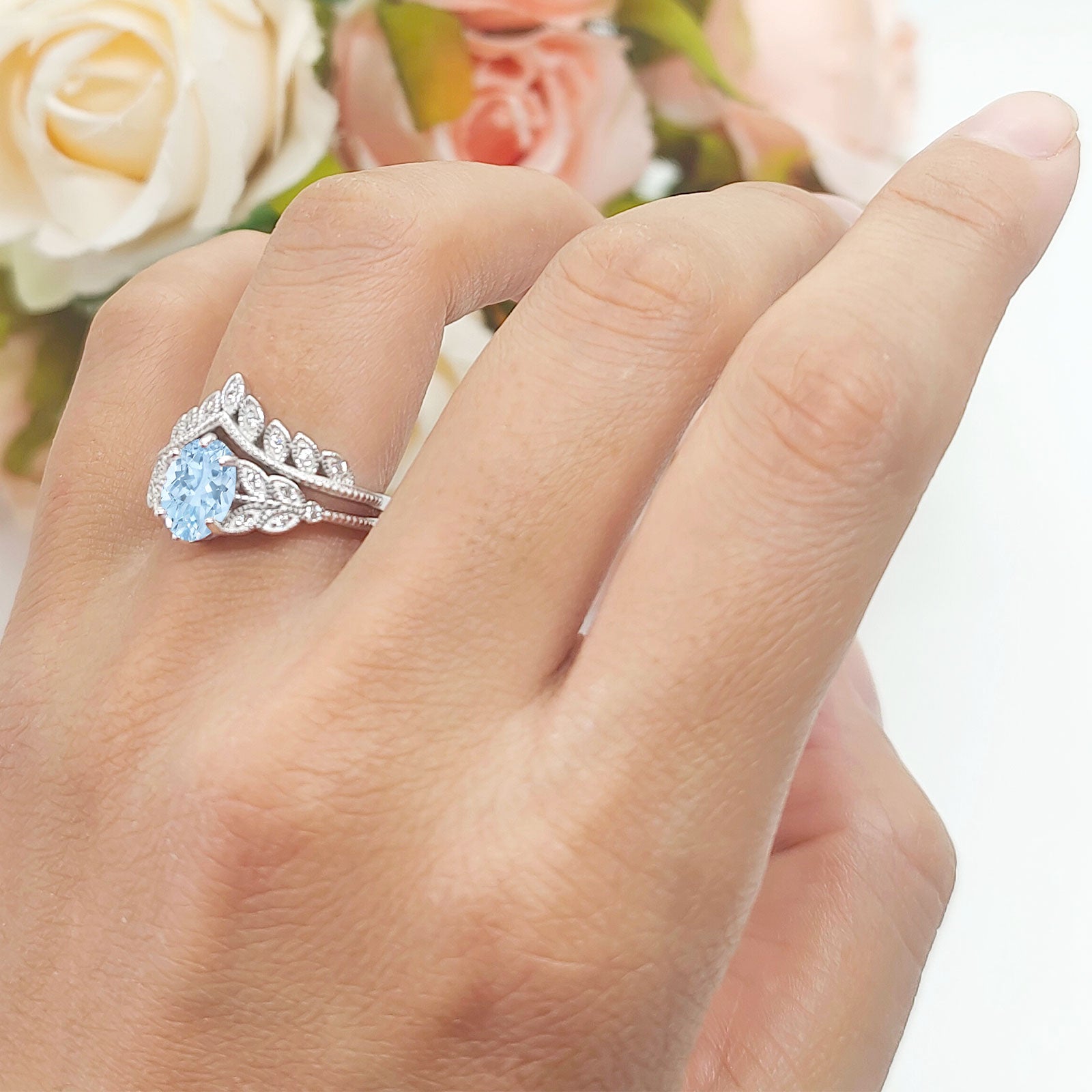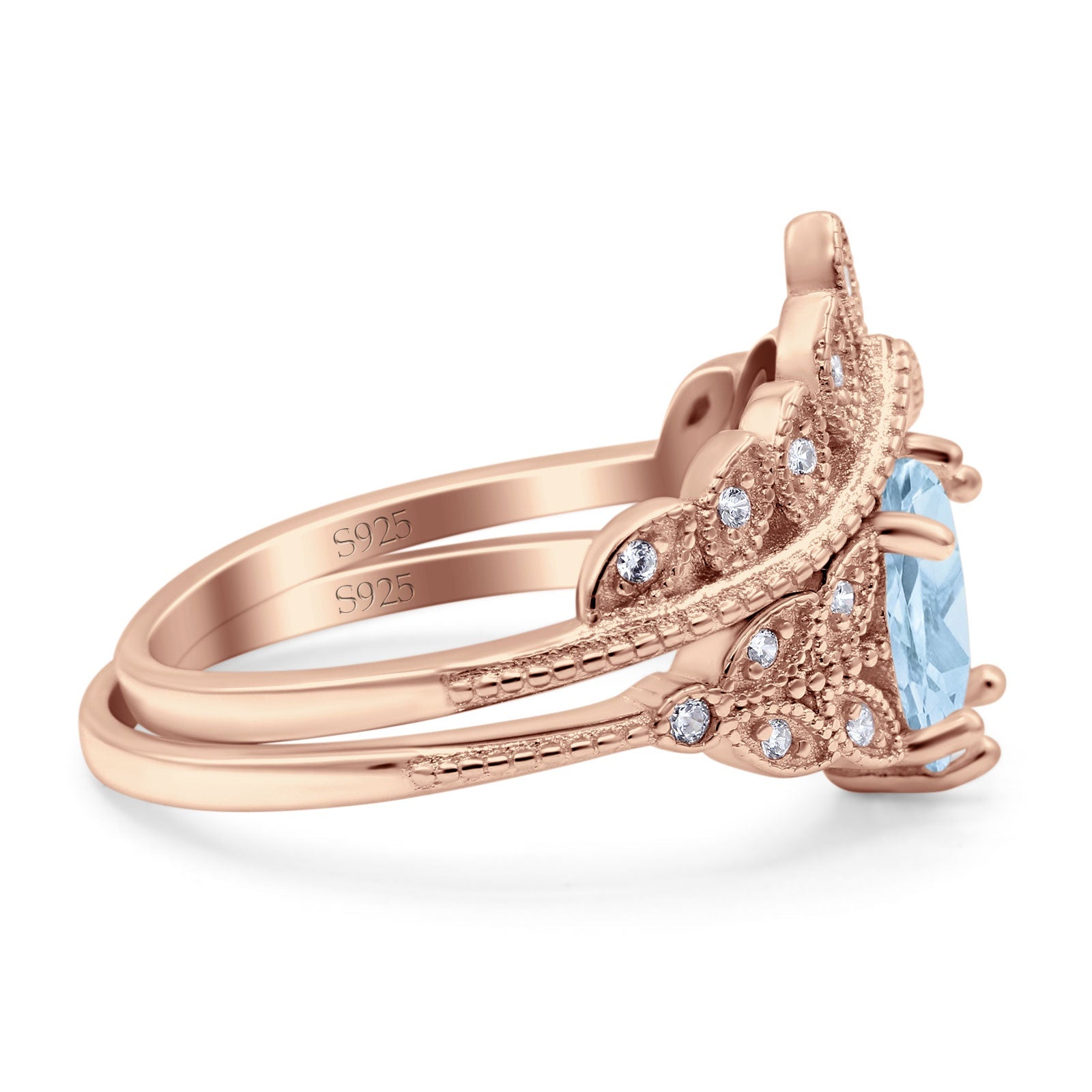 Vintage Oval Natural Aquamarine Leaf Style Chevron Two Piece Ring 925 Sterling Silver