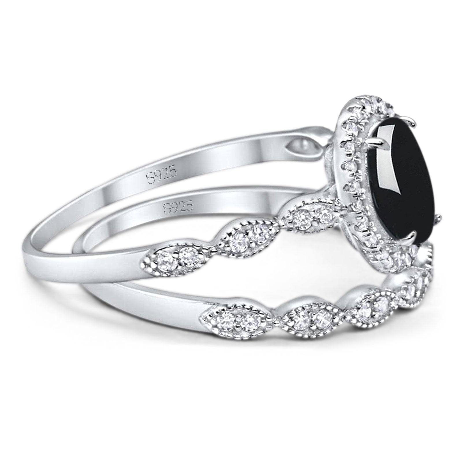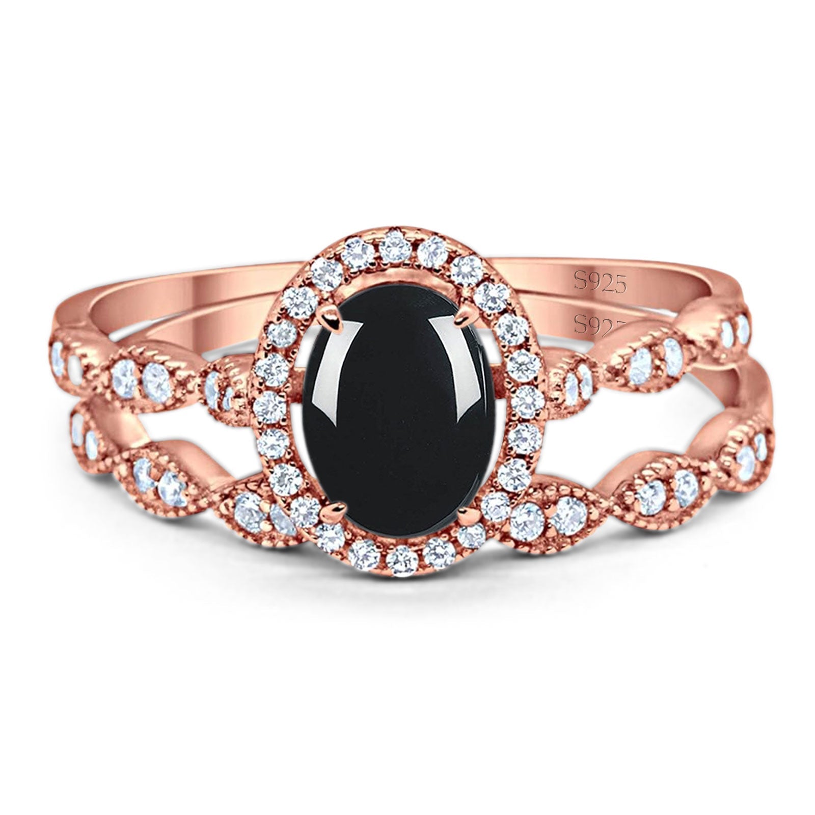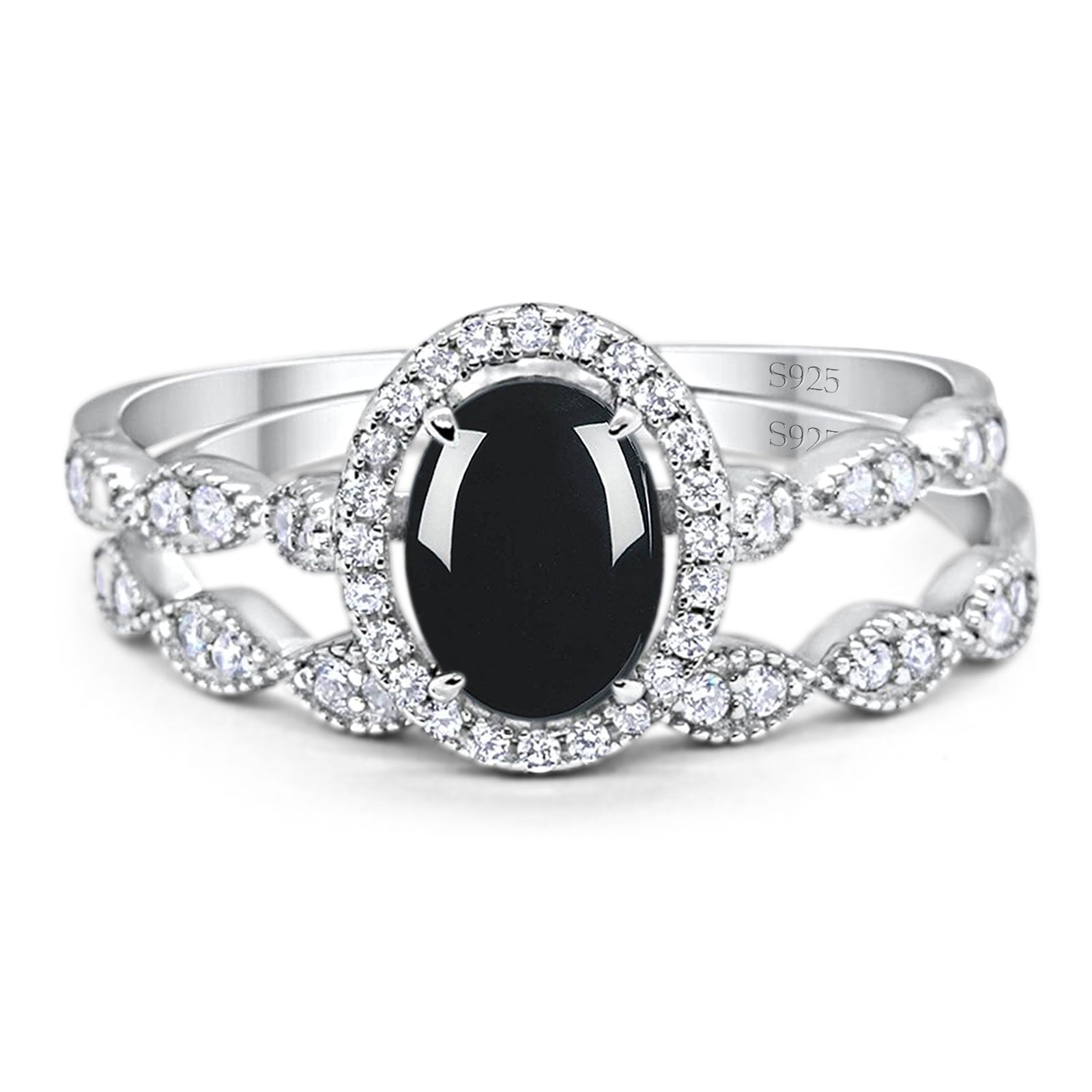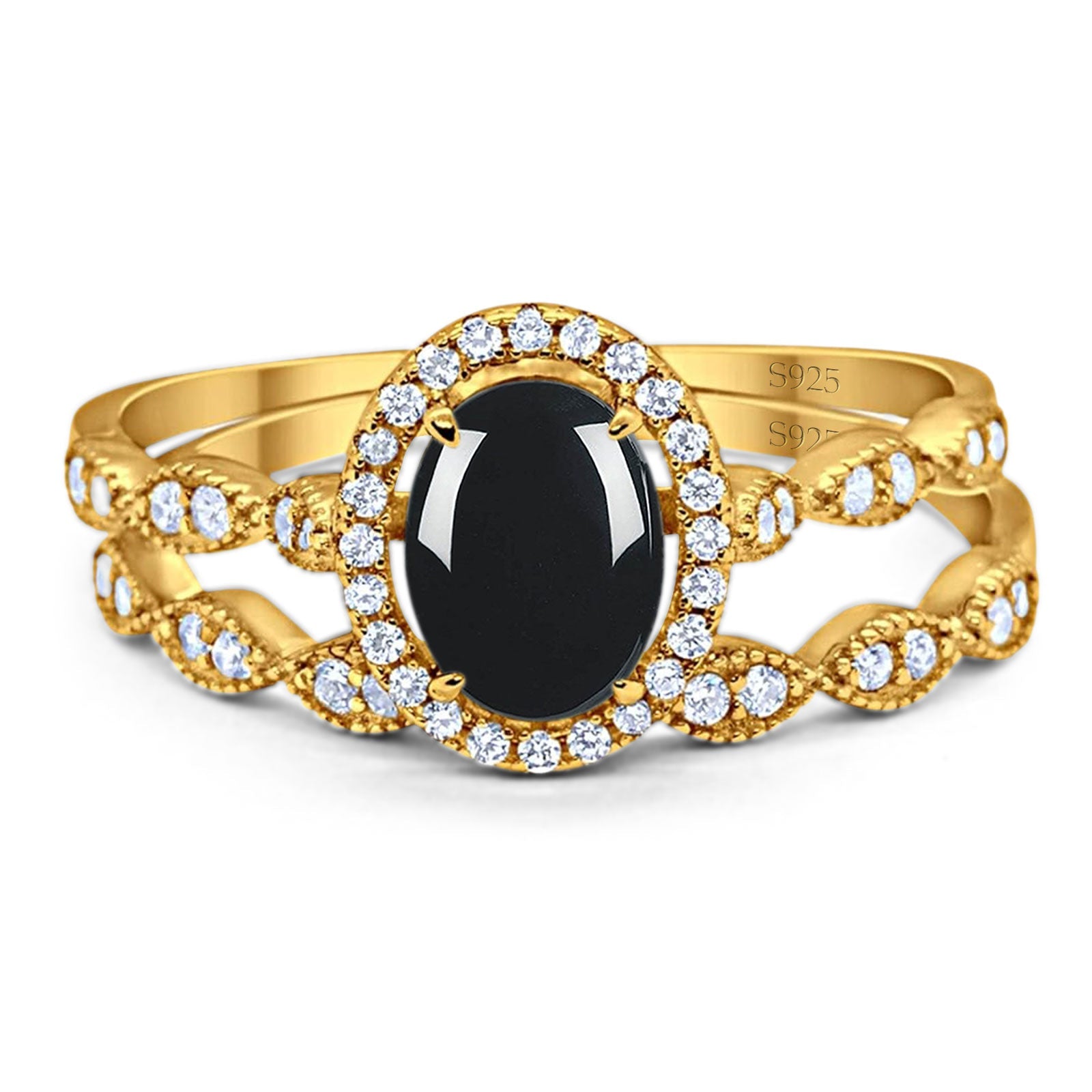 Vintage Style Two Piece Oval Natural Black Onyx Bridal Set Ring 925 Sterling Silver