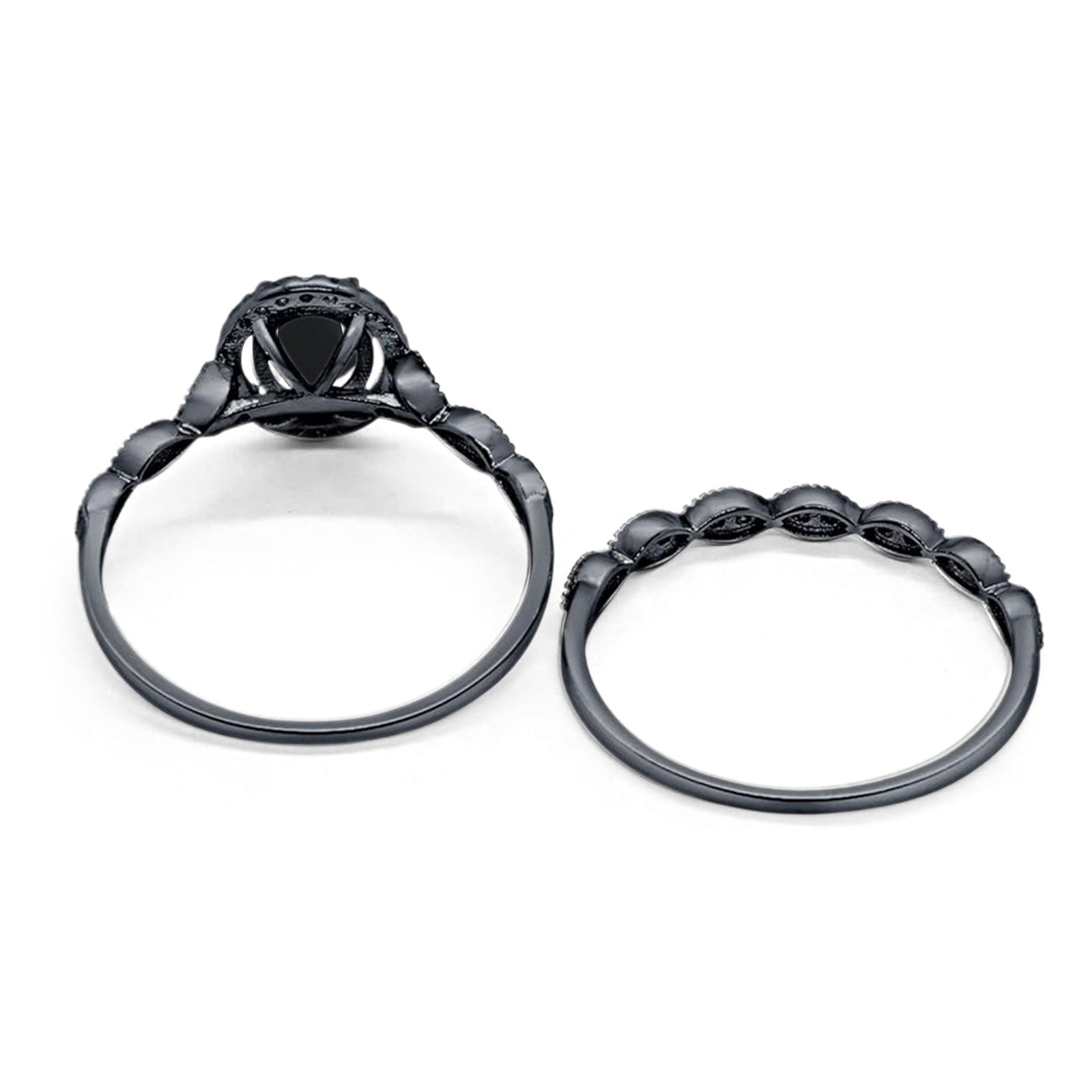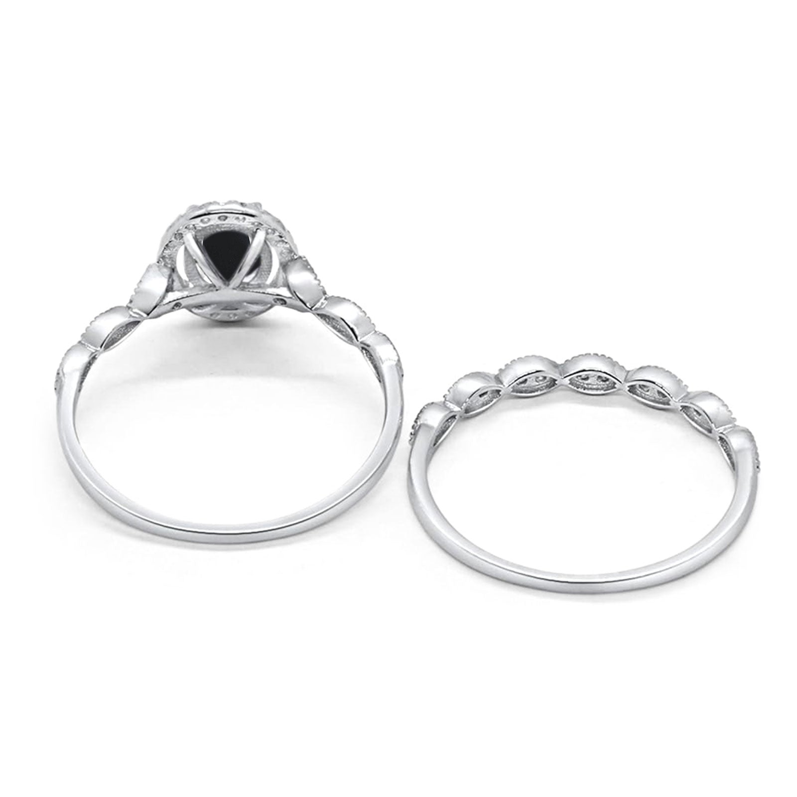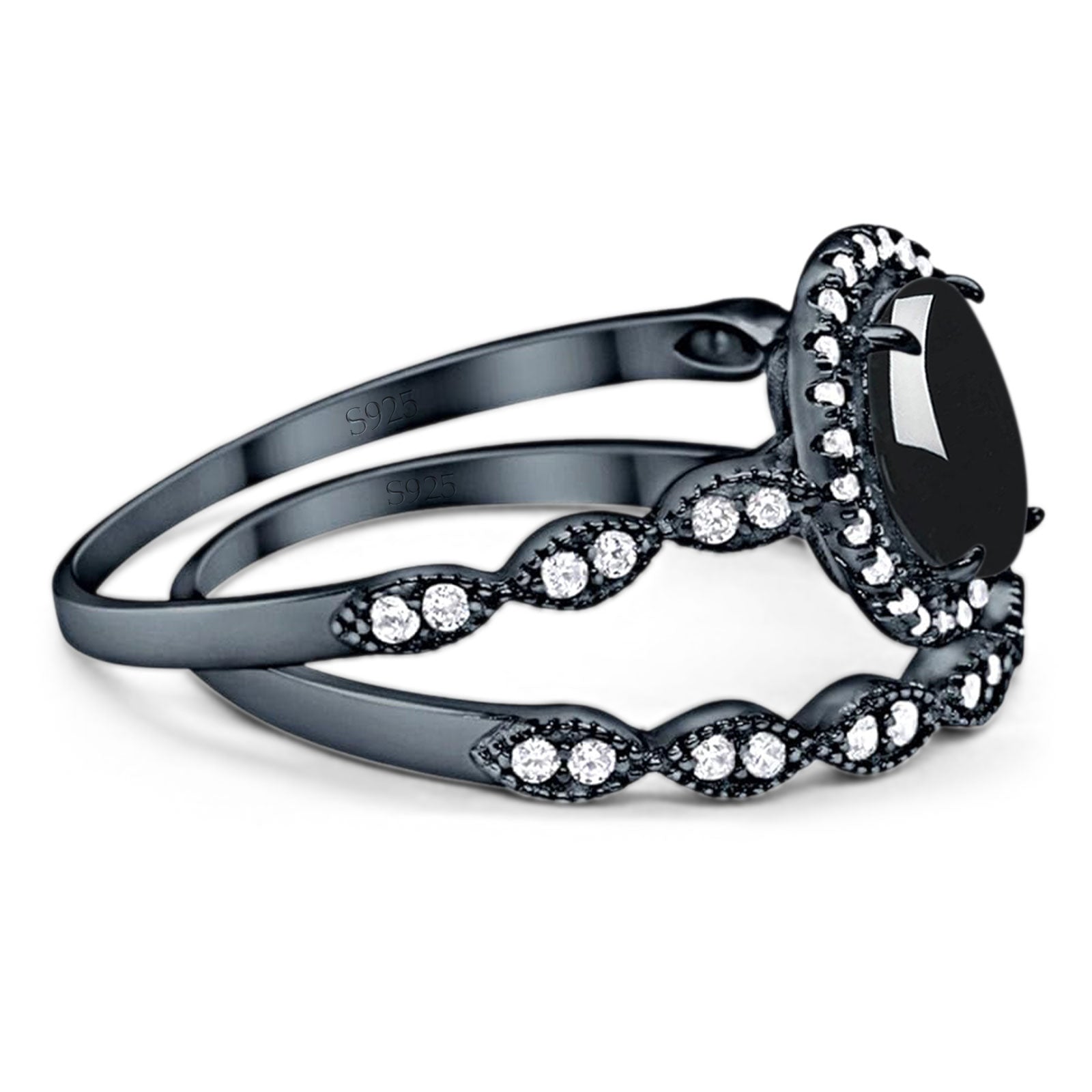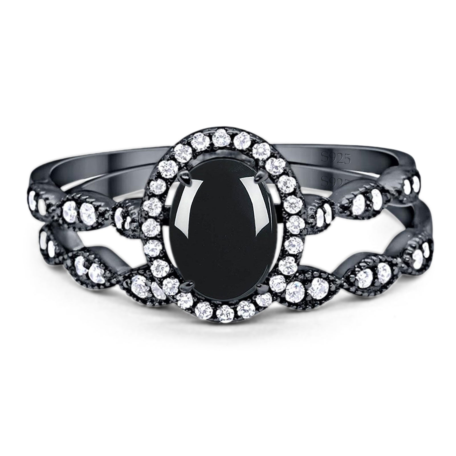 Vintage Style Two Piece Oval Natural Black Onyx Bridal Set Ring 925 Sterling Silver