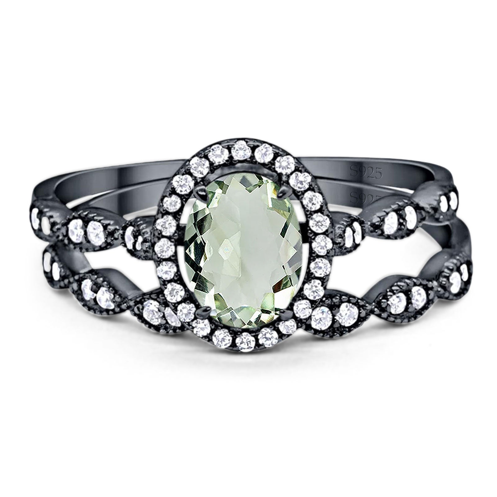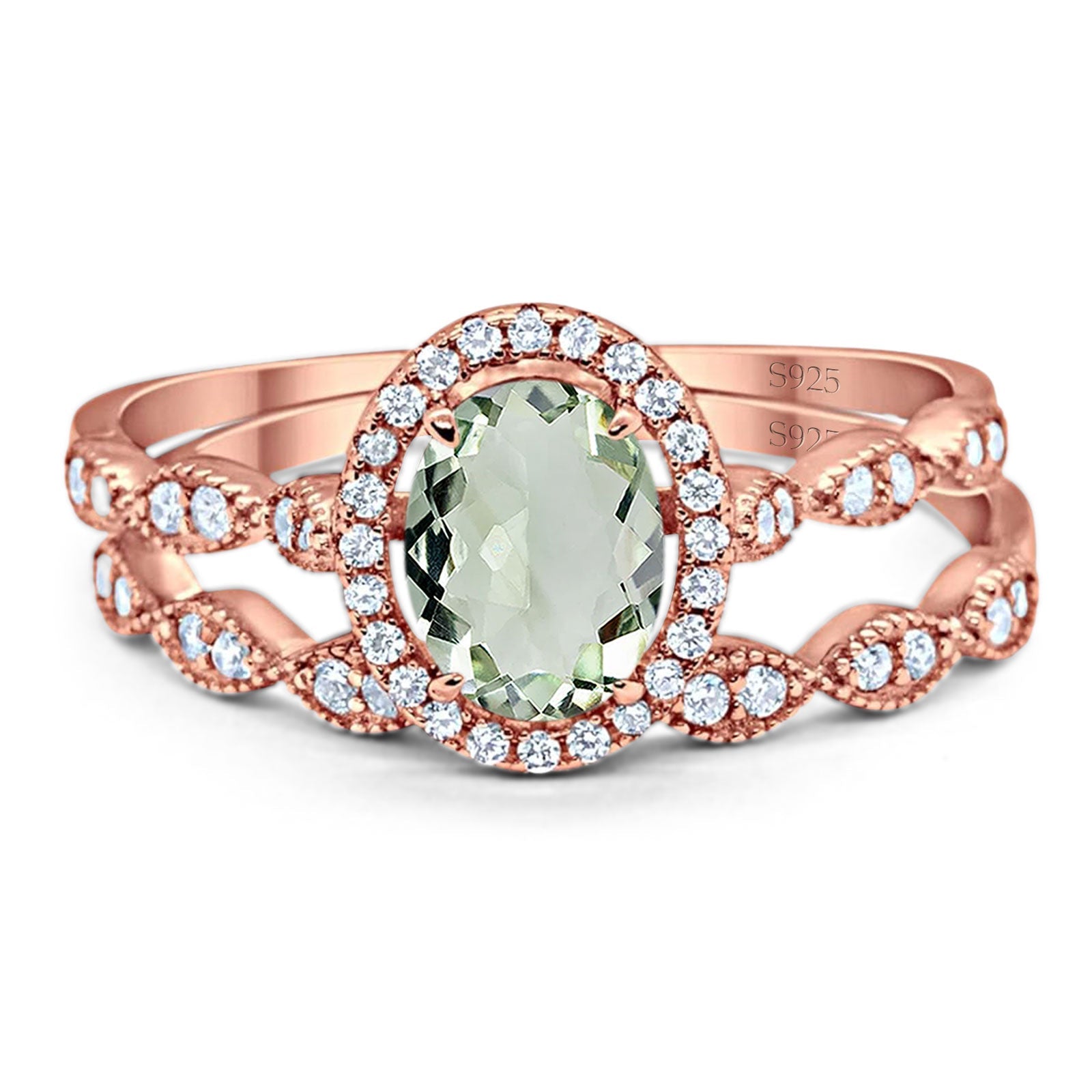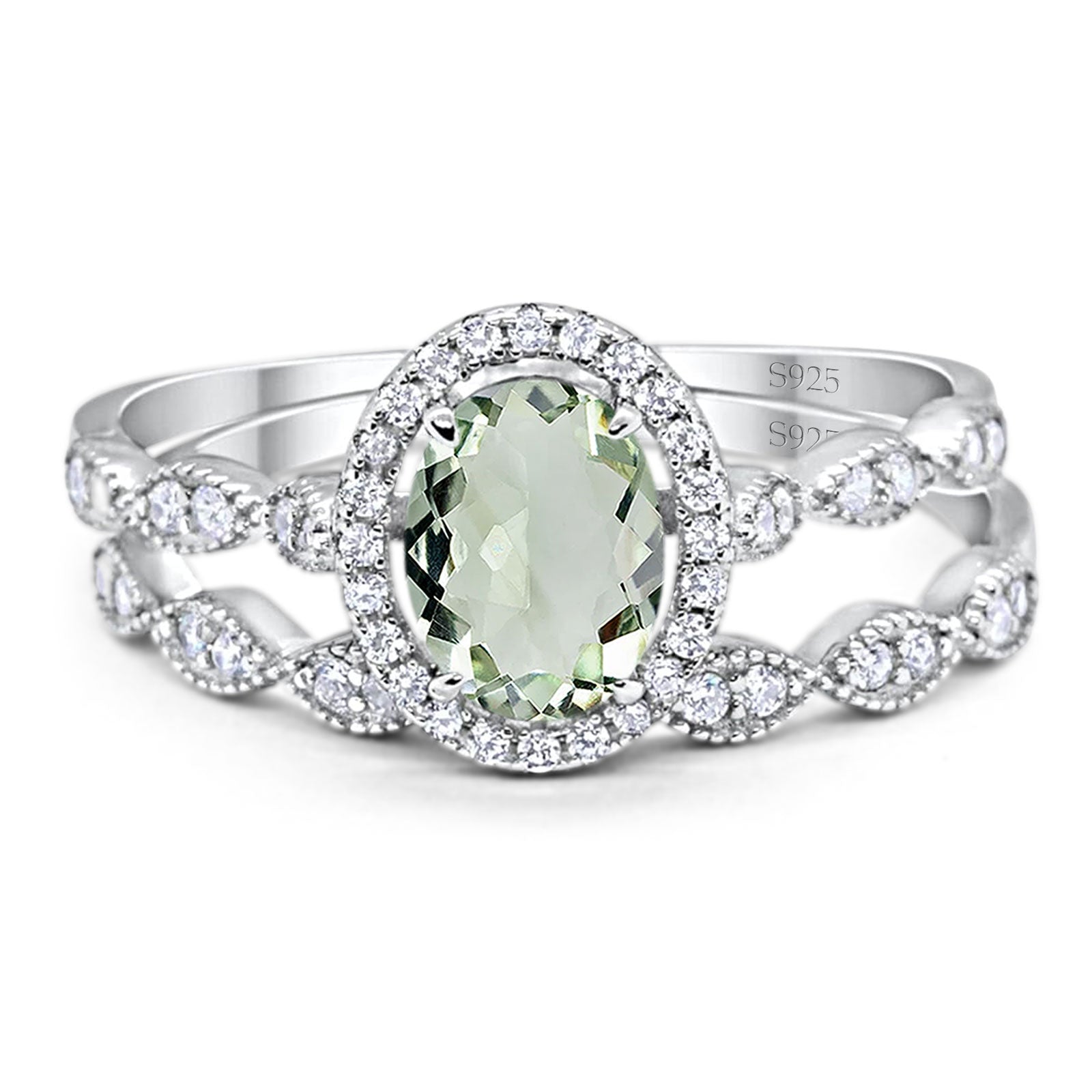 Vintage Style Two Piece Oval Natural Green Amethyst Prasiolite Bridal Set Ring 925 Sterling Silver