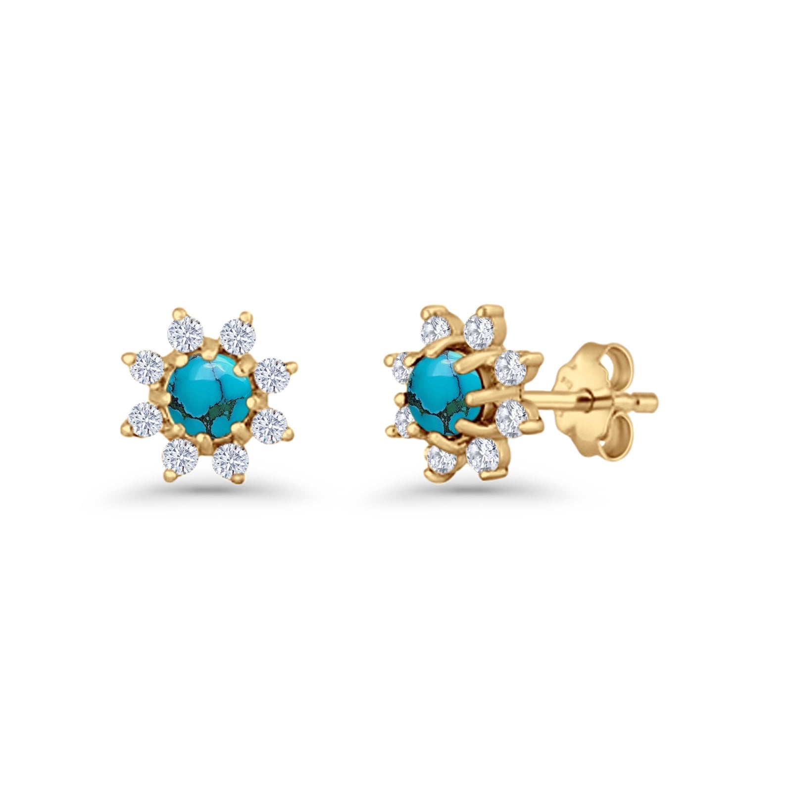 Minimalist 8.2mm Floral Stud Earrings Turquoise & Cubic Zirconia 925 Sterling Silver
