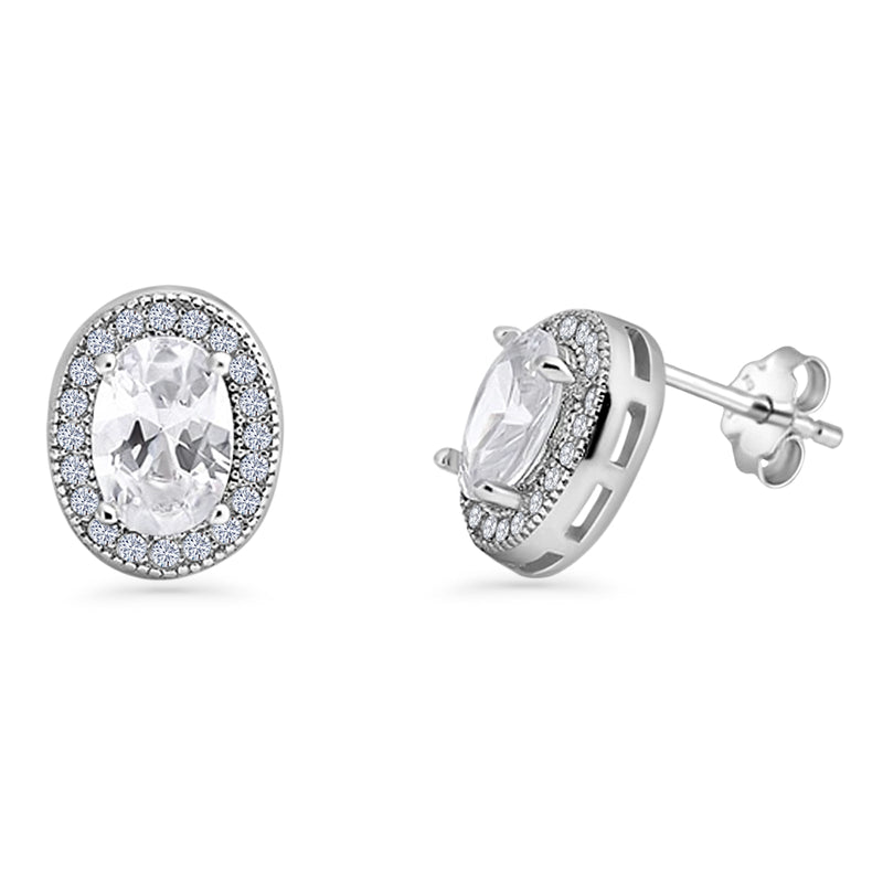 Vintage Style 10mm Oval Stud Earring Halo Cubic Zirconia 925 Sterling Silver