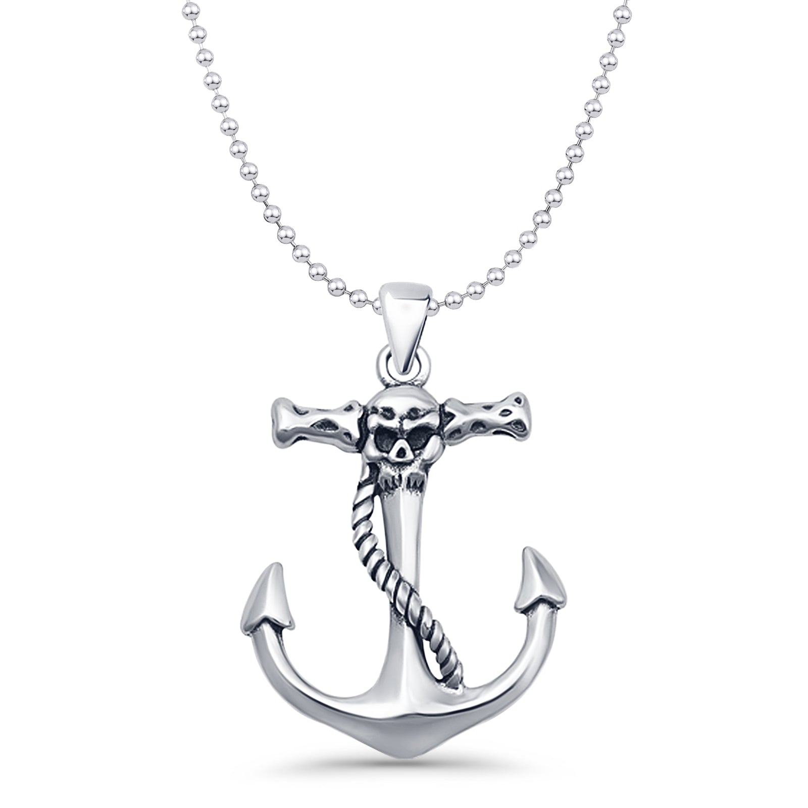 Anchor & Skull Pendant Bead Chain Necklace Oxidized 925 Sterling Silver
