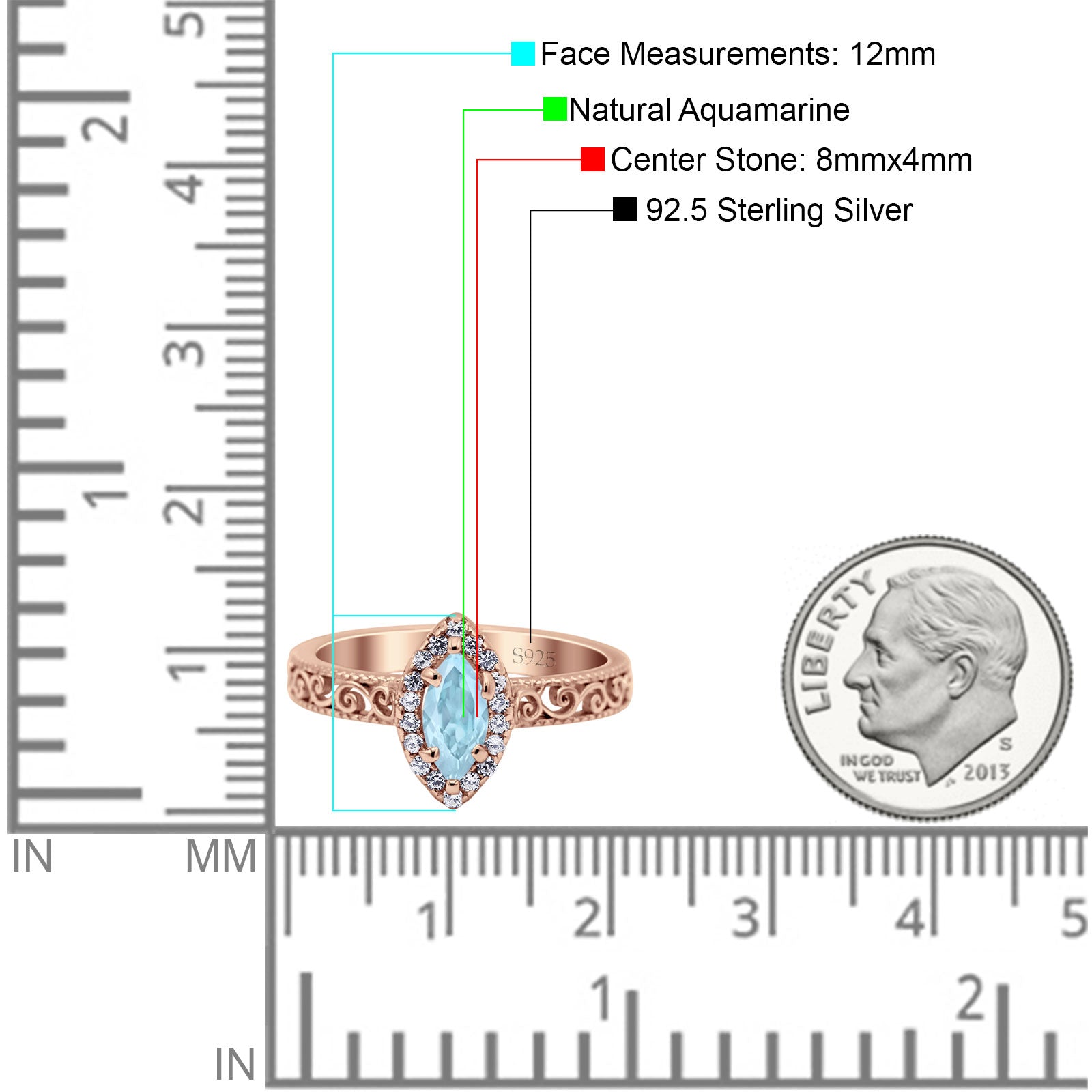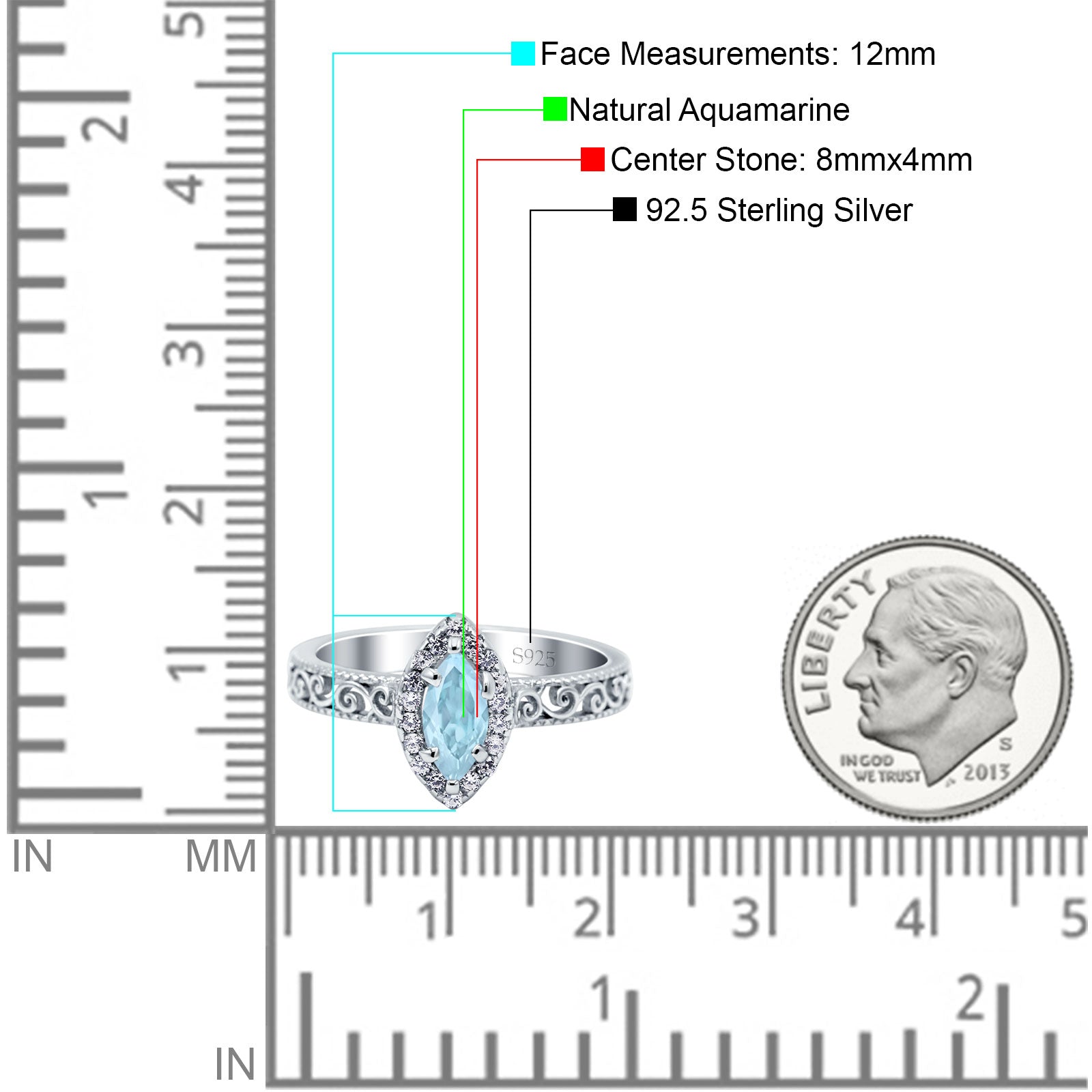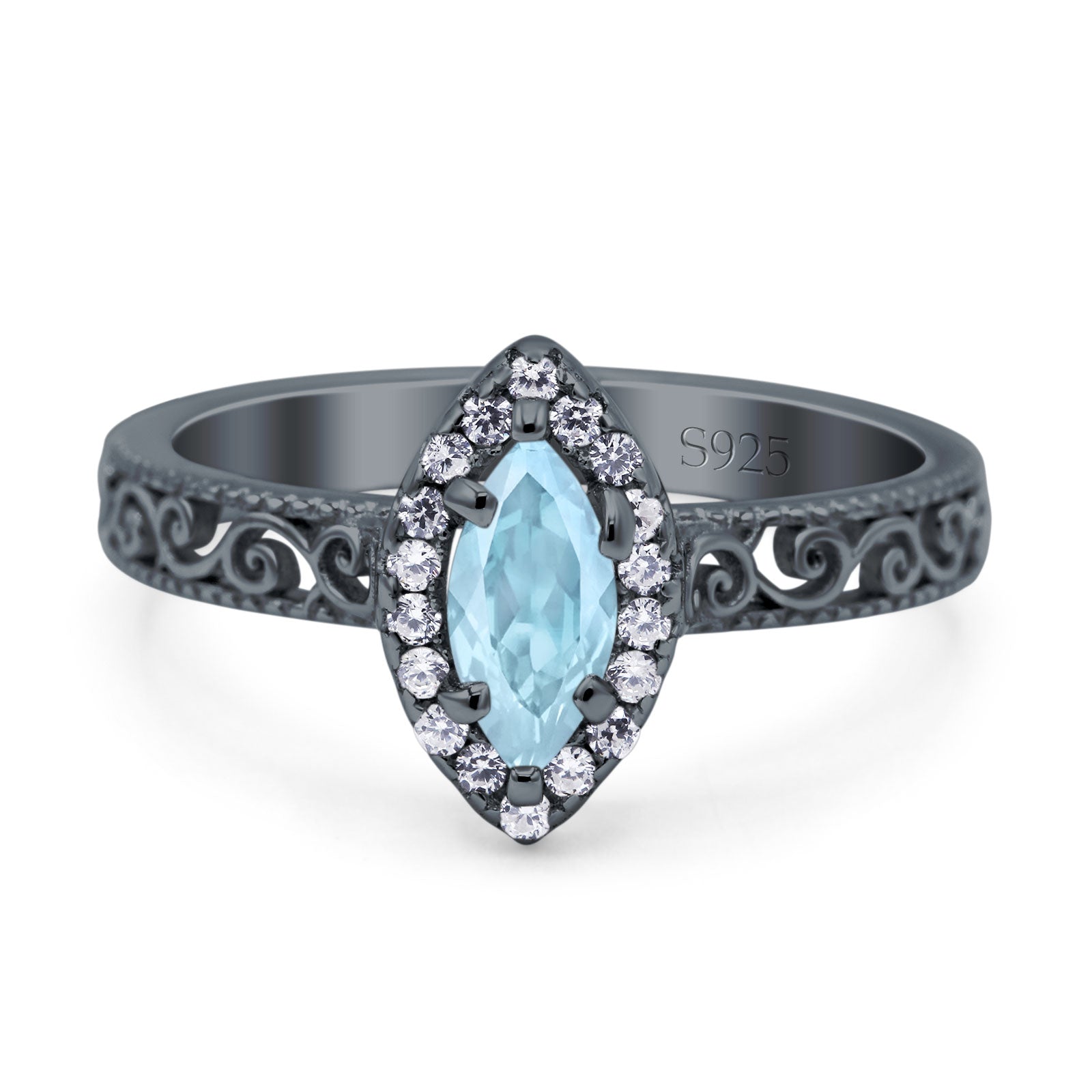 Art Deco Marquise Natural Aquamarine Filigree Band Halo Ring 925 Sterling Silver