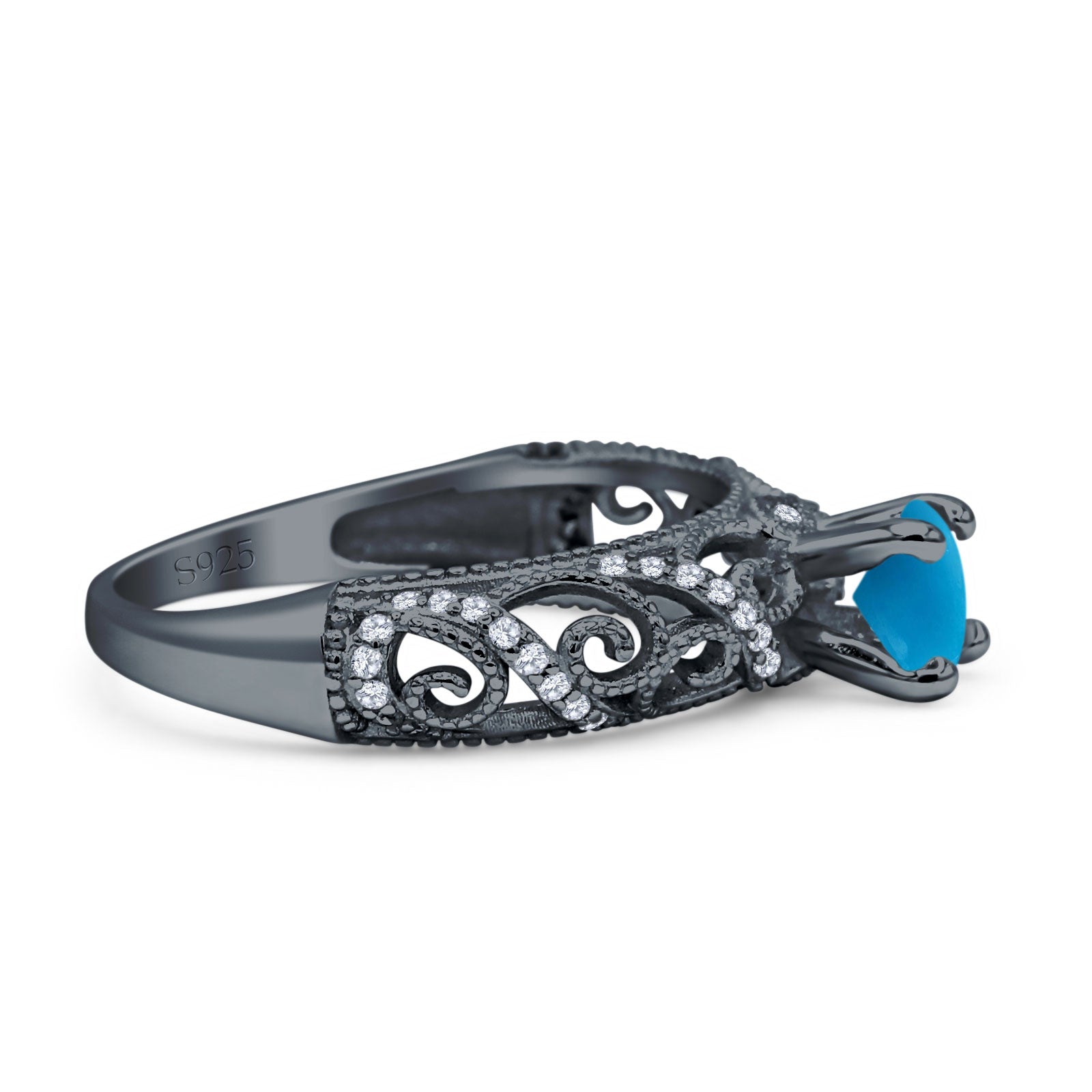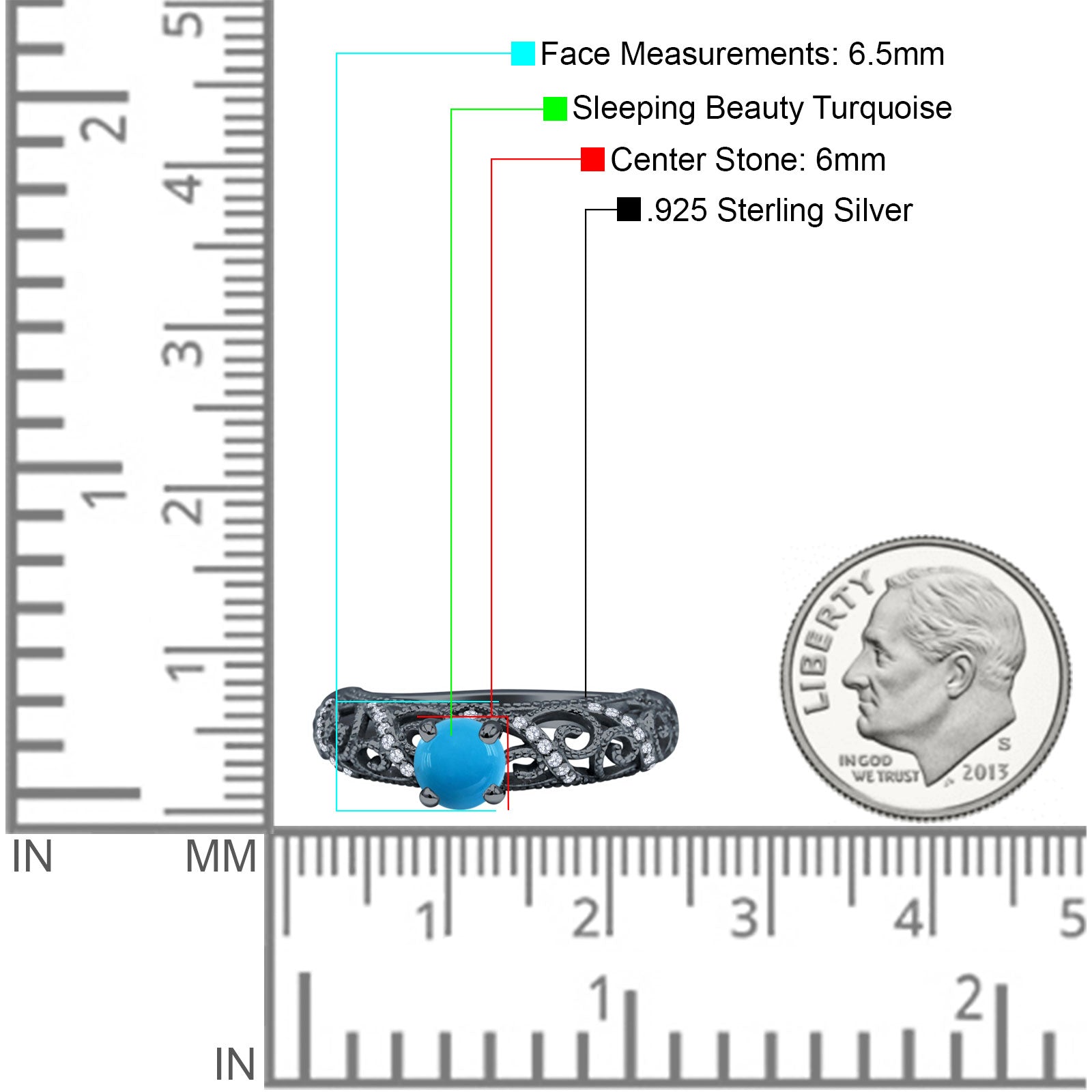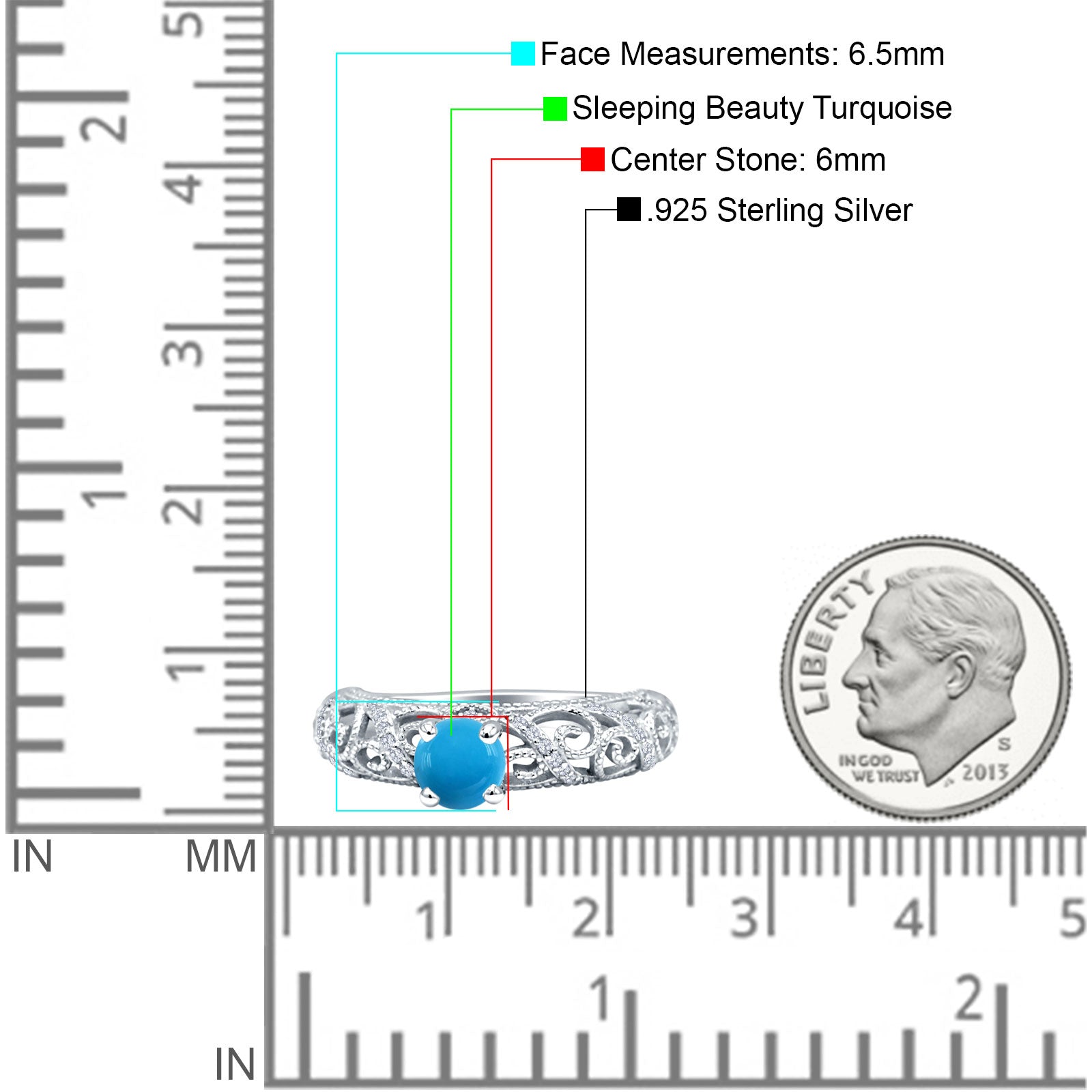 Art Deco Round Genuine Natural Arizona Sleeping Beauty Turquoise Filigree Ring 925 Sterling Silver