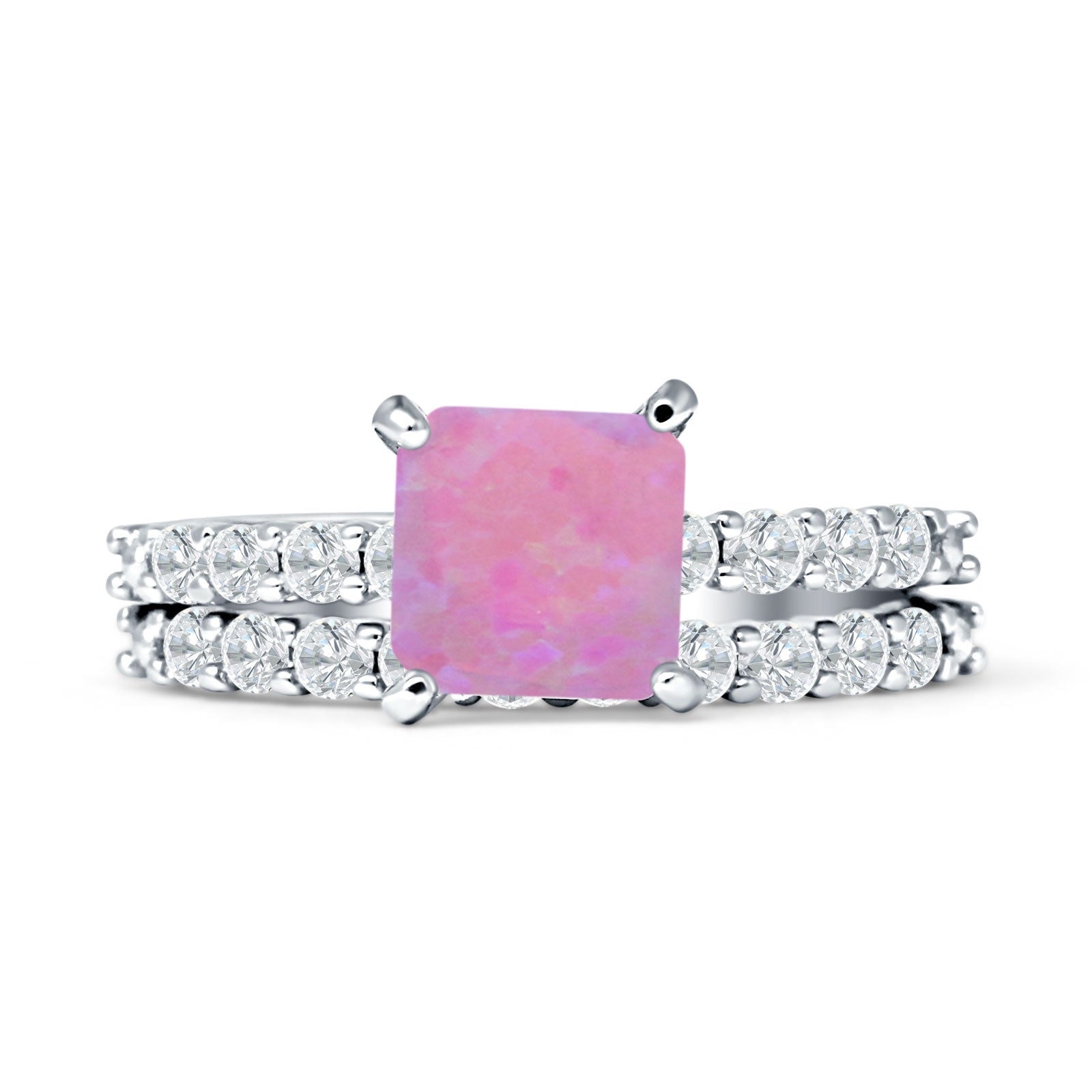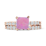 Art Deco 8mm Princess Cut Lab Created Pink Opal Stackable Ring 925 Sterling Silver