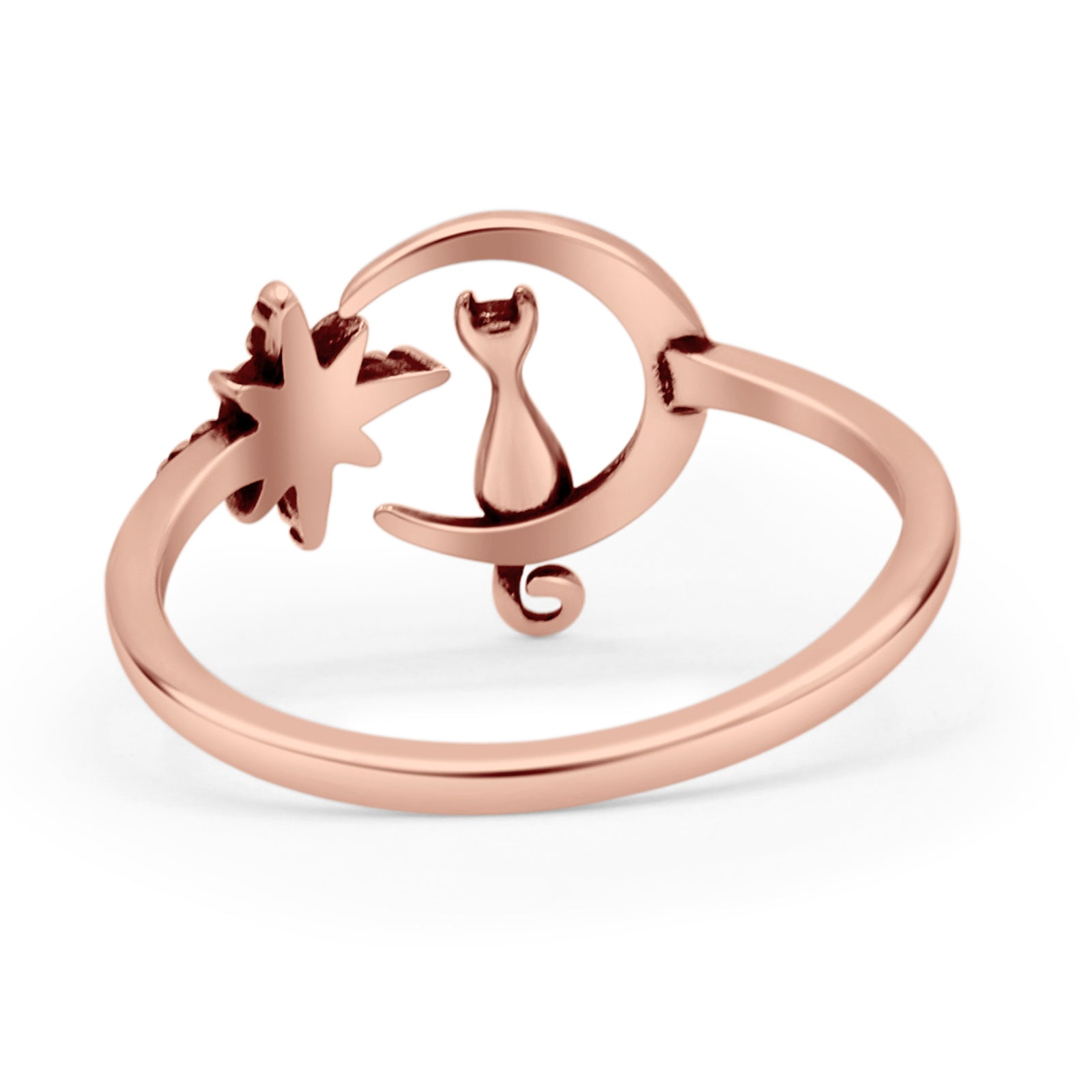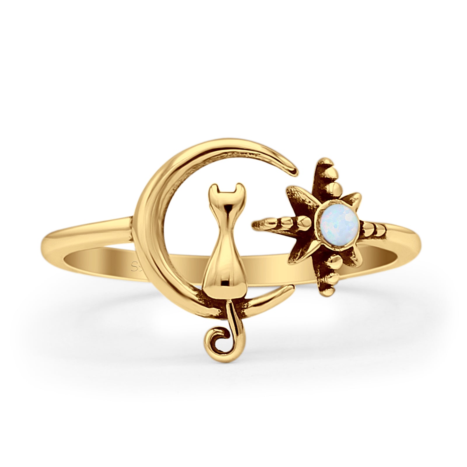 Minimalist 11.5mm Lab Created White Opal Cat On Moon & Star Ring 925 Sterling Silver