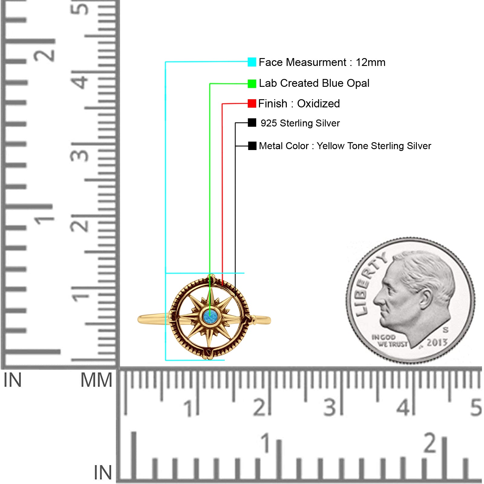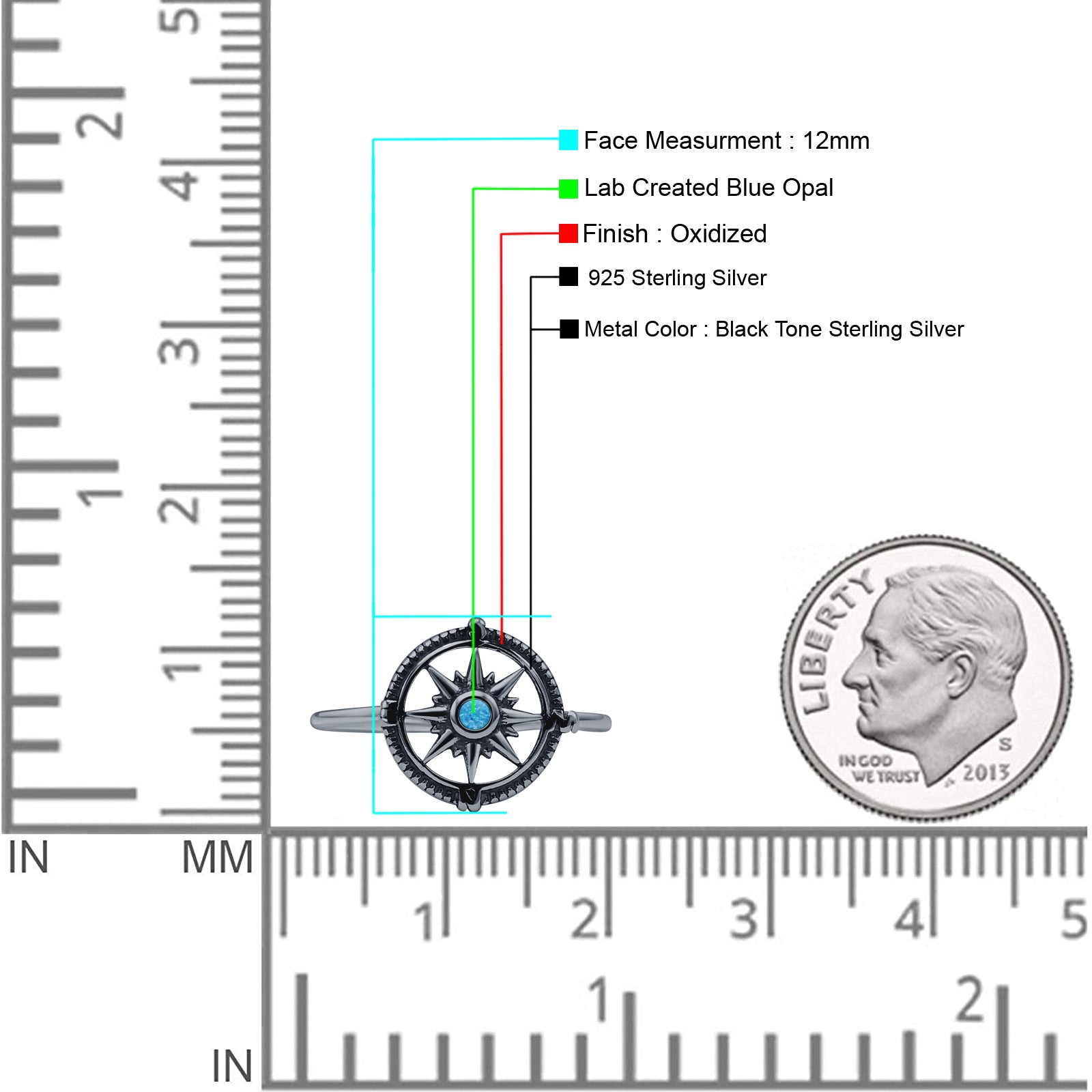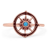 Minimalist 12mm Round Lab Created Blue Opal Compass Ring Oxidized 925 Sterling Silver
