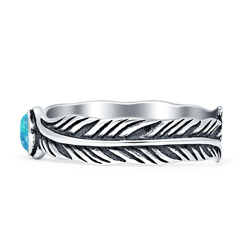 Vintage Style 5mm Round Lab Created Blue Opal Feather Ring Oxidized 925 Sterling Silver