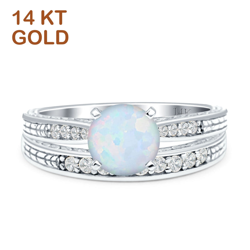 14K White Gold Round Two Piece Lab Created White Opal Bridal Ring