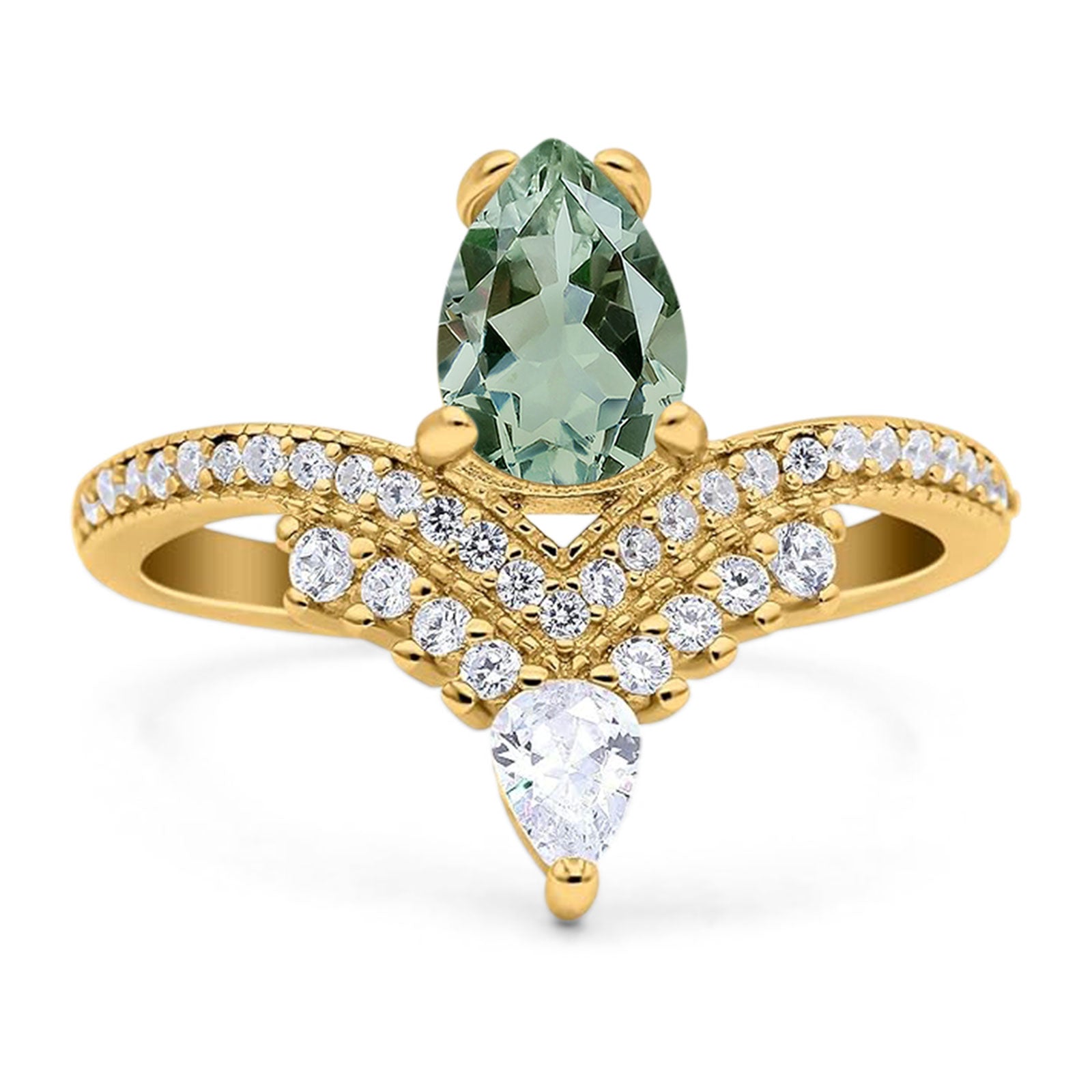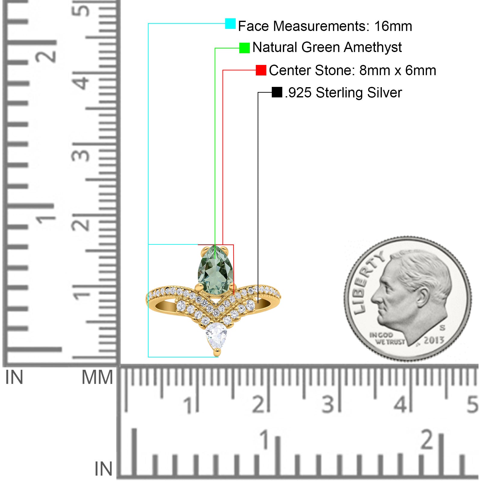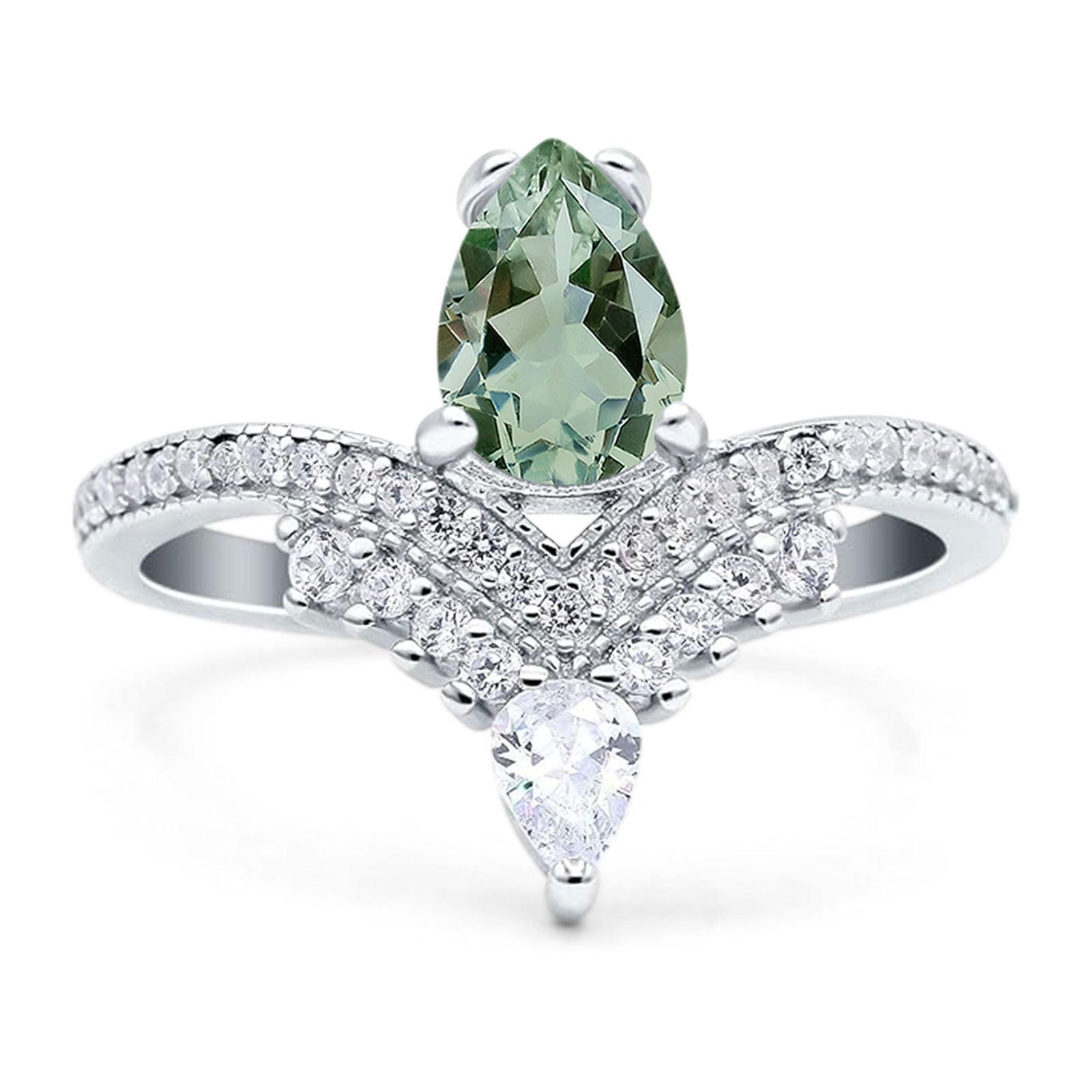 Art Deco Pear Teardrop Natural Green Amethyst Prasiolite Chevron Ring 925 Sterling Silver