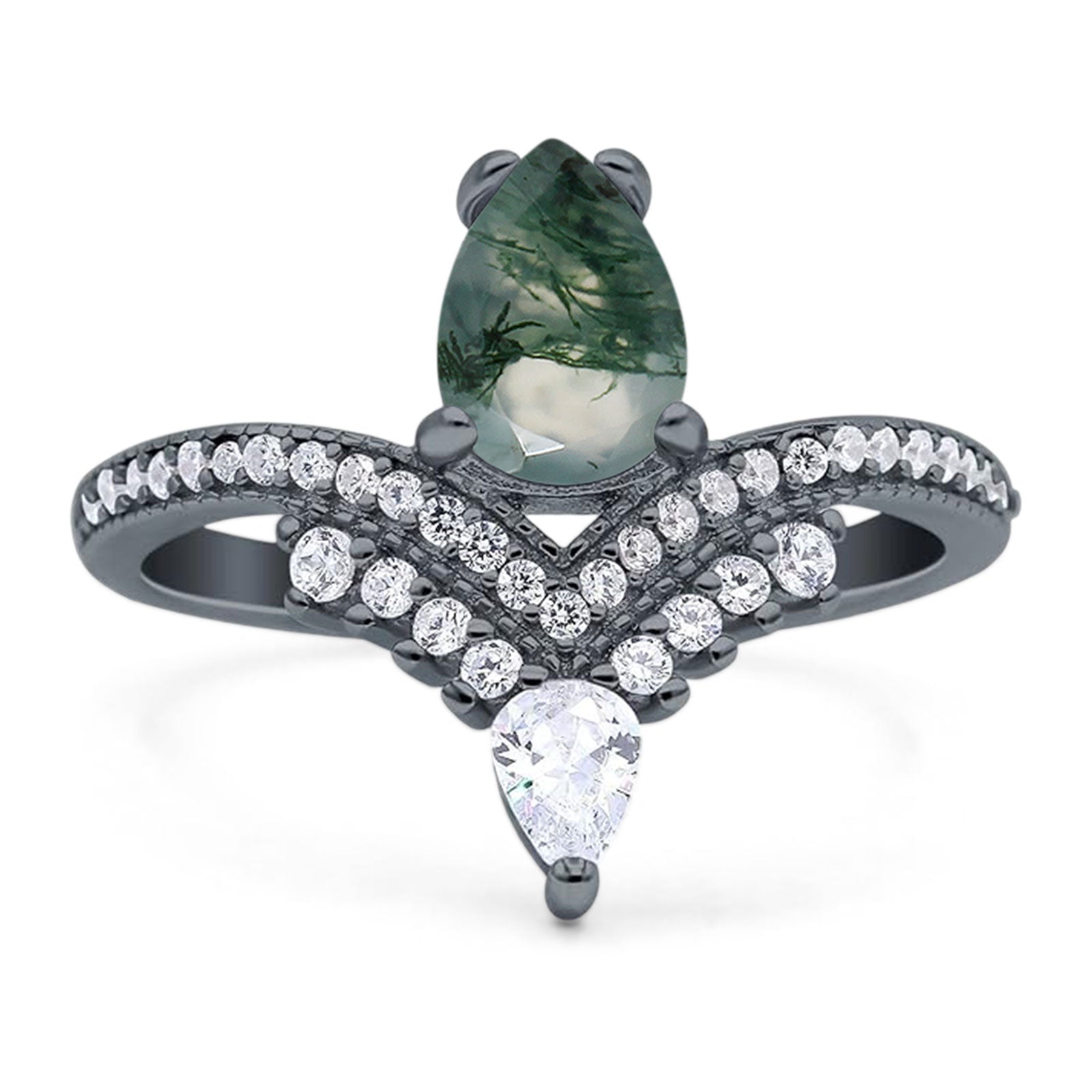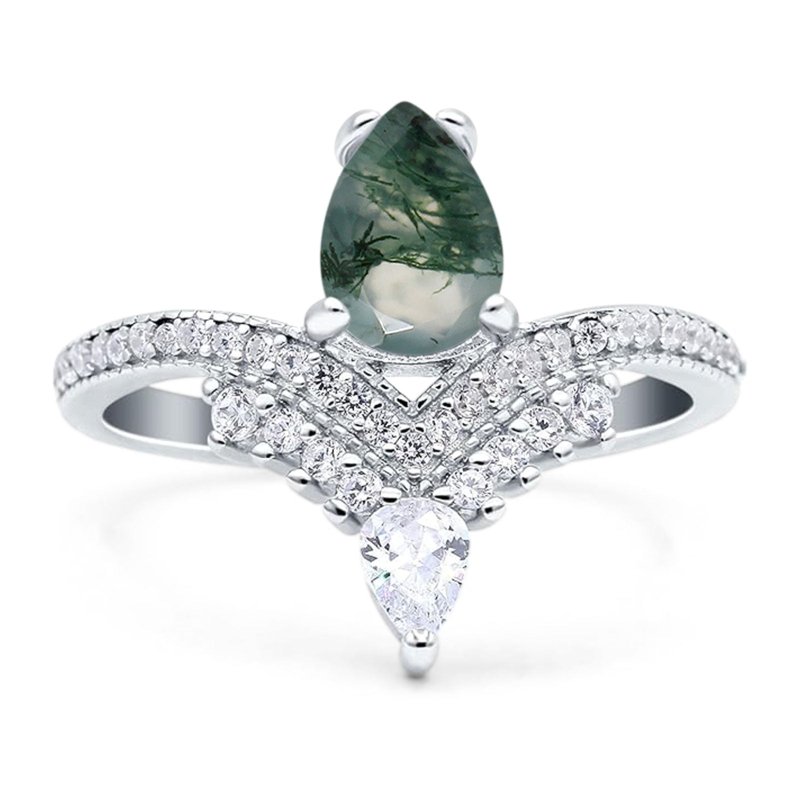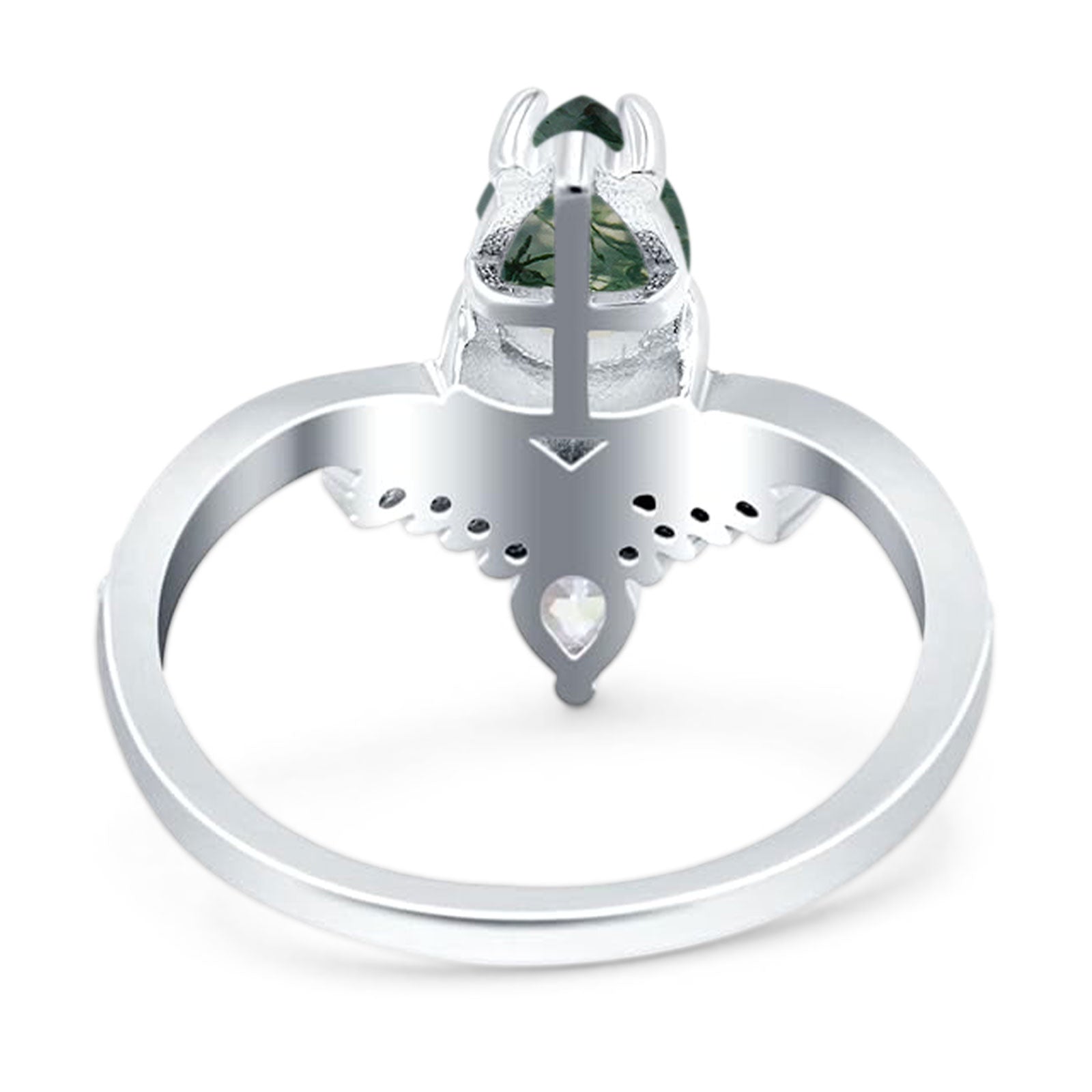 Art Deco Pear Teardrop Natural Green Moss Agate Chevron Ring 925 Sterling Silver