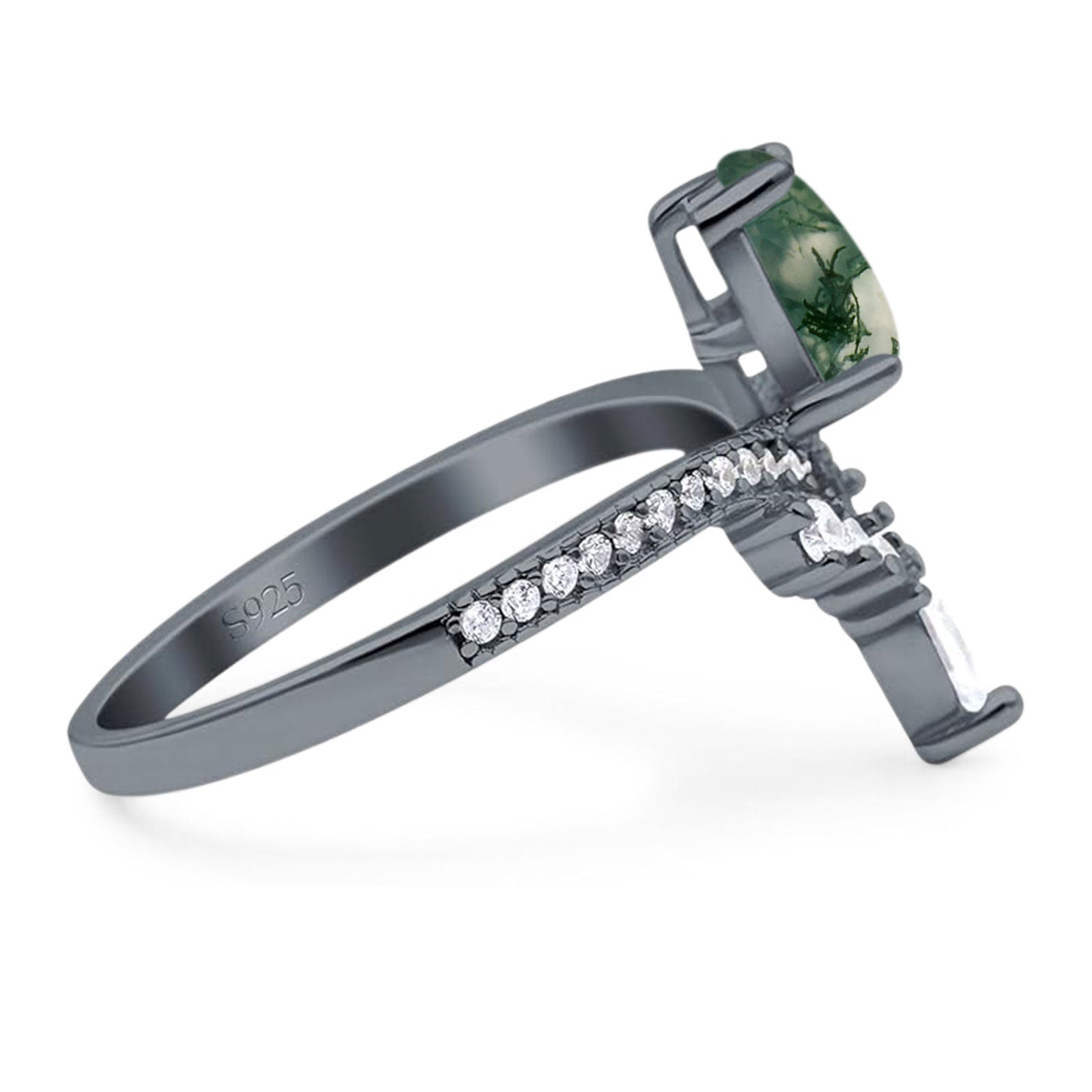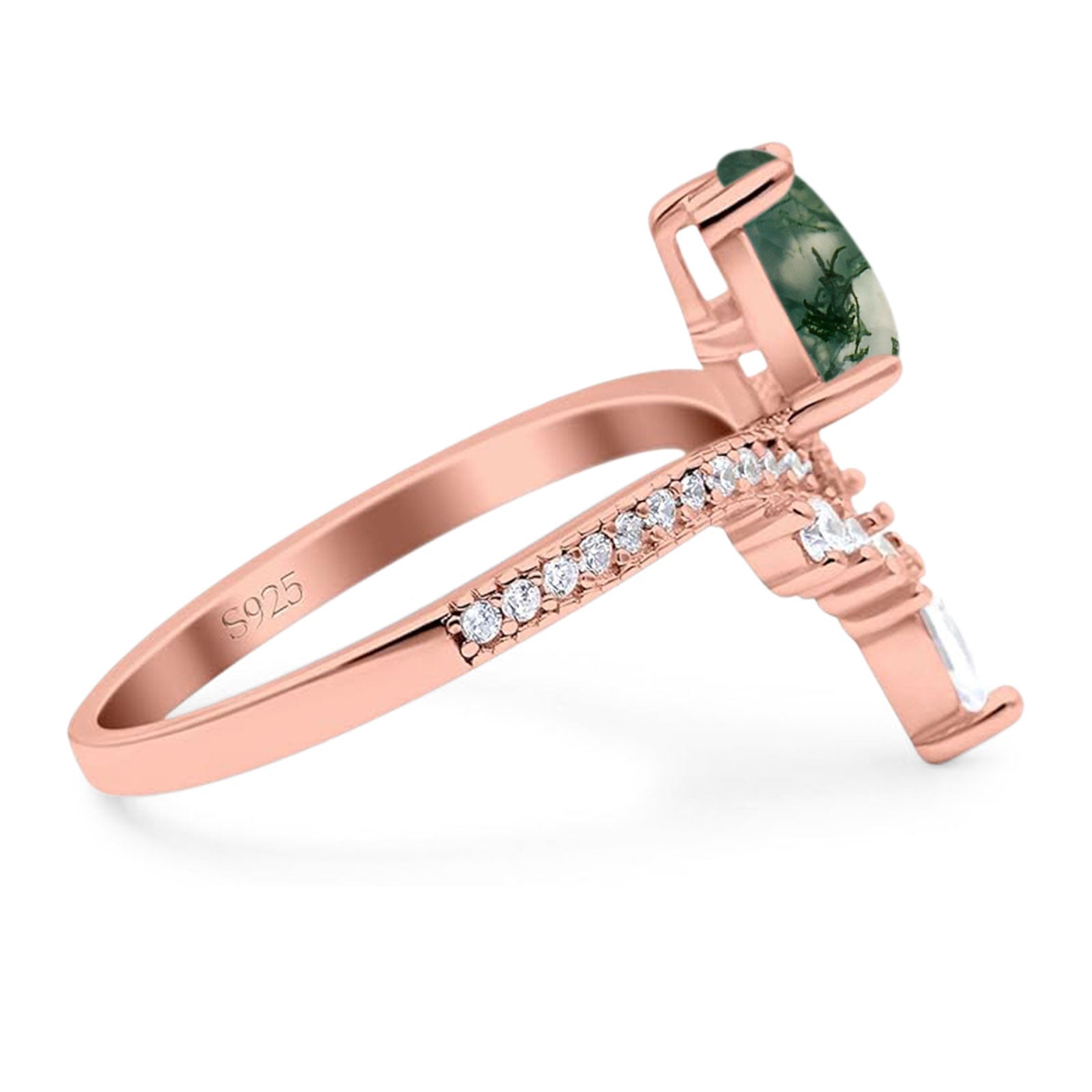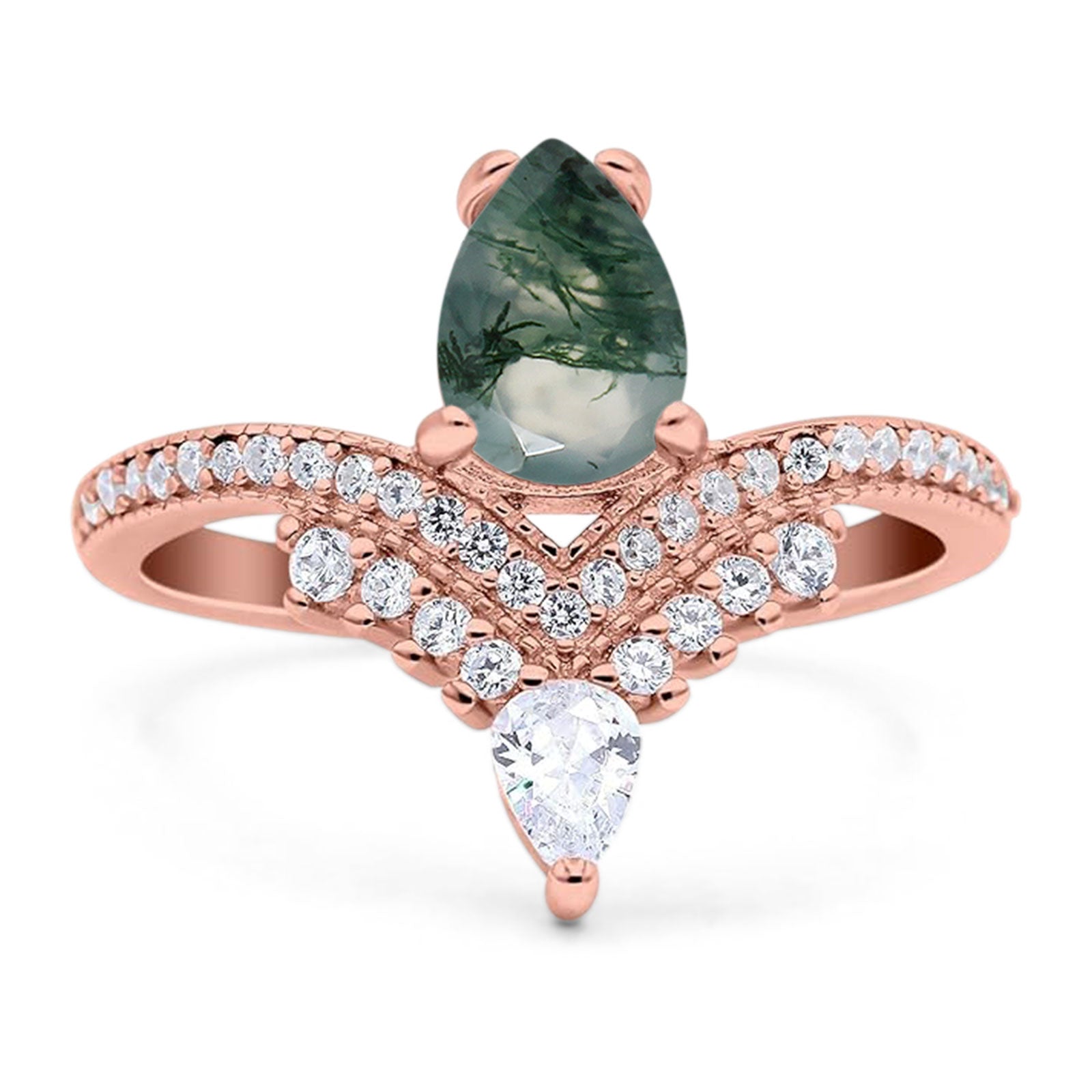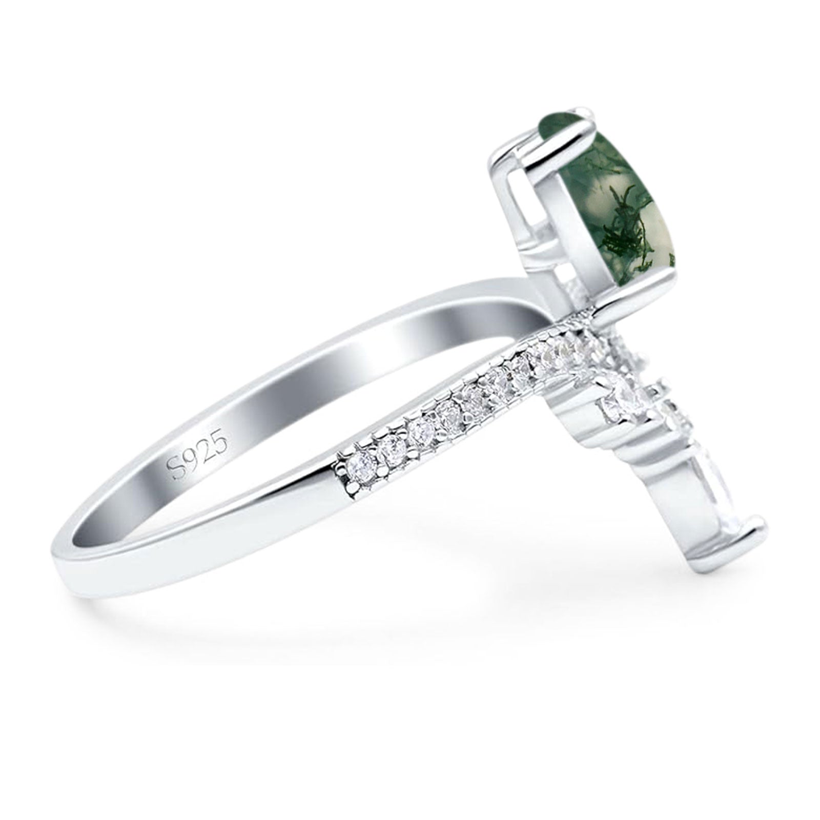 Art Deco Pear Teardrop Natural Green Moss Agate Chevron Ring 925 Sterling Silver