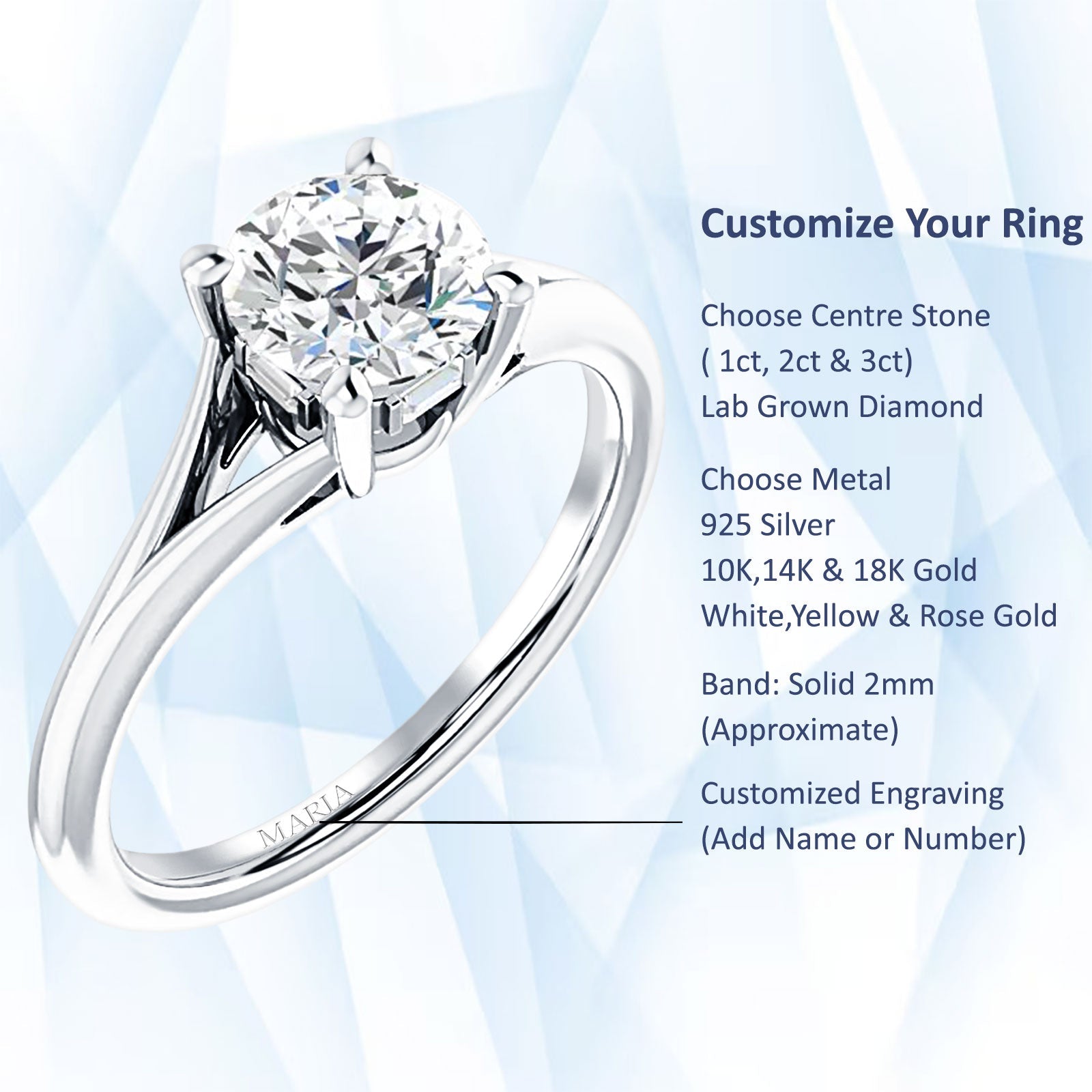 This lab grown diamond ring is available in three different carat weights and also comes in a choice of various metal types.(Tarnish Resistant Sterling Silver, 14K Gold & 18K Gold)