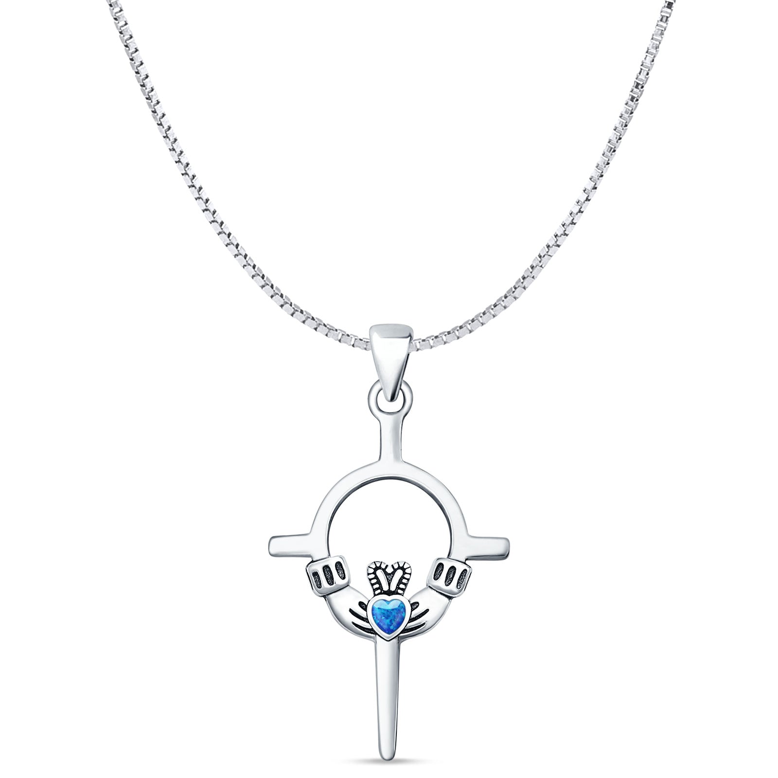 Lab Created Blue Opal Claddagh Pendant Box Chain Necklace 925 Sterling Silver