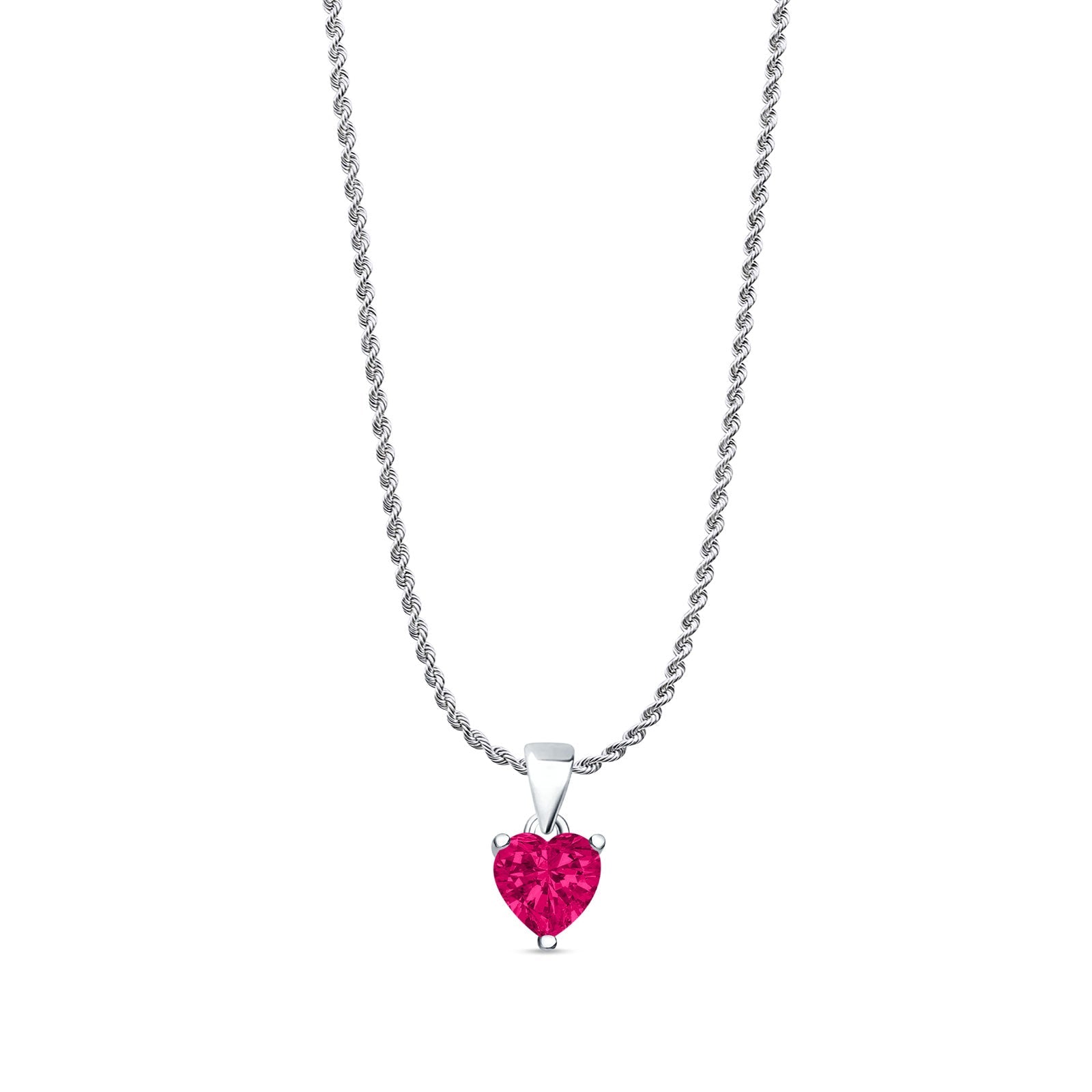 Ruby CZ Heart Pendant Rope Chain Necklace 925 Sterling Silver
