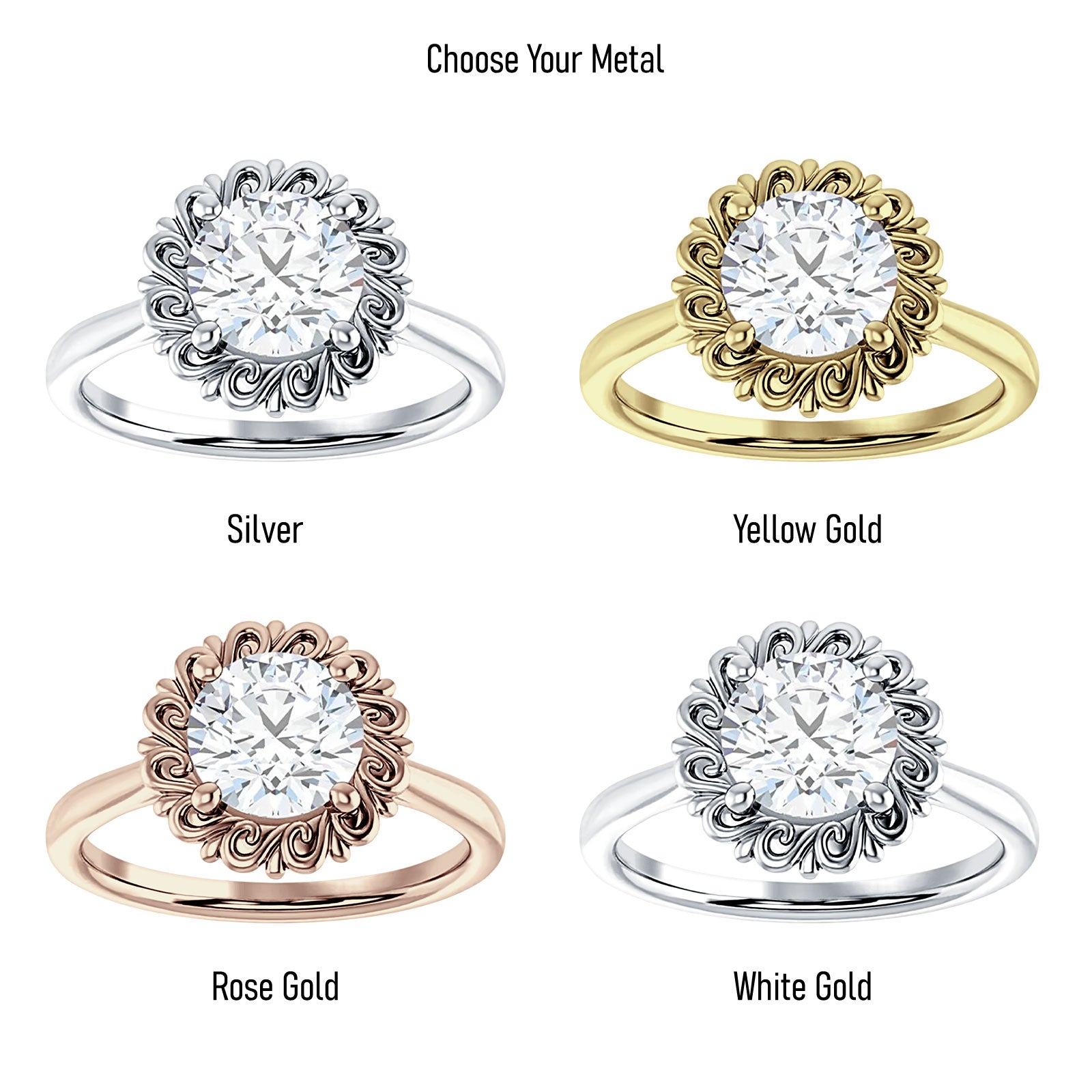 This lab grown diamond ring is available in three different carat weights and also comes in a choice of various metal types.(Tarnish Resistant Sterling Silver, 10K Gold & 14K Gold)