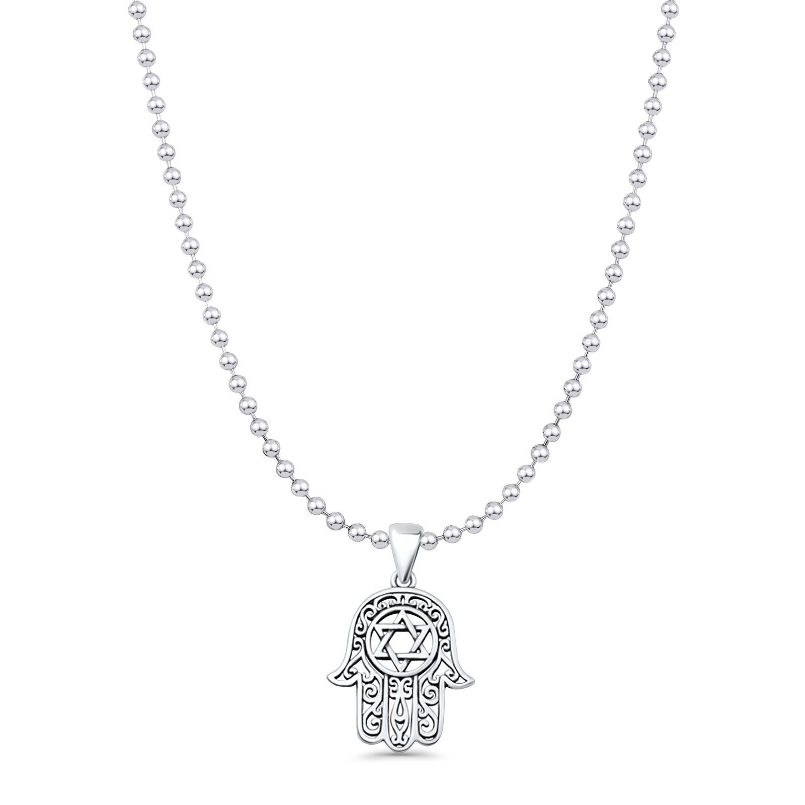 Hamsa & Star Of David Pendant Bead Chain Necklace Oxidized 925 Sterling Silver
