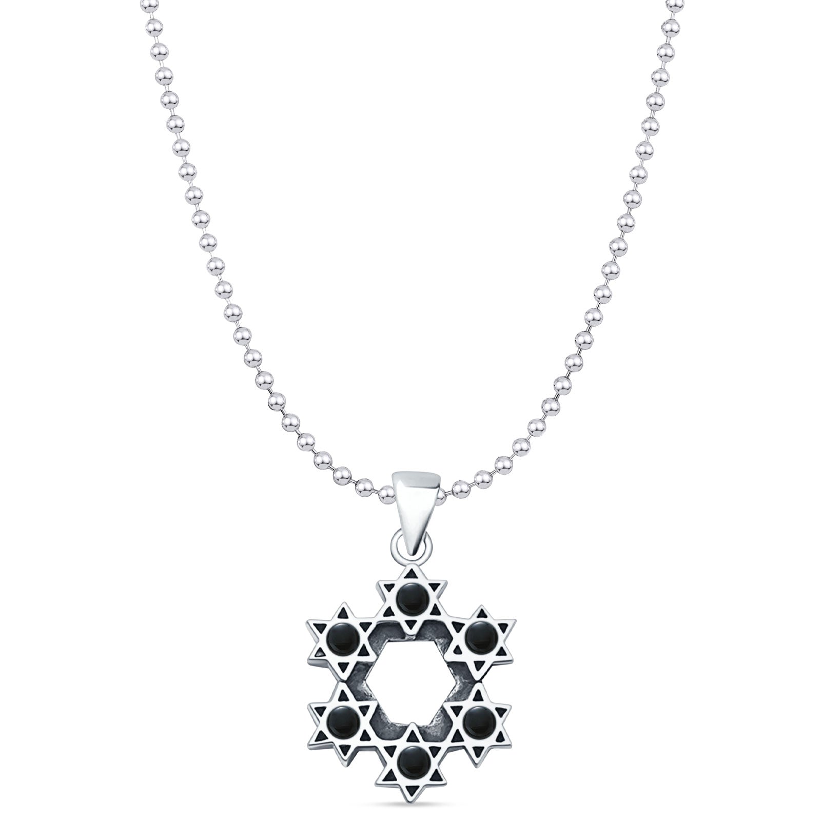 Round Black Onyx Stars Pendant Bead Chain Necklace Oxidized 925 Sterling Silver
